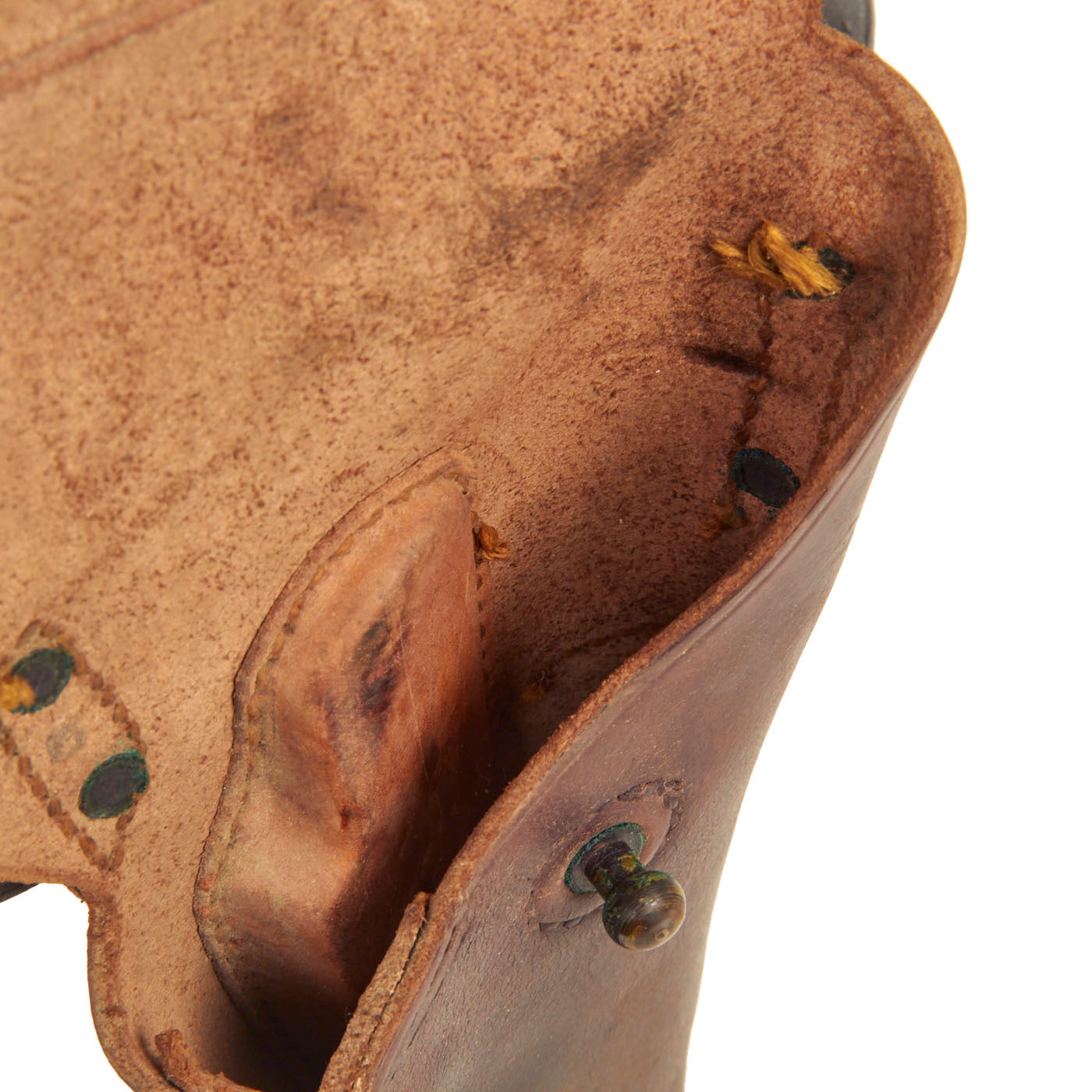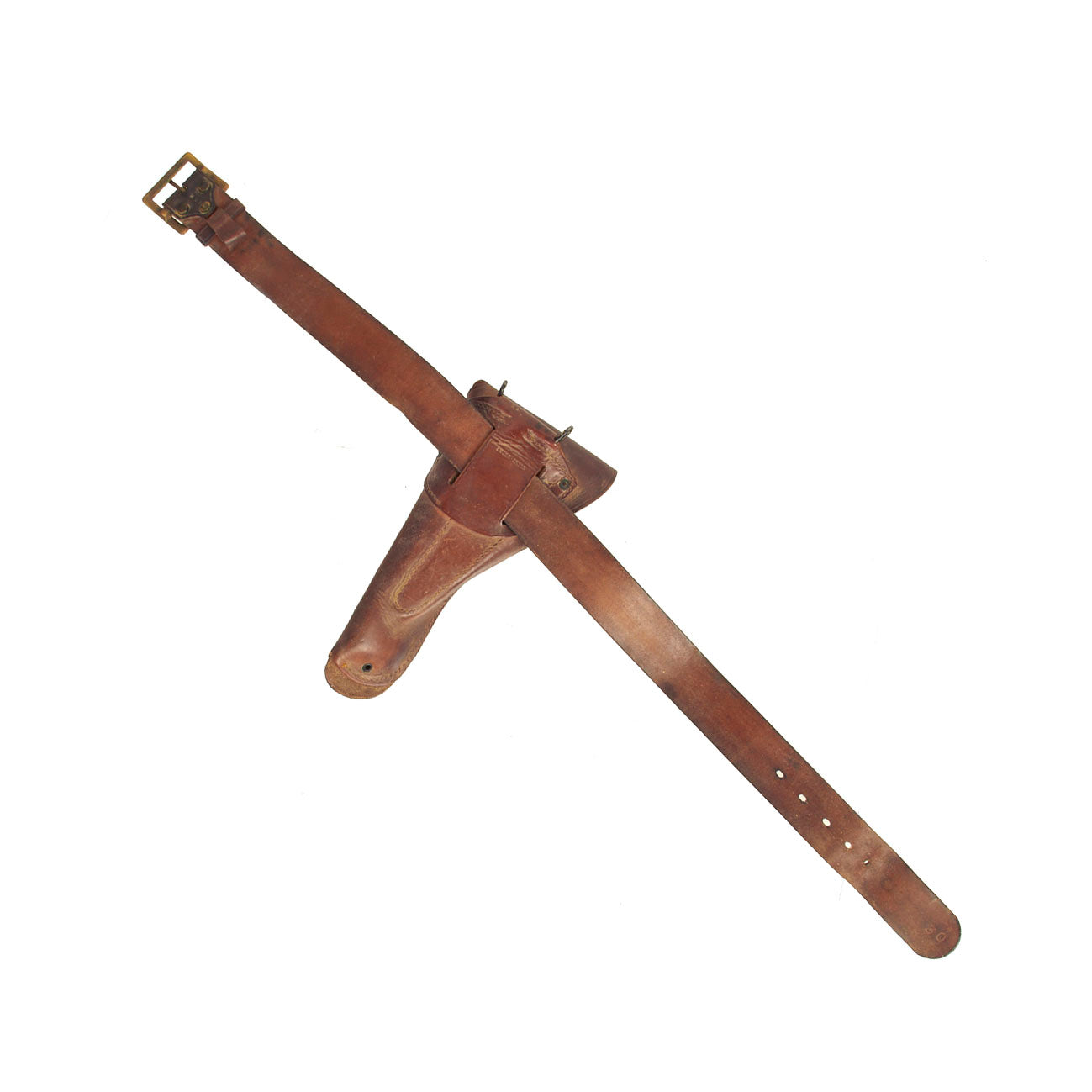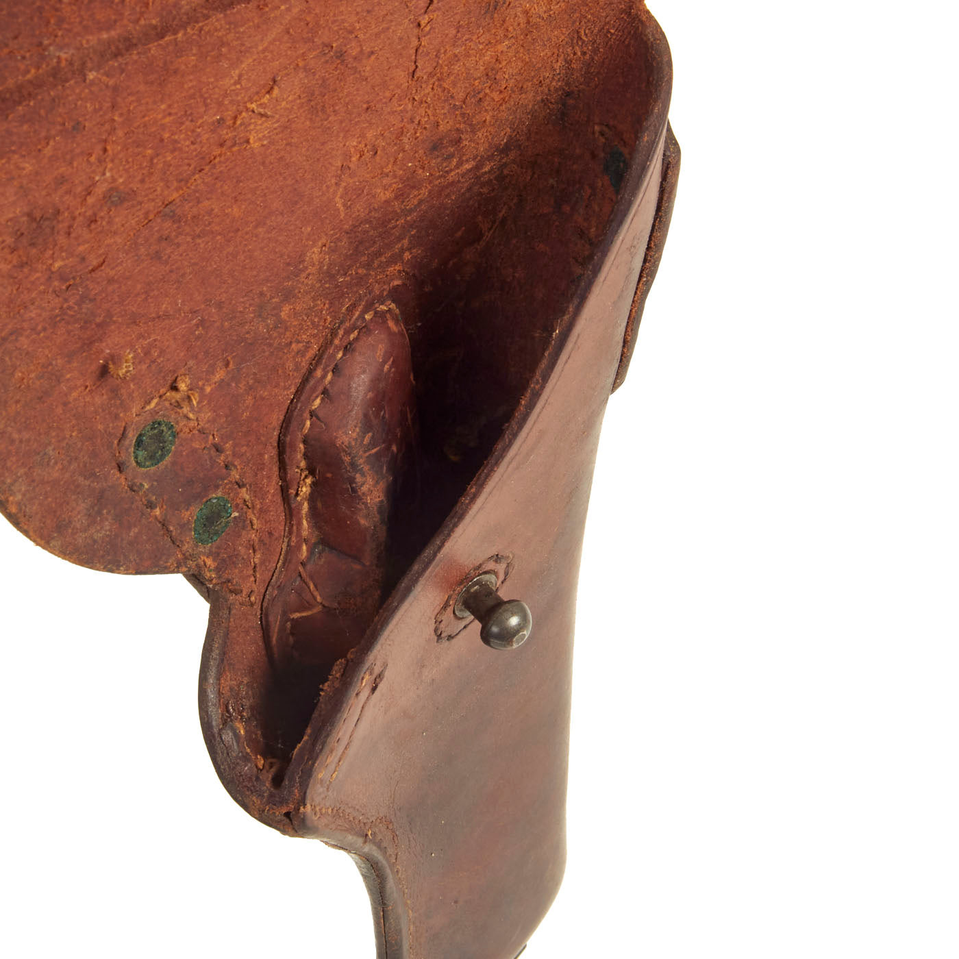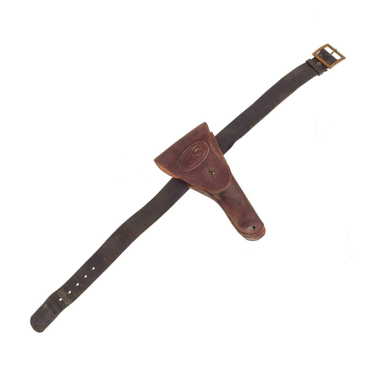 Original Items: Only One Lot of 3 Available. A leather hip holster, the Model 1912, was standardized soon after the M1911’s adoption. This holster had a swivel attachment to make it better adapted to cavalry use. Just before America’s entry into World War I, the Model 1916 holster was adopted, which differed from the M1912 primarily in the deletion of the swivel feature. Both were fitted with wire hooks that attached to the grommets on the bottom of the standard webbed pistol belt or cartridge belt. There were sufficient numbers of World War I M1916 holsters to meet the demand until the U.S. became actively involved in World War II. The M1916 holster was put back into production and almost 3 million were made by 18 different commercial firms between 1941 and 1945. These holsters were embossed with a large “U.S.” on the cover flap, with the name of the maker and year of production on back.