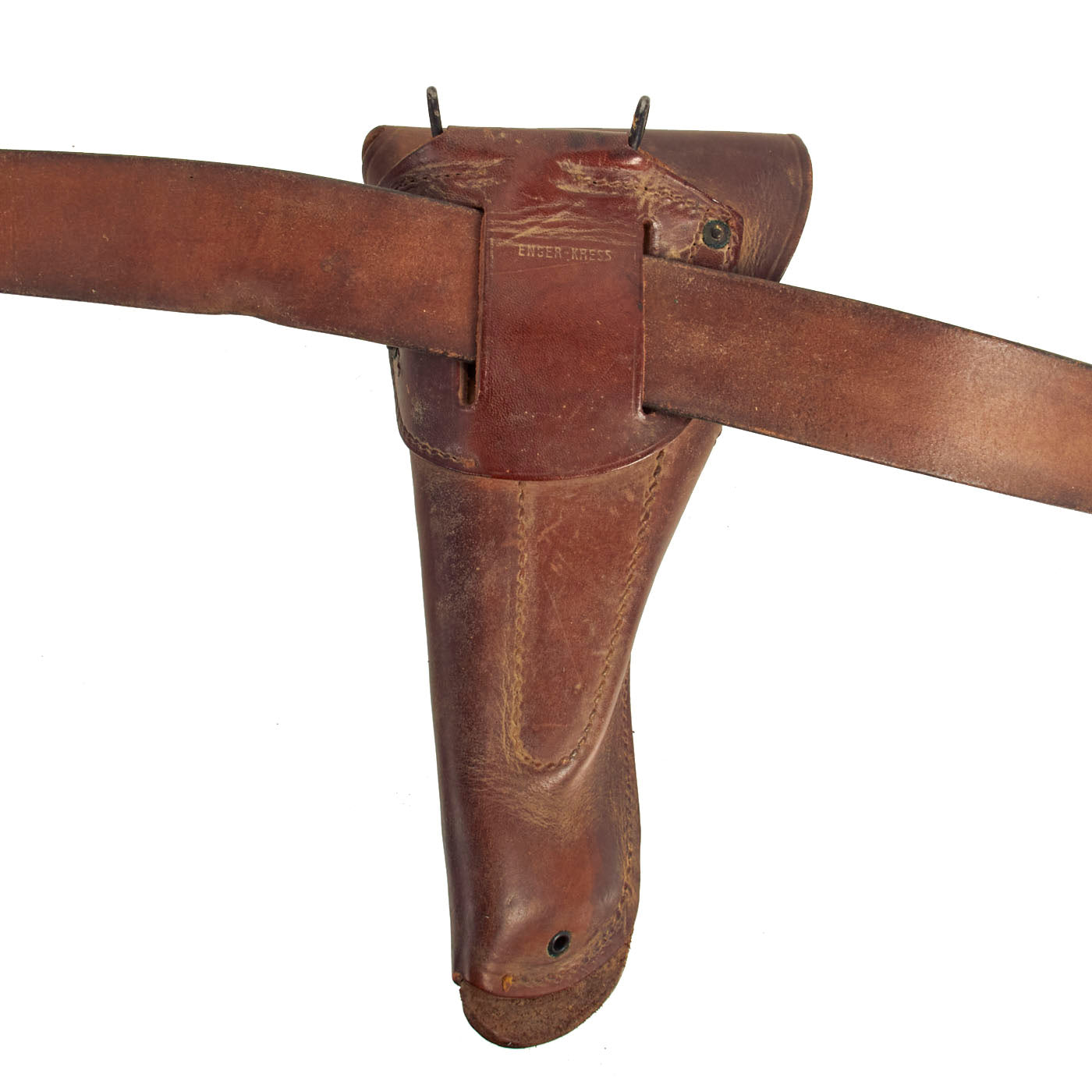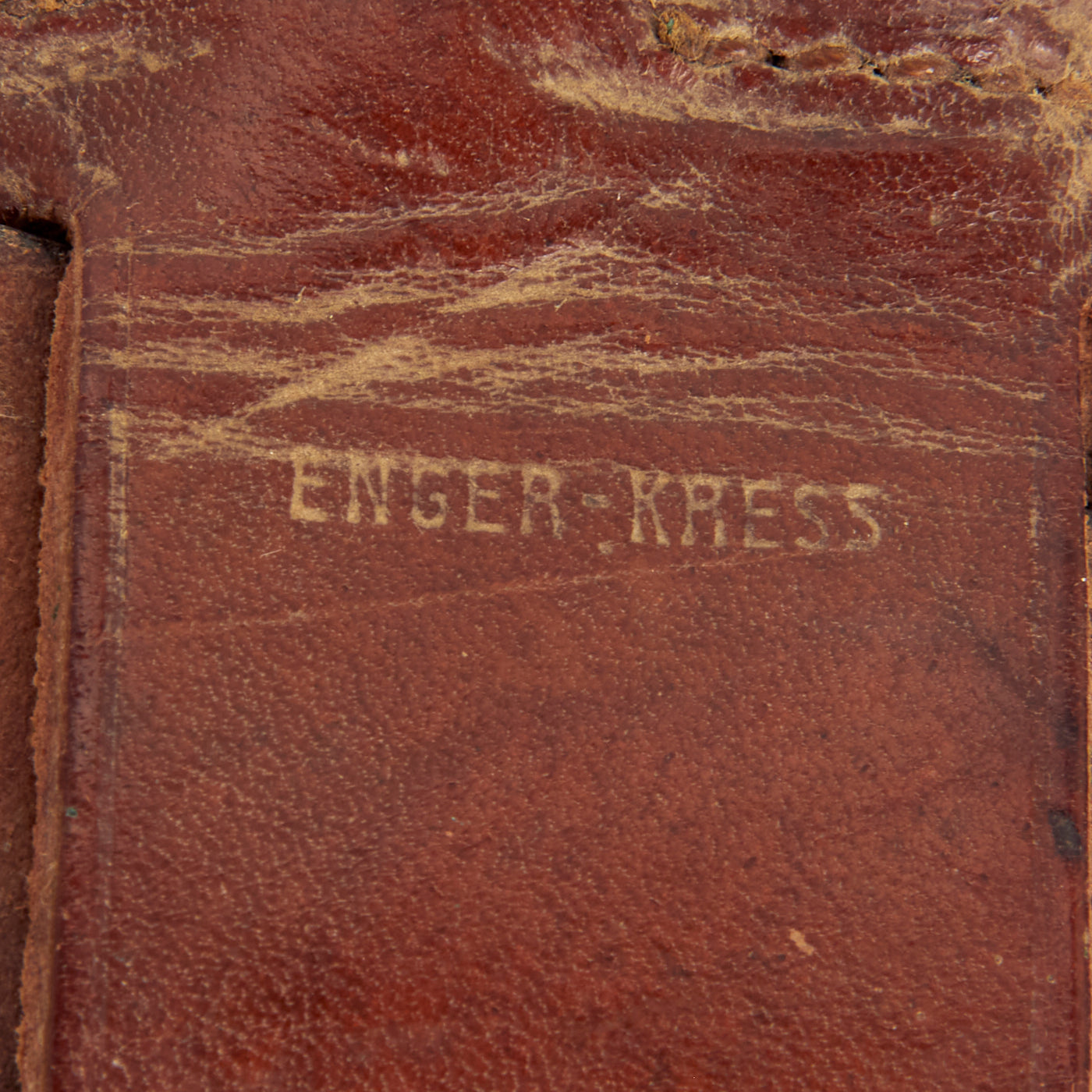 - Enger-Kress Holster With Belt (Undated): The holster is in lovely serviceable condition with an equally serviceable leather belt to complete the ensemble. Enger-Kress was founded by two men, George Enger and August Kress. Both men were born in Germany. Enger had learned the leather trade and Kress, the mercantile business in their homeland before coming to America. During WWII, Enger-Kress manufactured 800,000 pistol holsters, 500,000 machine gun cases, 1.7 million helmet liners, and 1.3 million helmet chin straps. The company finally closed in 2006 having succumbed to foreign products flooding the marketplace.