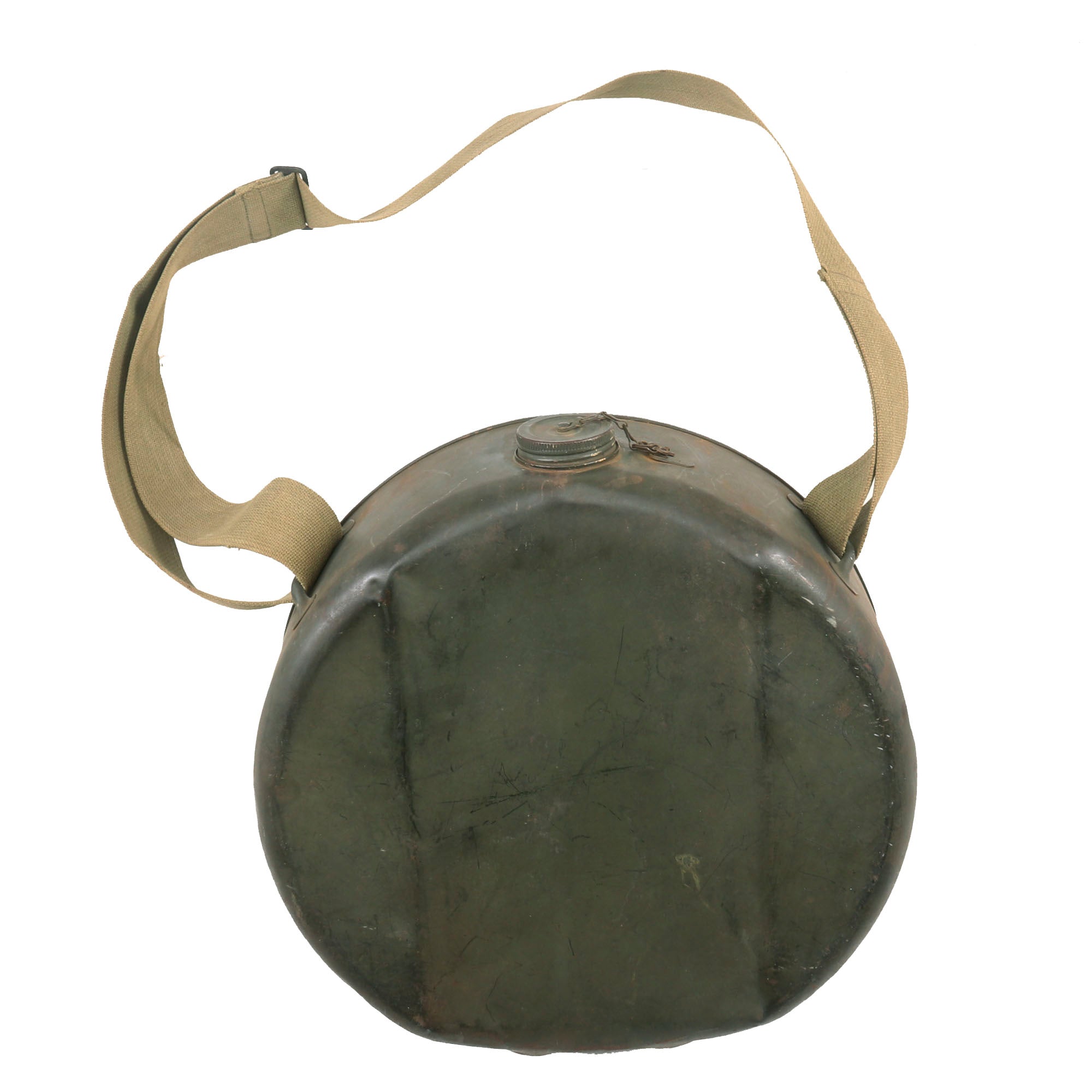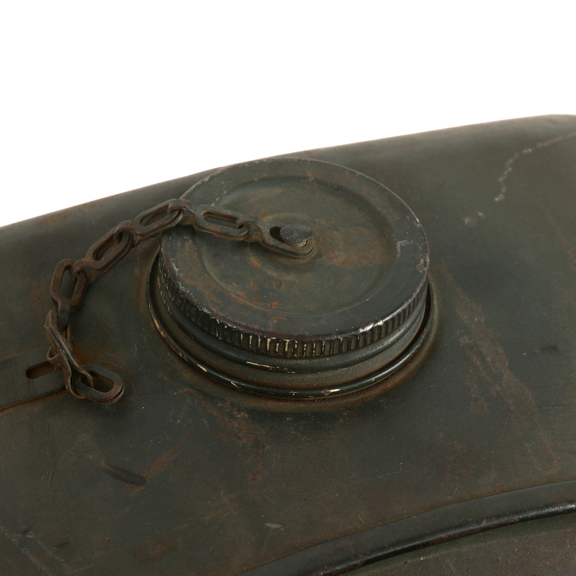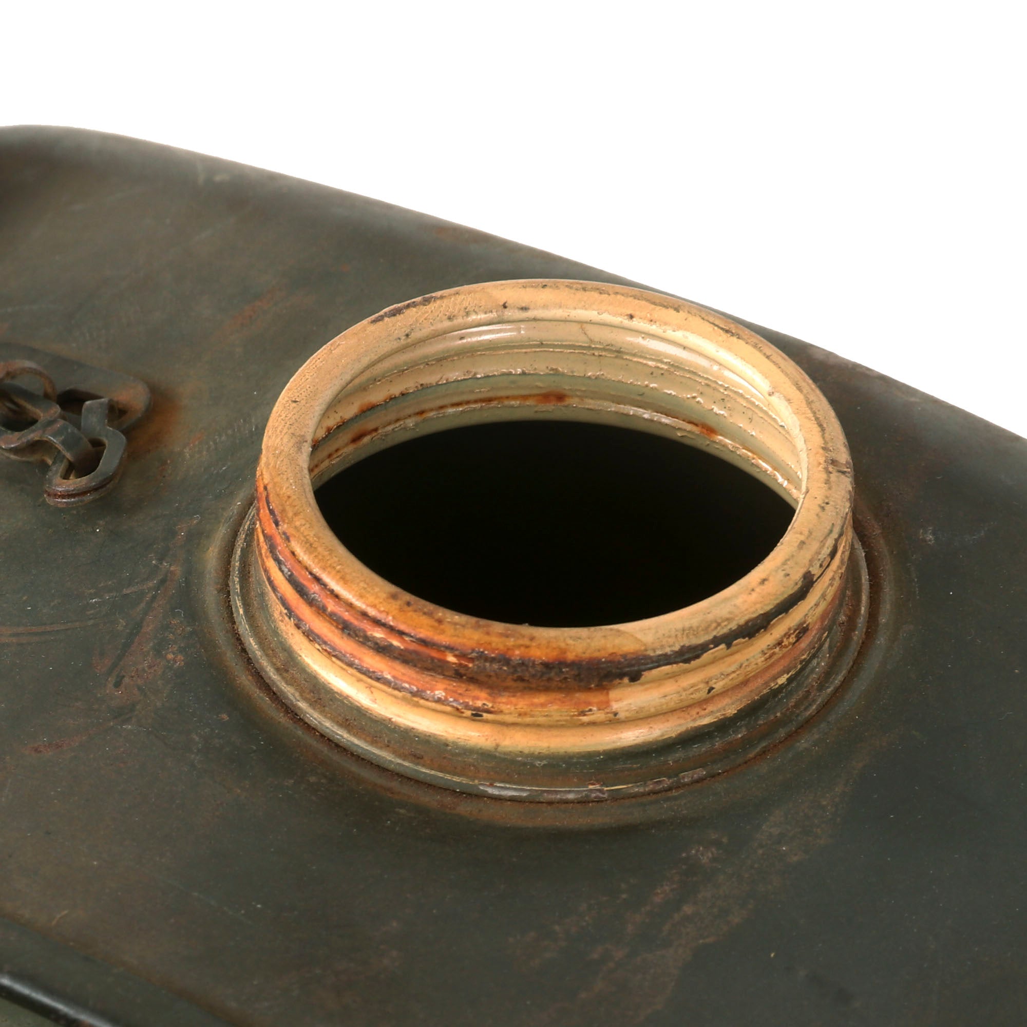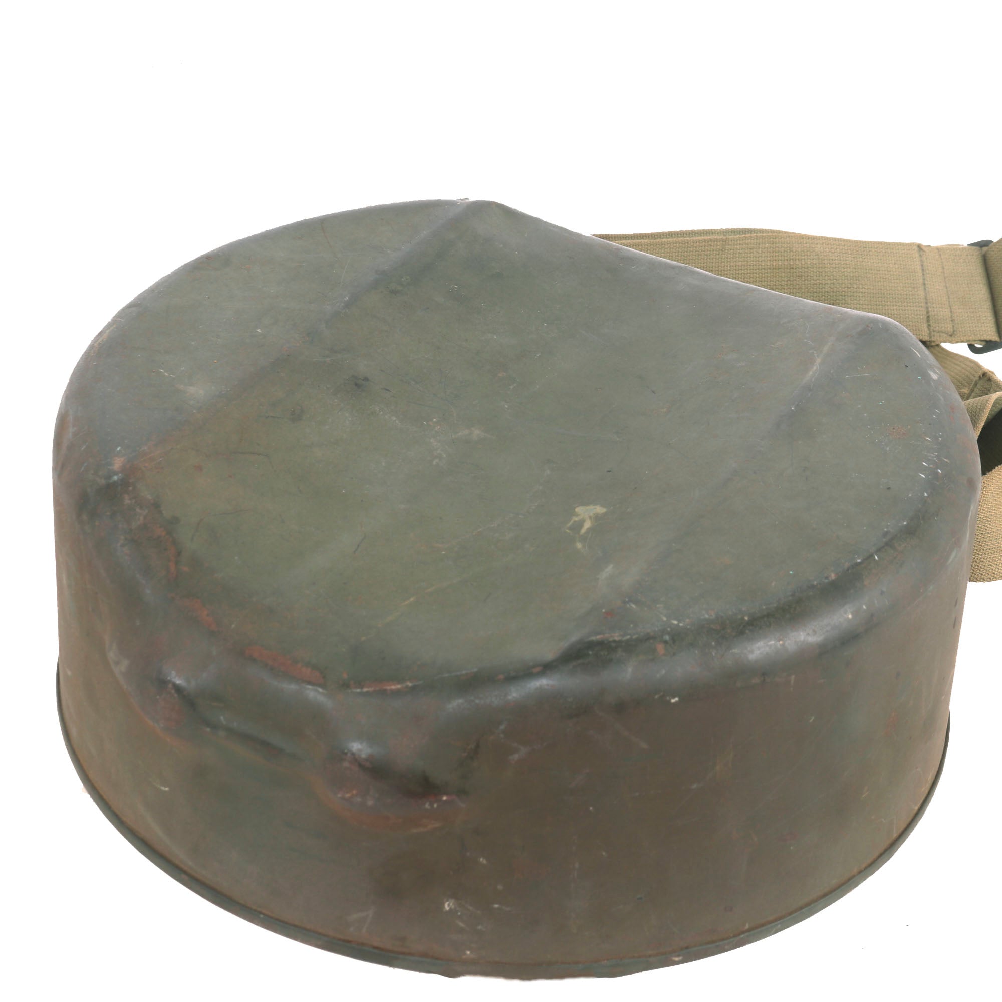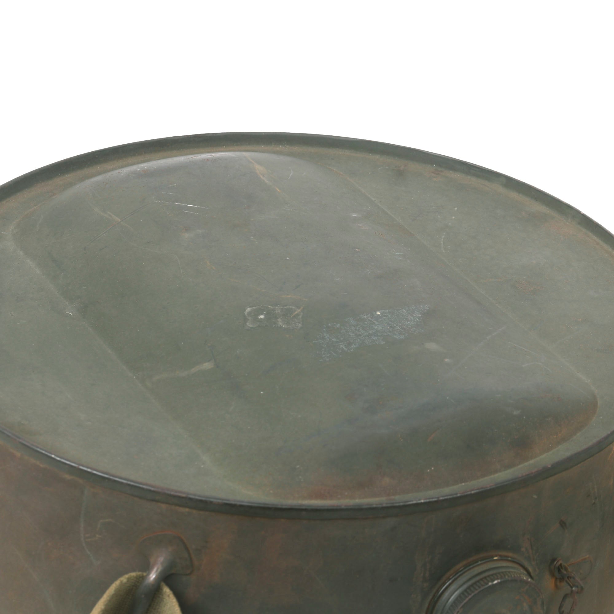 Original Item: Only One Available. This is a World War Two large round water can which had multiple uses but was notably used for the Model 1917 Machine Gun as a water condensing can and to transport fresh cool water to machine guns to prevent the barrels from overheating. It is steel construction and measures 13 inches in diameter and 5 inches wide.