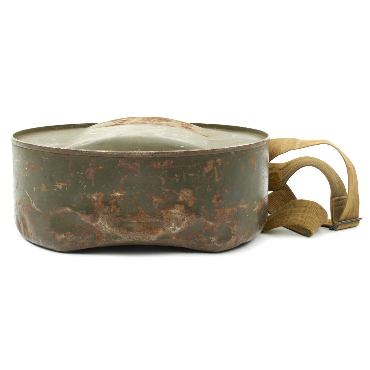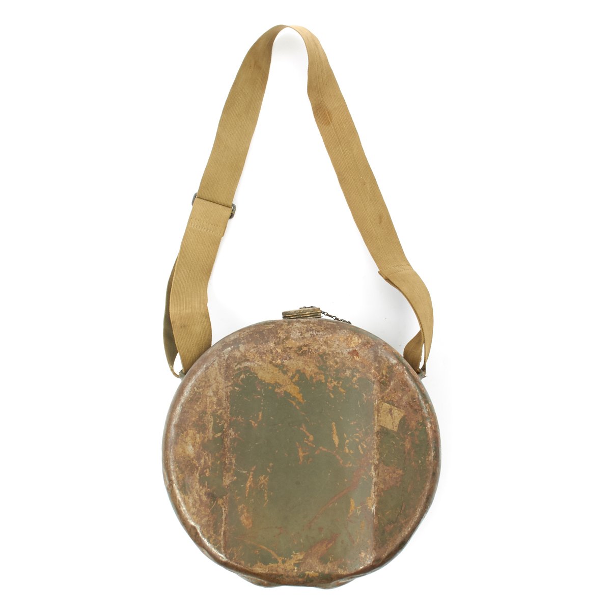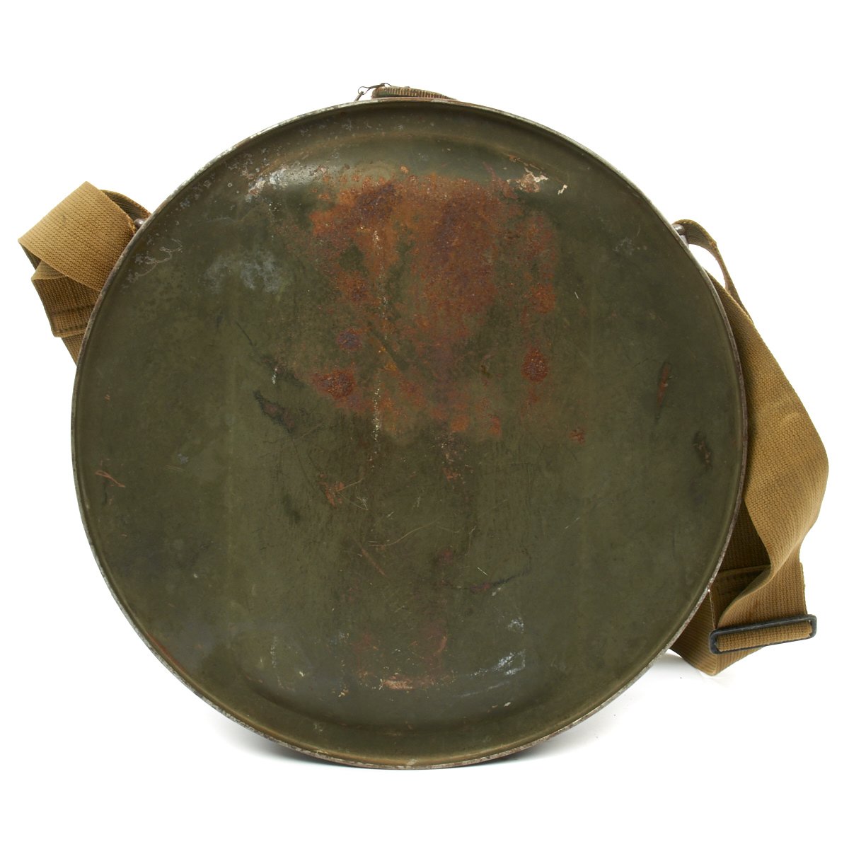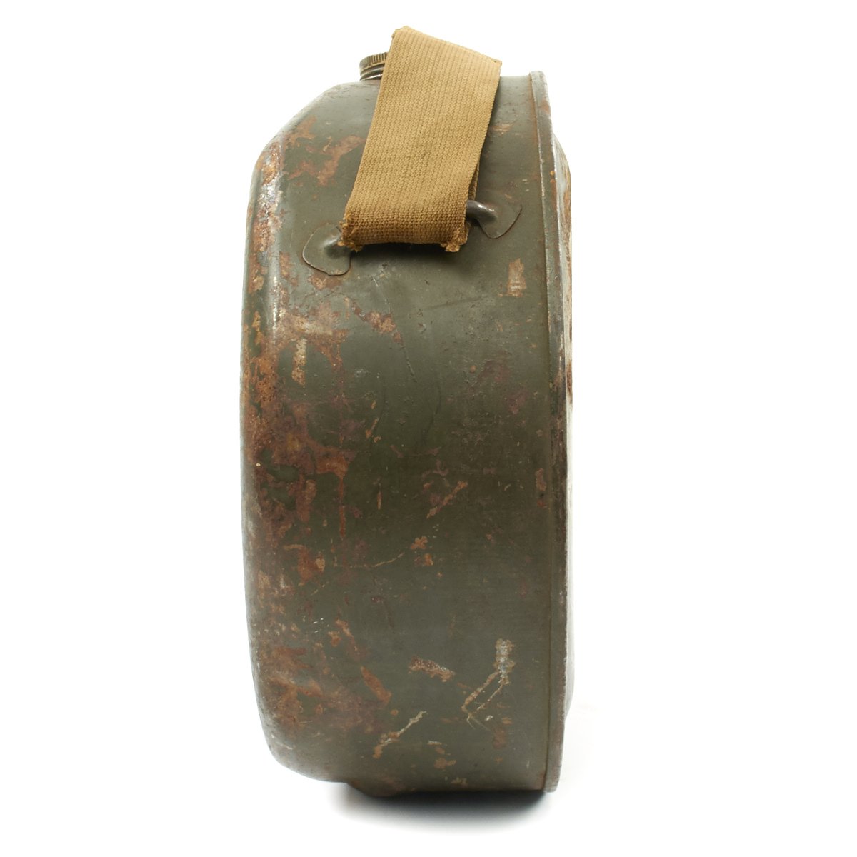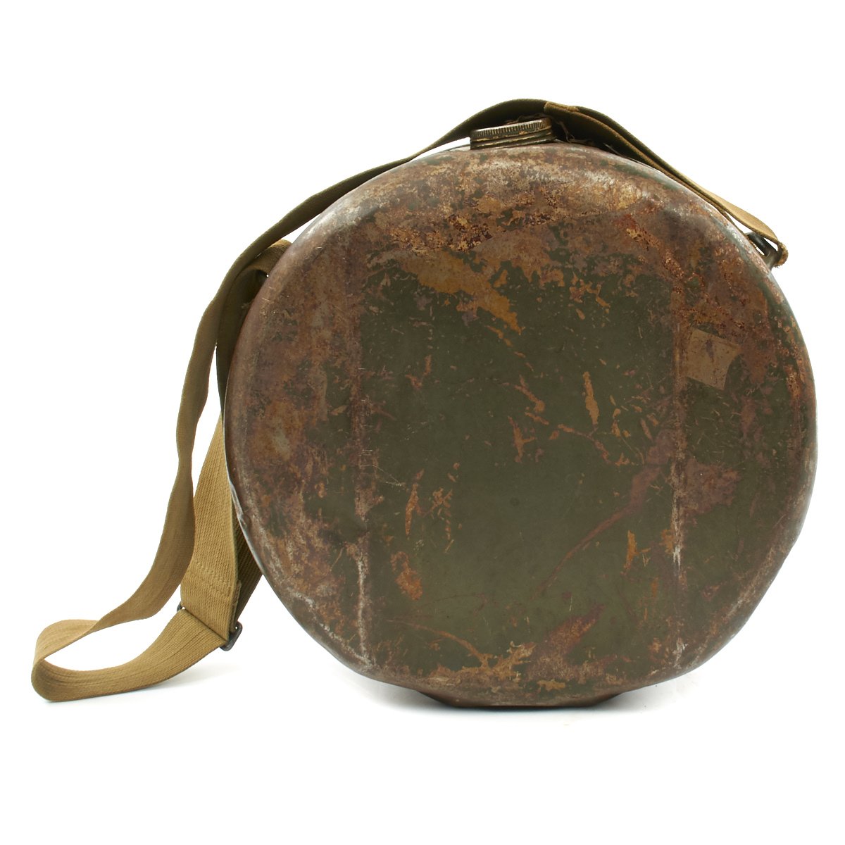 • Original Item: Only One Available. This is a World War Two large round water can which had multiple uses but was notable used for the Model 1917 Machine Gun as a water condensing can and to transport fresh cool water to machine guns to prevent the barrels from overheating. It is steel construction and measures 13 inches in diameter and 5 inches wide. It comes complete with the original khaki web canvas carry strap. Offered in very good condition. You don't see these often, in fact one can be seen in use at this link.