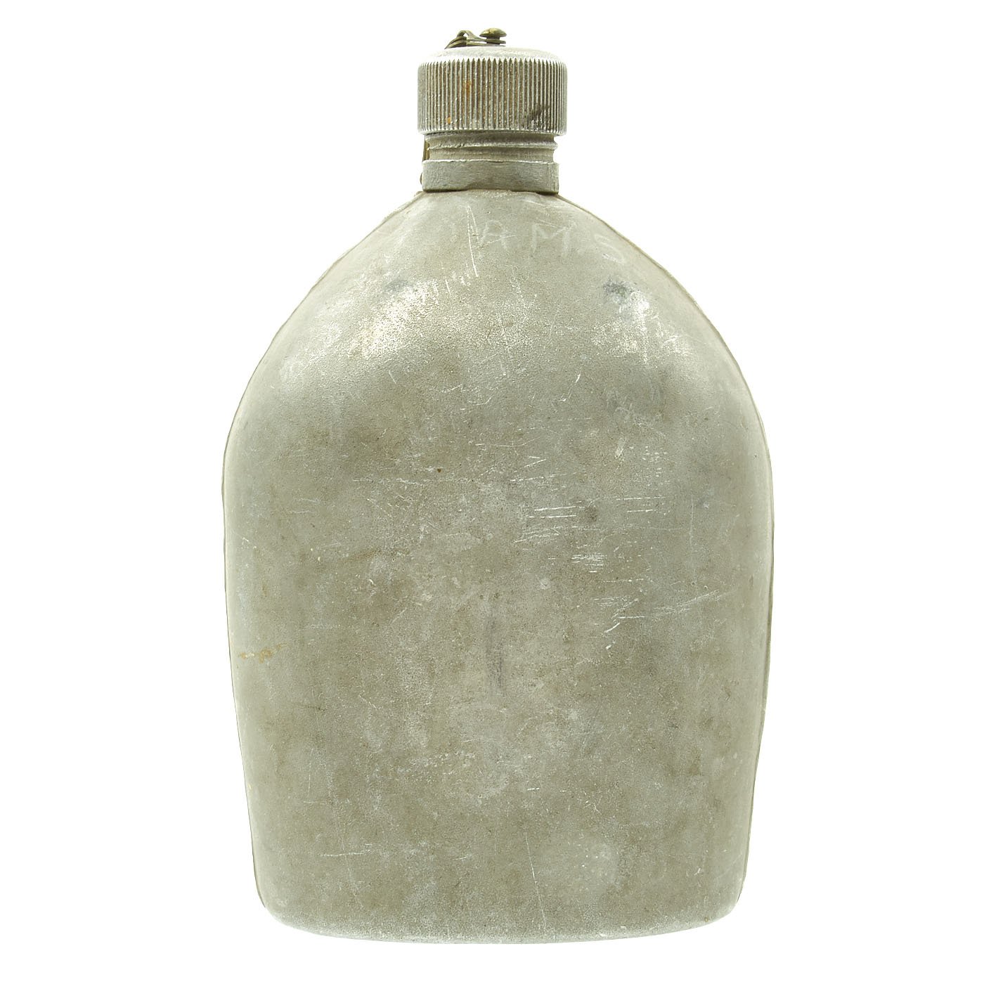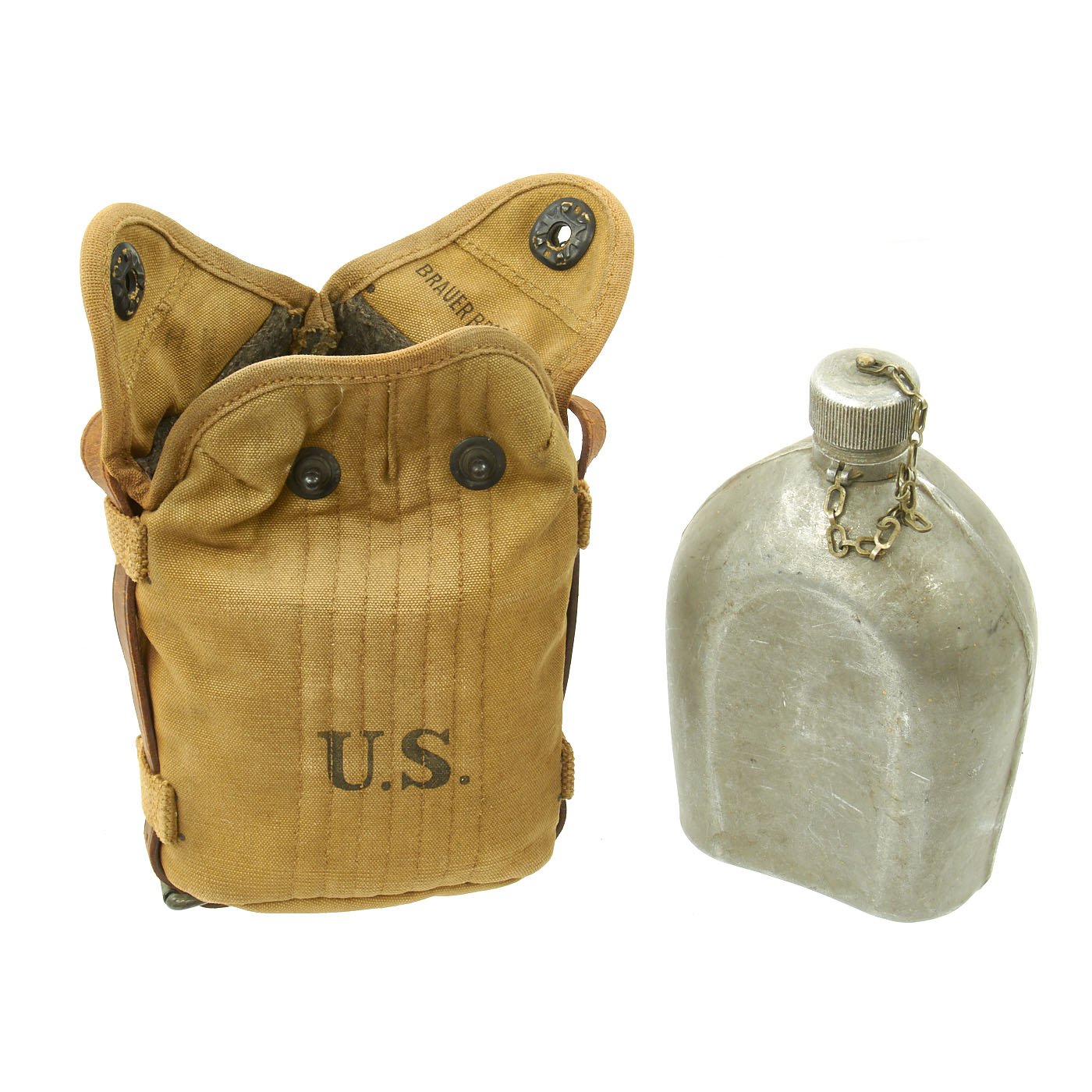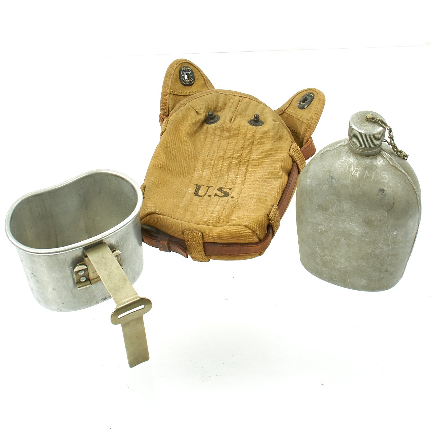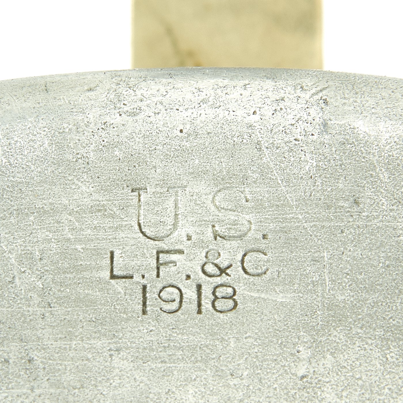 This example is in excellent condition, and looks to have seen only light use during its service life. The canteen and cup are both fully non magnetic, made of mostly aluminum, while the handle for the cup looks to be a nickel alloy. Both are marked and dated U.S. / L.F.&C. / 1918, for the Landers, Frary & Clark company of New Britain, CT. This company manufactured a multitude of items, including trench knives, for the military. Both are in great shape, with a bit of personalized markings. There are a few small dents on the canteen. The cap is present, with the original cork, and securing chain intact.