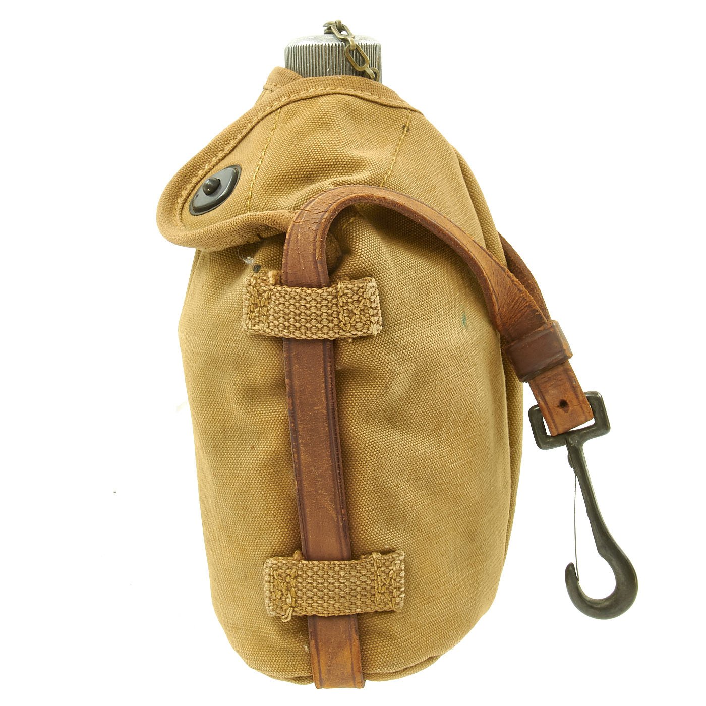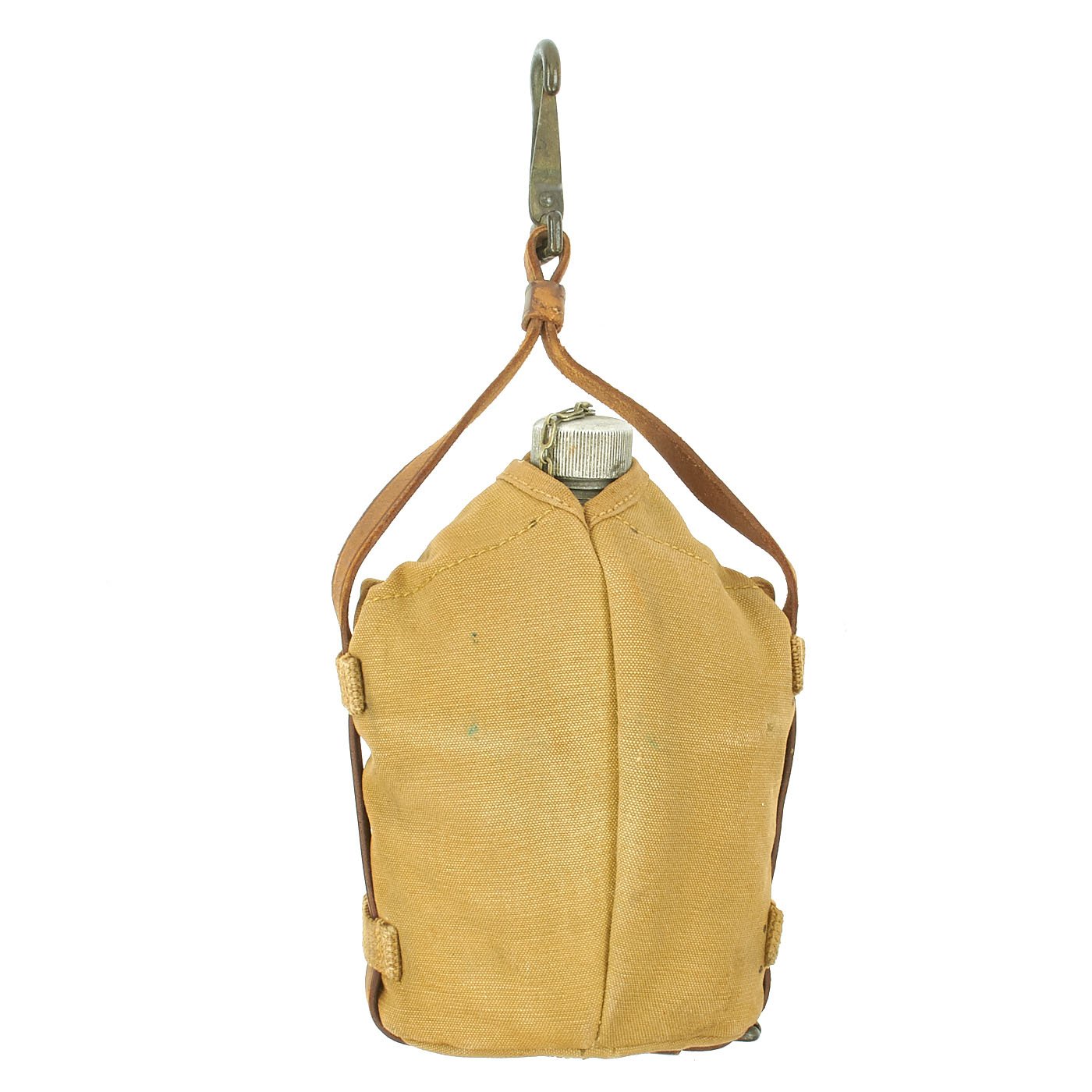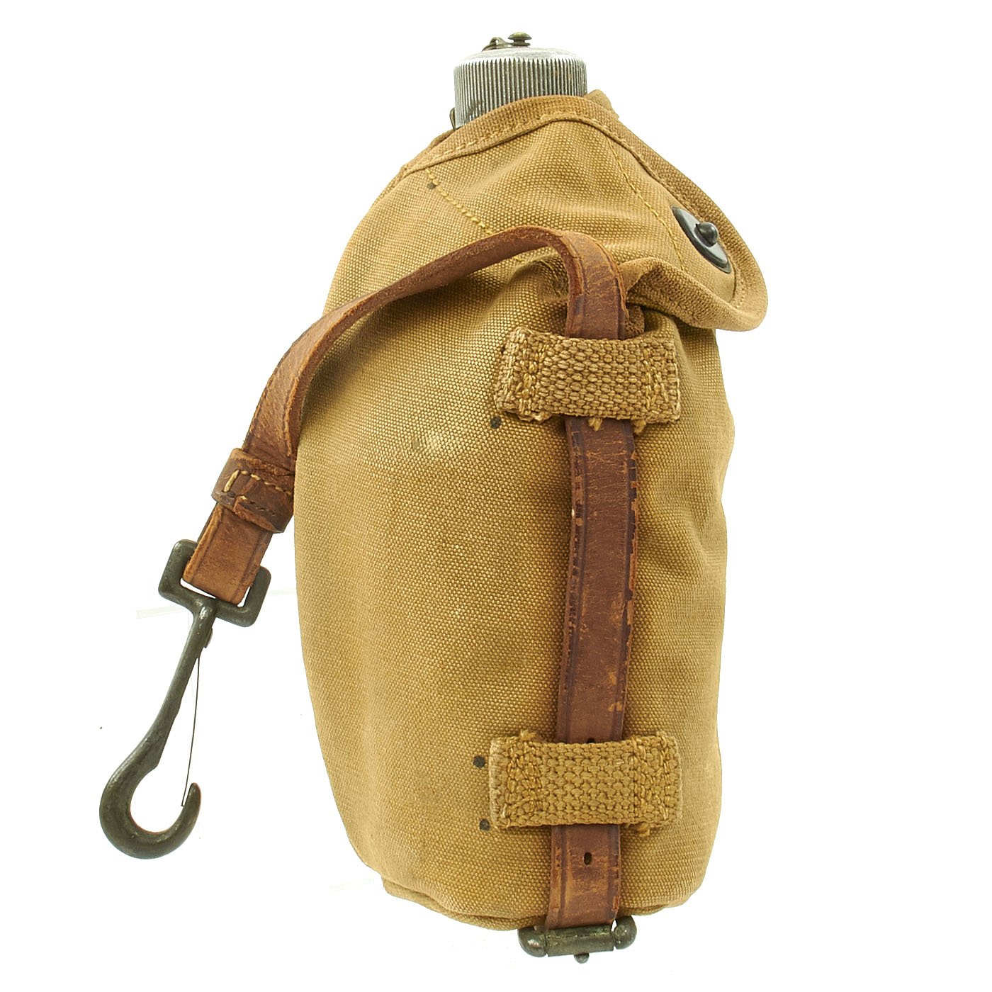 The design used the standard M1910 canteen water bottle and up, and paired them with a different style carrier. Instead of having belt clips on the back, the carrier has a leather strap that goes around the outside of the canteen, with a steel spring clip on top. 5 canvas retaining loops hold the strap to the canteen, and it would be attached to whatever part of the horse's tack that the soldier desired.