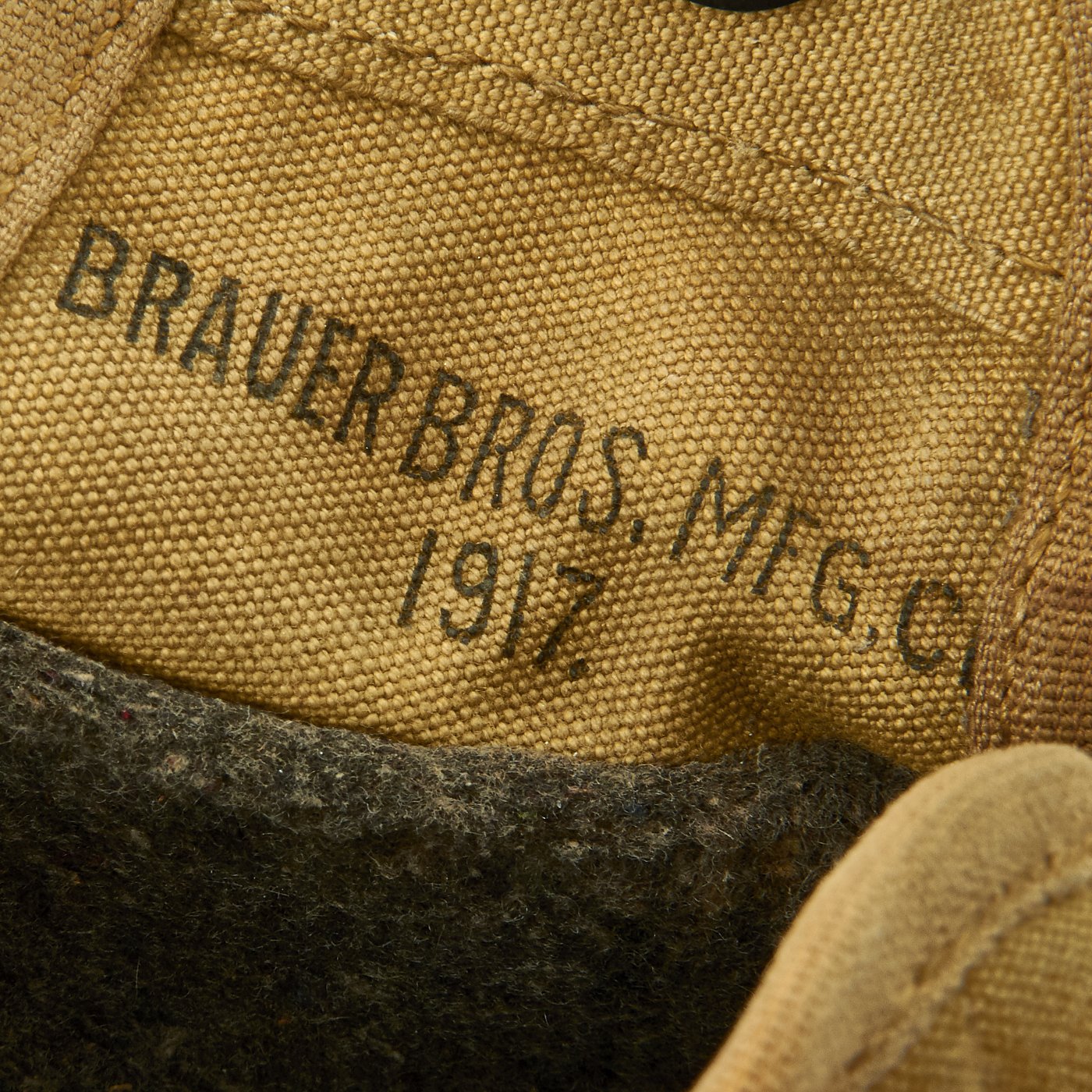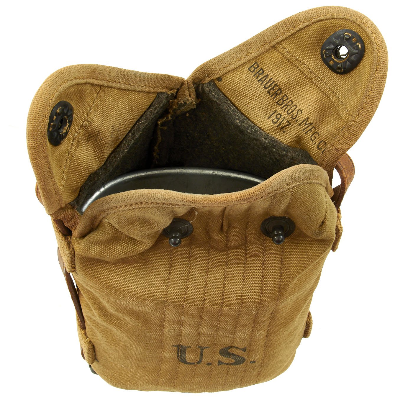 The carrier is really in great shape, and is maker marked BRAUER BROS. MFG. CO. / 1917. on the underside of the left side flap. The interior felt lining is retained very well, with no mothing or other insect damage. The snaps still have almost all of their original blacked brass finish, and the outer shell shows only light storage wear. The leather strap is also in good shape, though it has degraded somewhat, being over a century old. There is some cracking and surface dry rot, but nothing out what is expected for an item of this age.