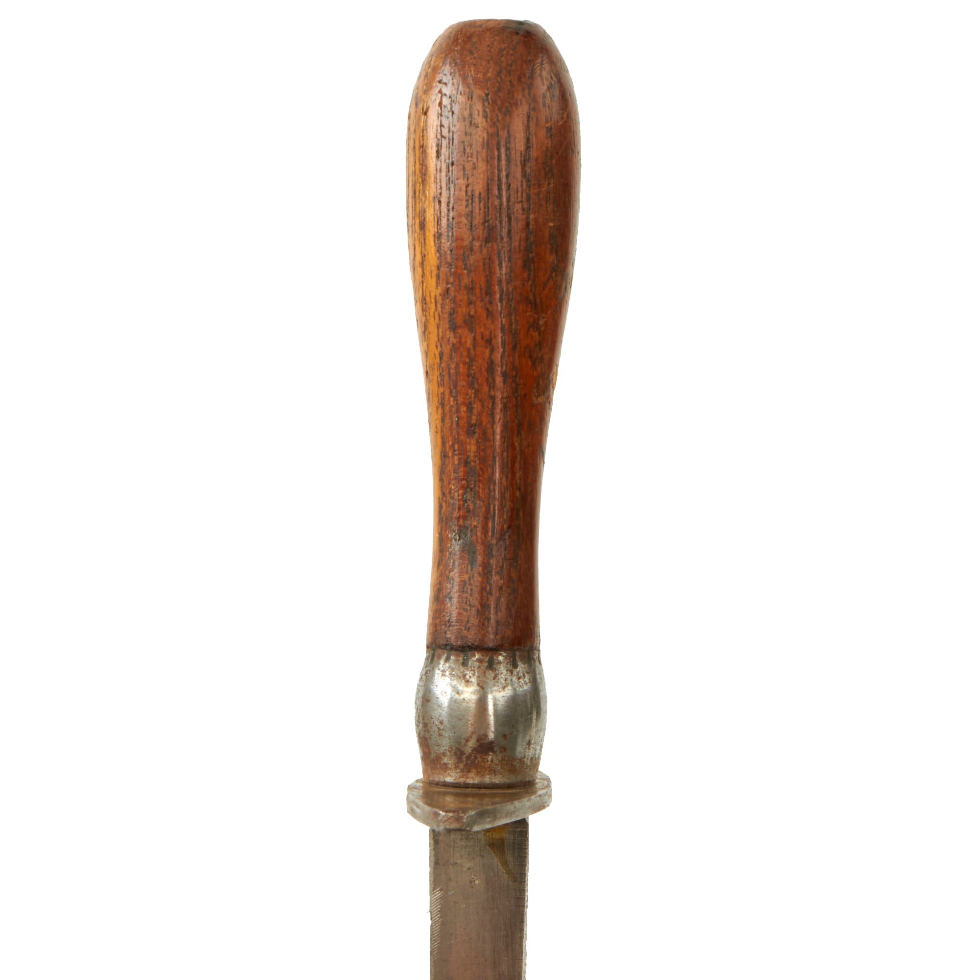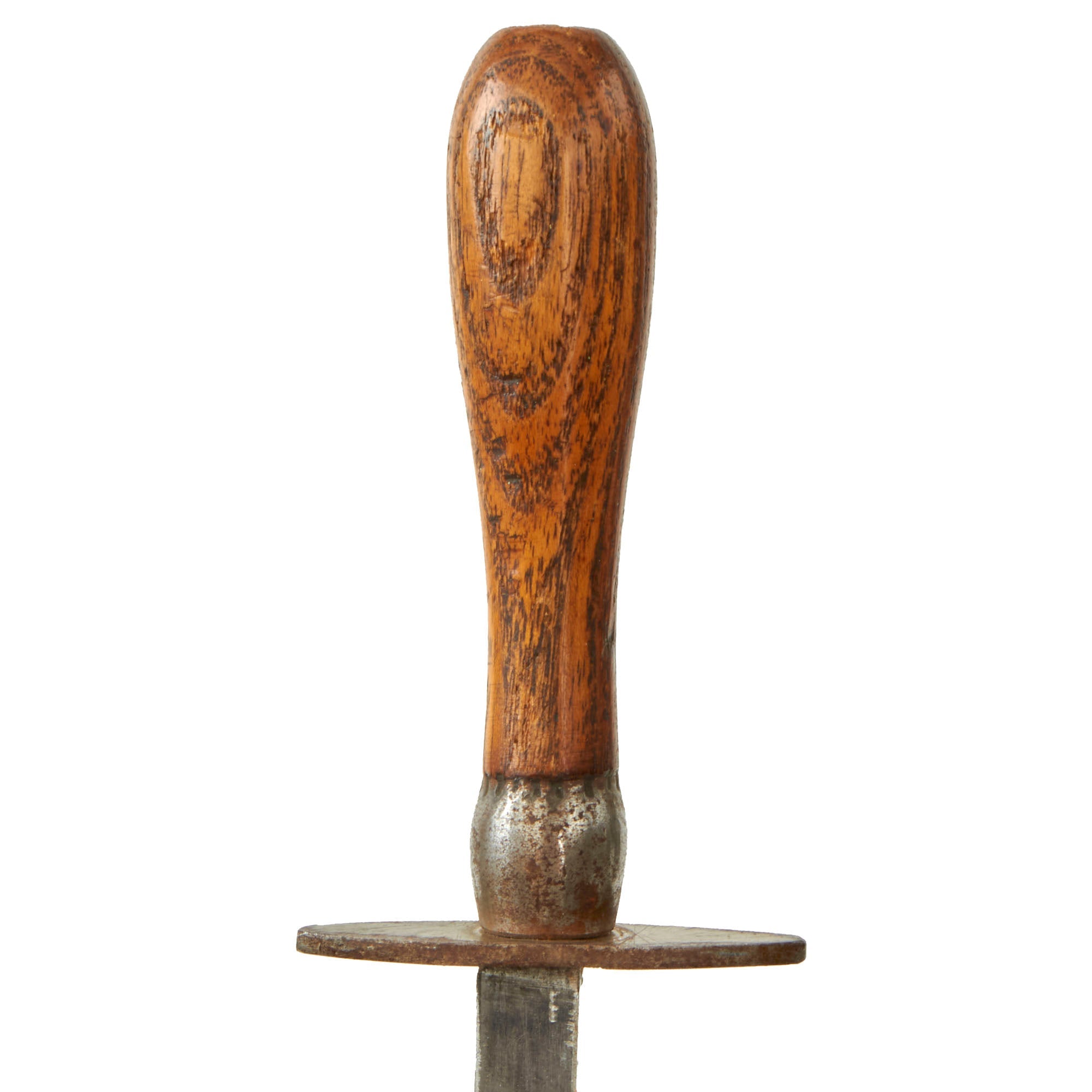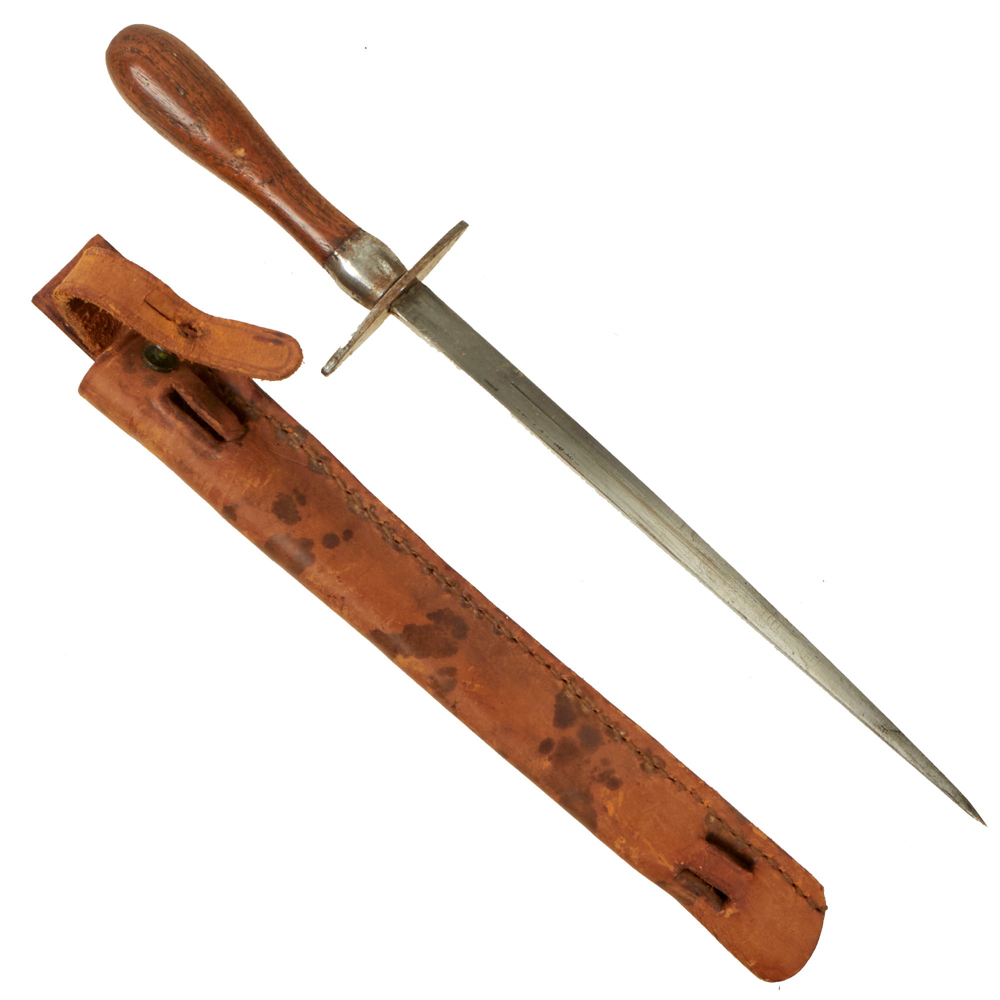 Original Item. Only One Available. This is a very interesting fighting knife made using the triangular blade of a U.S. M1917 “Knuckle Duster” Trench knife and mounting it onto a wooden handle, complete with a hand-made scabbard. The “runner wear” from the original scabbard is still visible on all 3 sides of the blade.