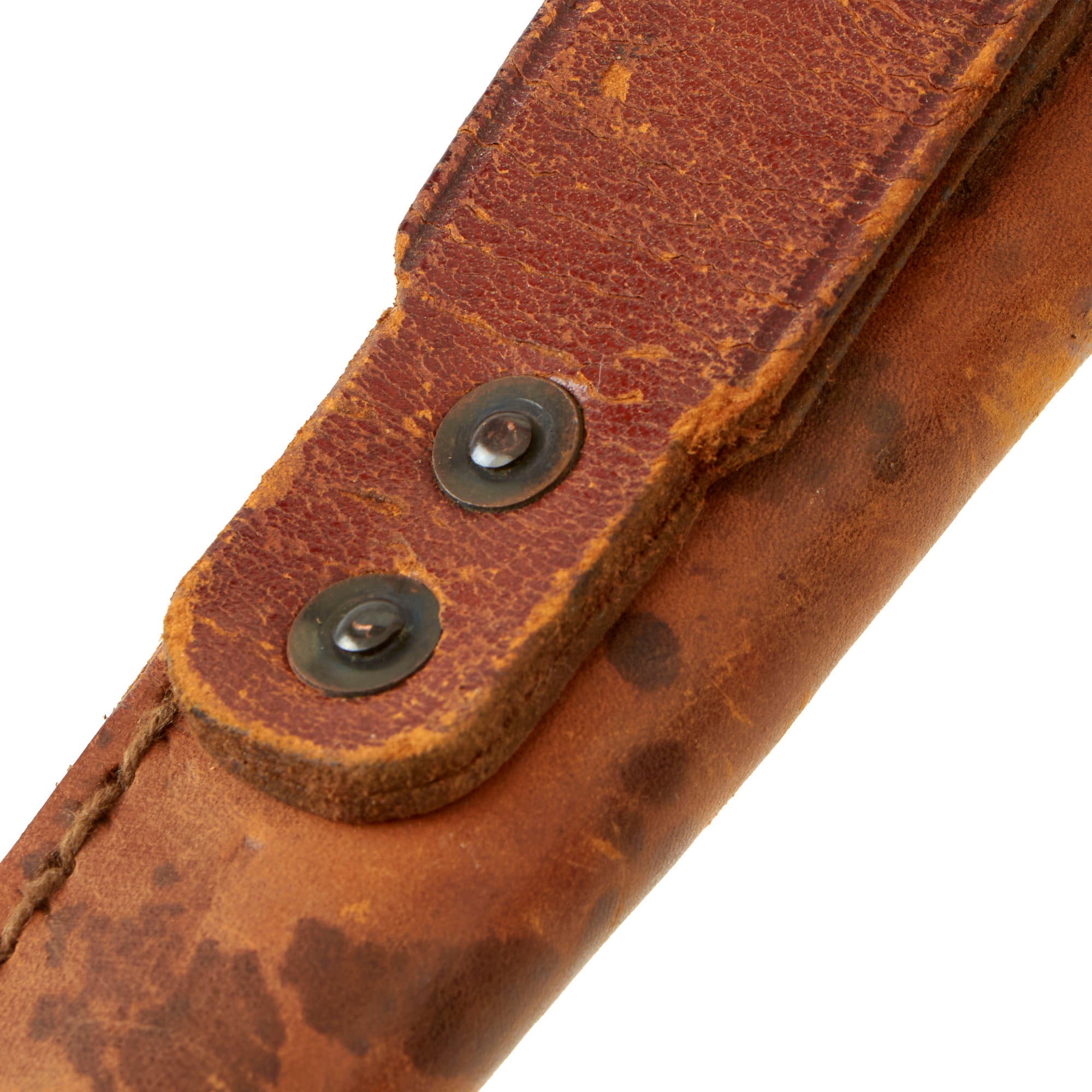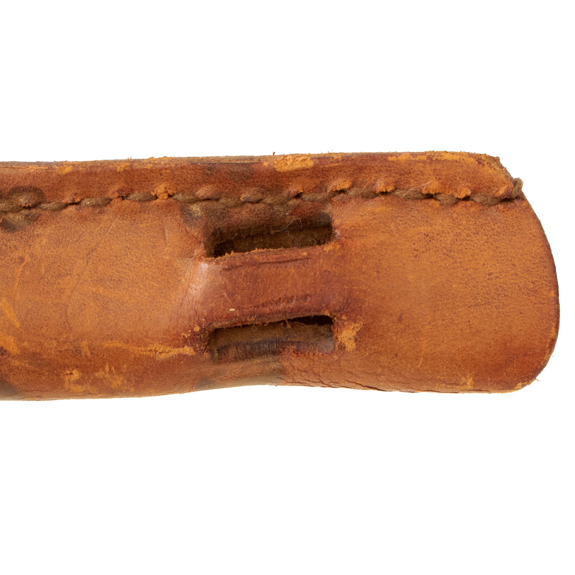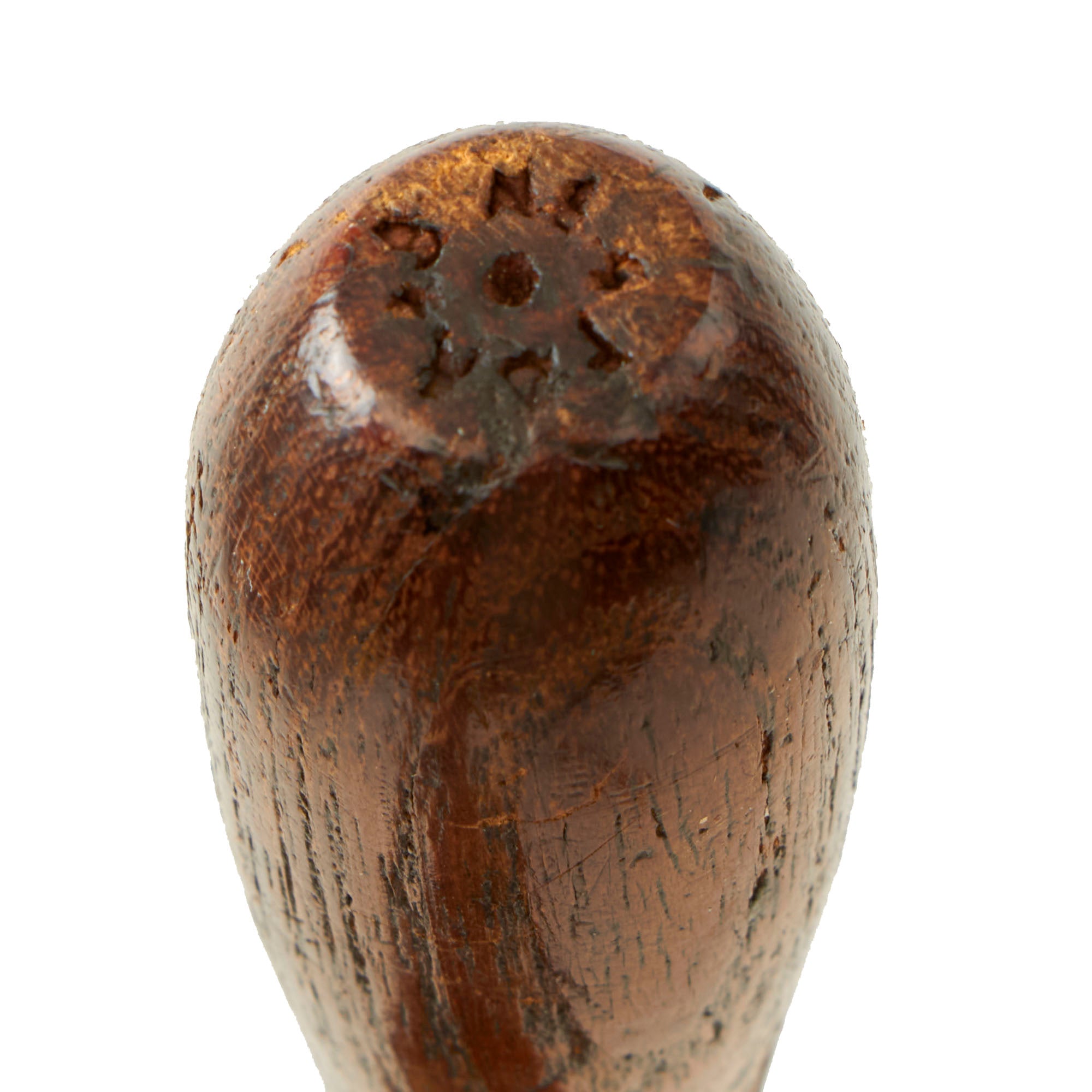 Original Item. Only One Available. This is a very interesting fighting knife made using the triangular blade of a U.S. M1917 “Knuckle Duster” Trench knife and mounting it onto a wooden handle, complete with a hand-made scabbard. The “runner wear” from the original scabbard is still visible on all 3 sides of the blade.