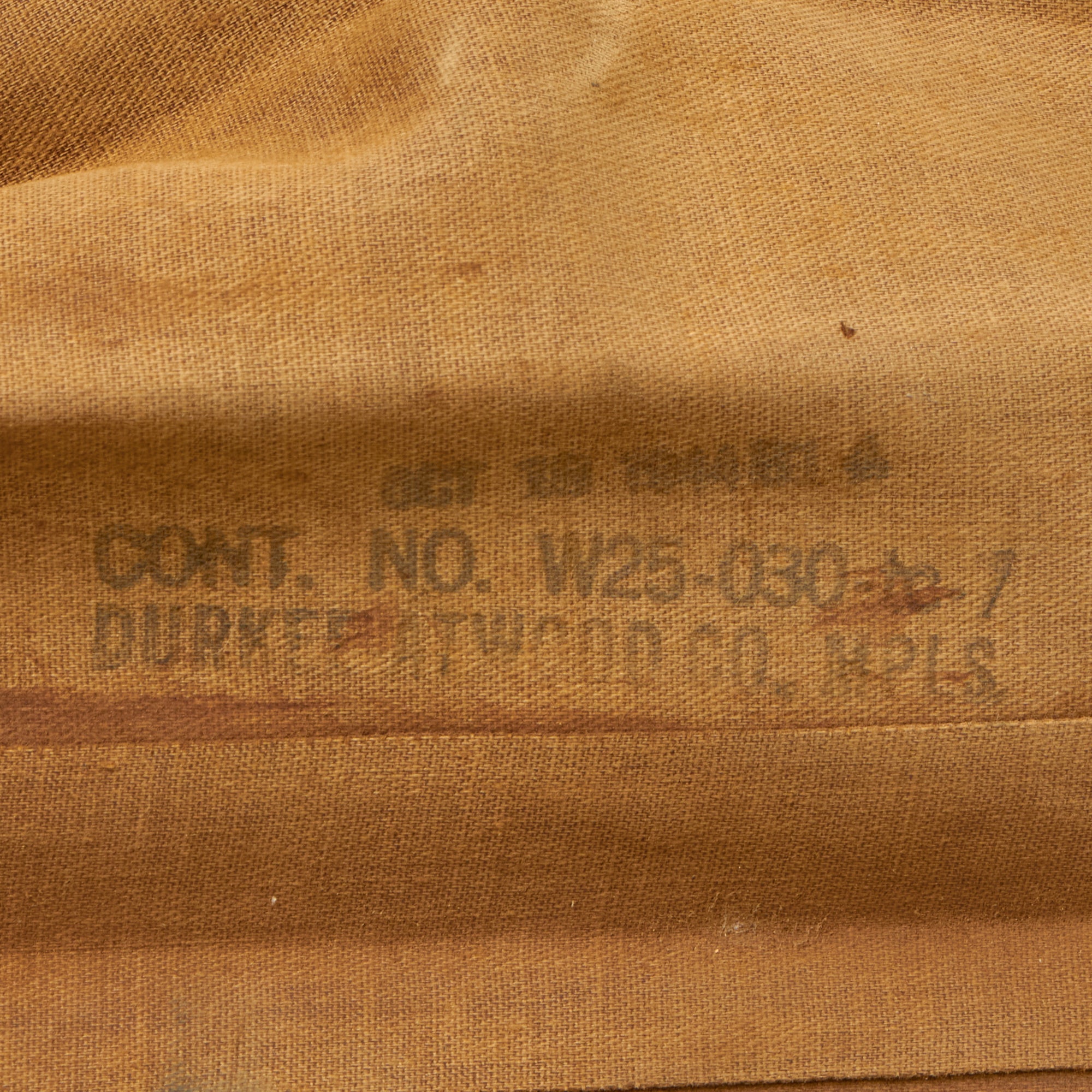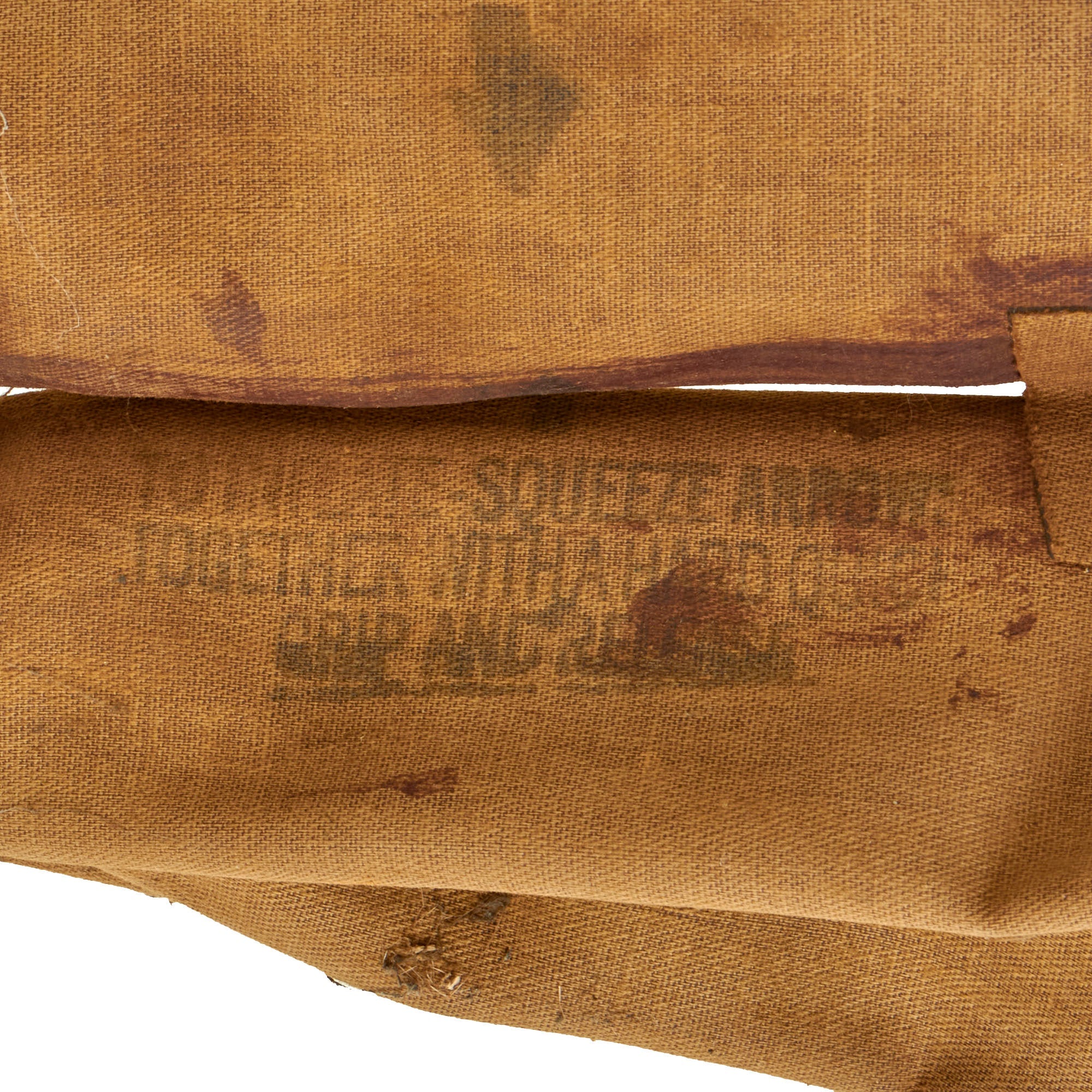 The metal buckle surrounding the CO2 containers shows a USN marking. The instructions are stamped on the canvas, close to the CO2 slots and indicate: "To inflate squeeze arrows together with a hard quick grip and release".