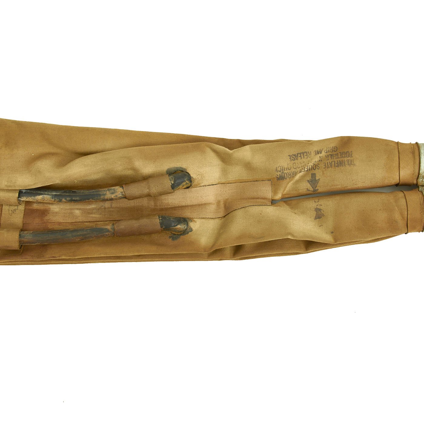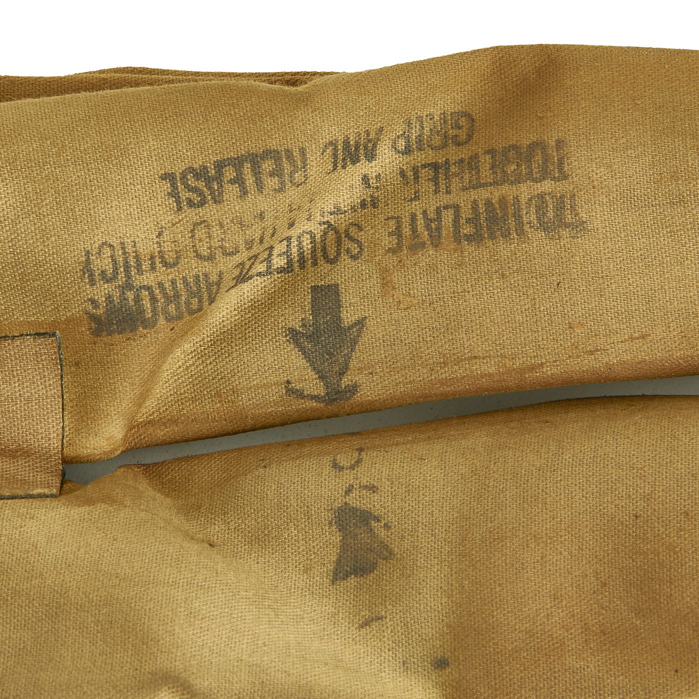 The metal buckle surrounding the CO2 containers shows a USN marking. The instructions are stamped on the canvas, close to the CO2 slots and indicate: "To inflate squeeze arrows together with a hard quick grip and release".