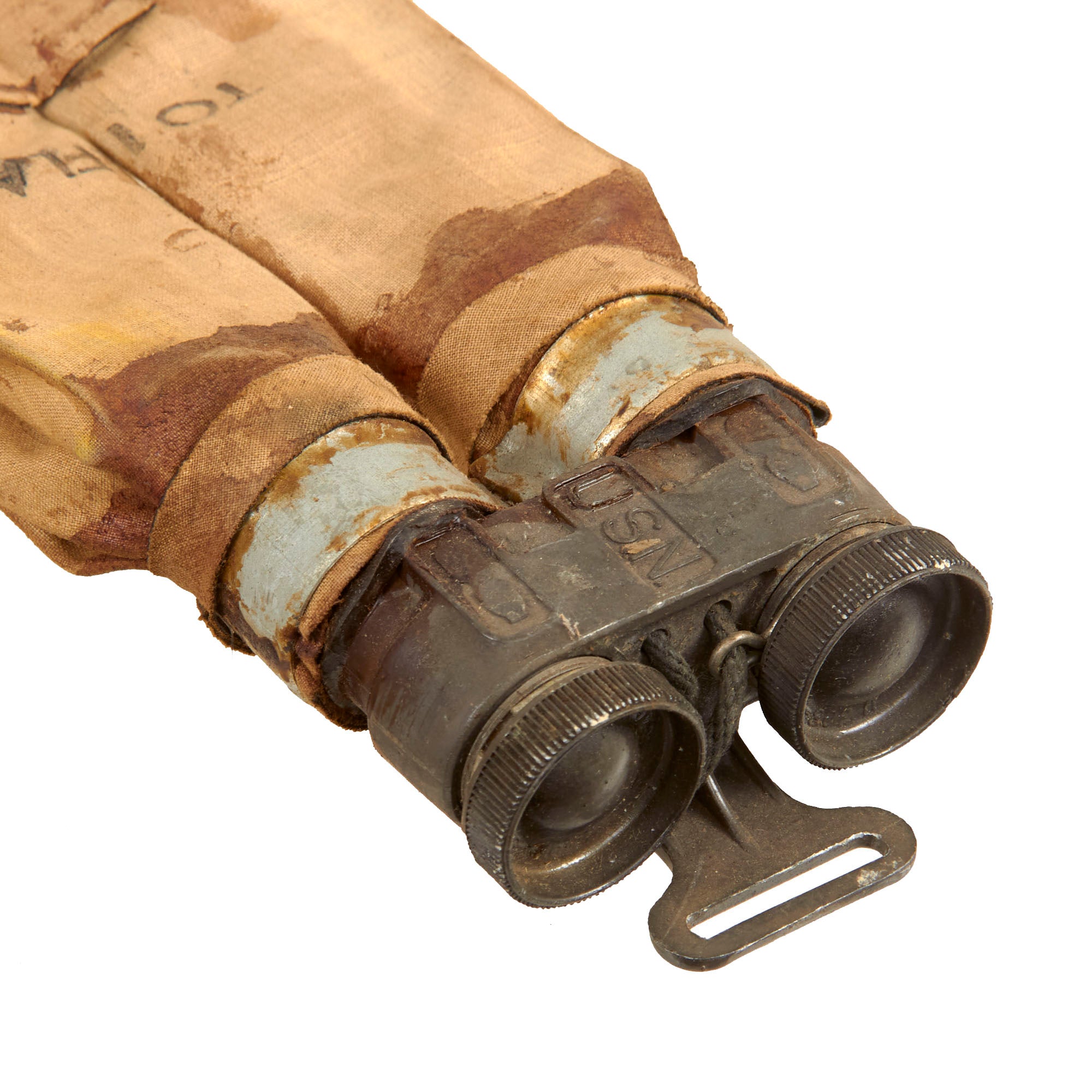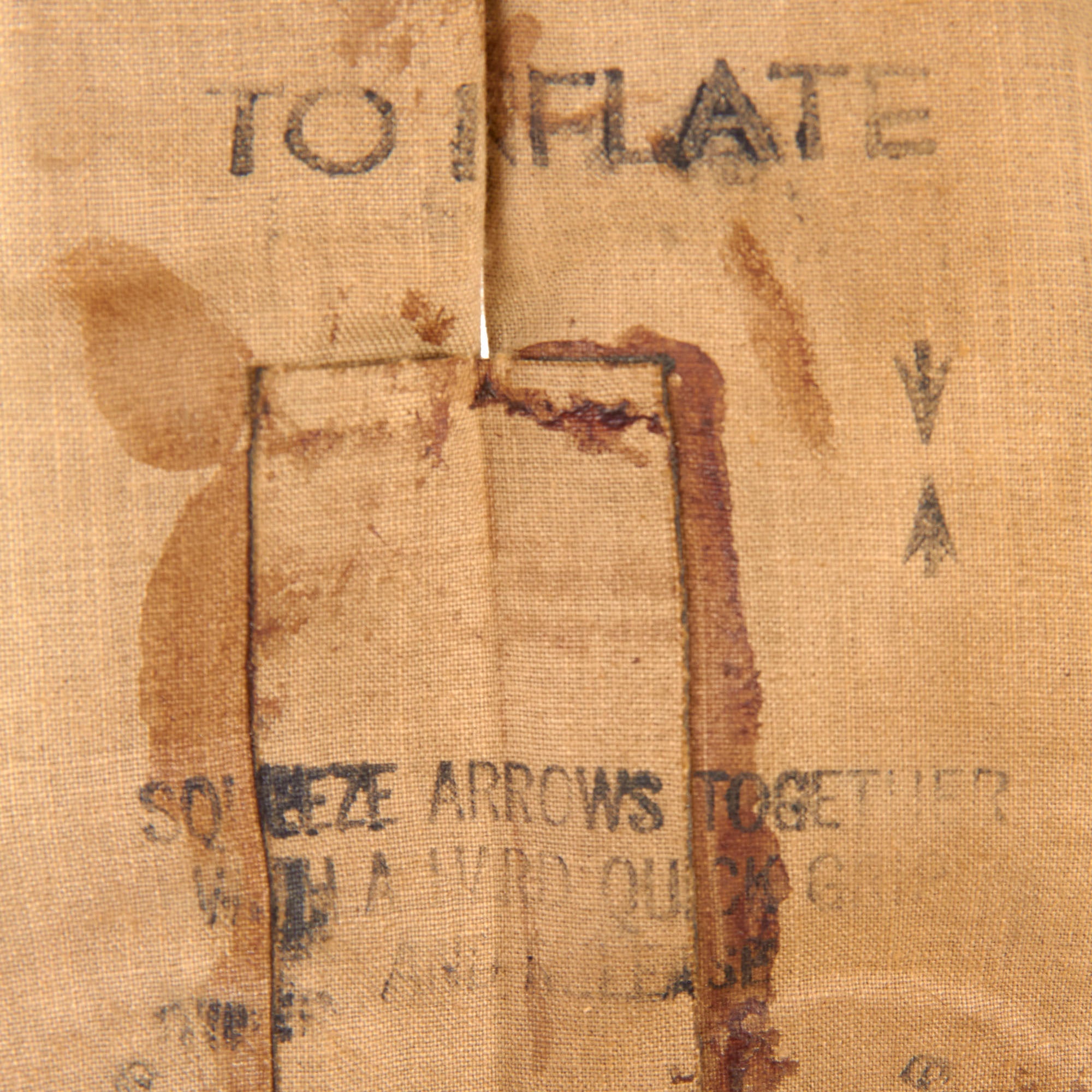 The metal buckle surrounding the CO2 containers shows a USN marking. The instructions are stamped on the canvas, close to the CO2 slots and indicate: "To inflate squeeze arrows together with a hard quick grip and release".