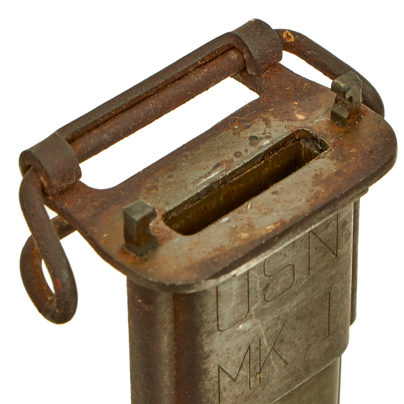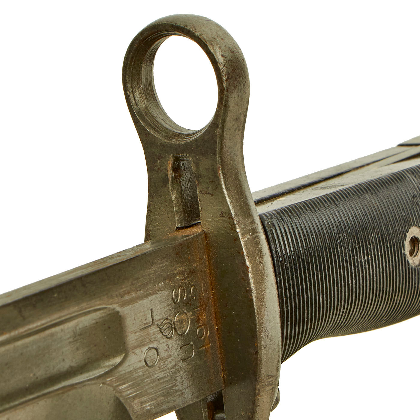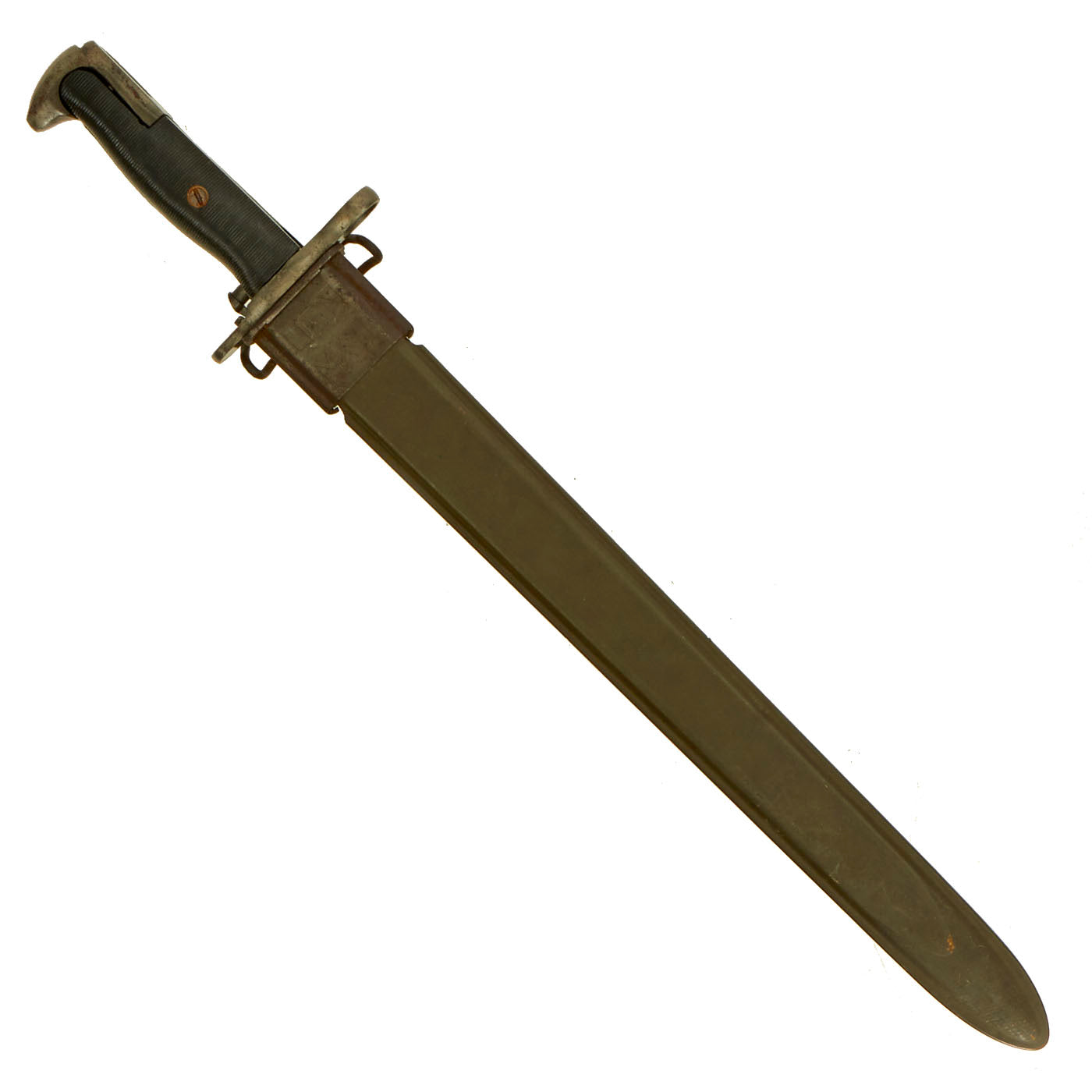 Original Item: Only One Available. This is an excellent condition U.S. M1942 bayonet for the M1 Garand Rifle, complete with the correct WWII Navy Issue M3 scabbard. Technically, this bayonet is considered an M1905 bayonet by the U.S. Army, manufactured in 1942 with plastic ribbed grips. The M1 Garand rifle was designed to take the same blade bayonet as the M1903 Springfield rifle, so at the beginning of the war they were issued with bayonets originally made for those rifles. To keep up with Wartime production, new orders were placed for a version of the M1905 bayonet with plastic grips, and collectors use the designation M1942 for these bayonets, made from 1942 to 1943. Six civilian firms produced 1,540,578 M1905 bayonets from April 1942 to May 1943. Of these, only 250,000 were made by Oneida, making this a very desirable maker.