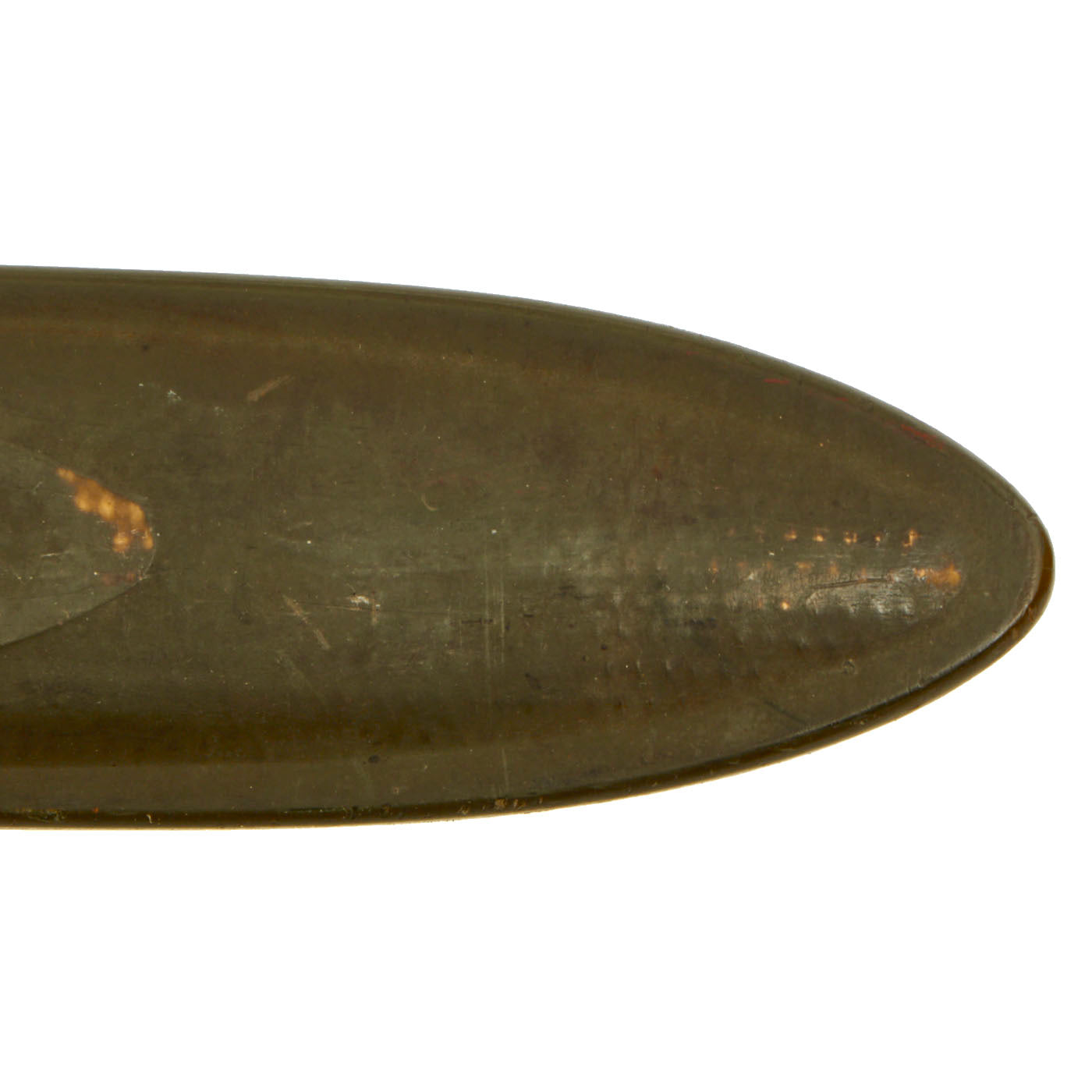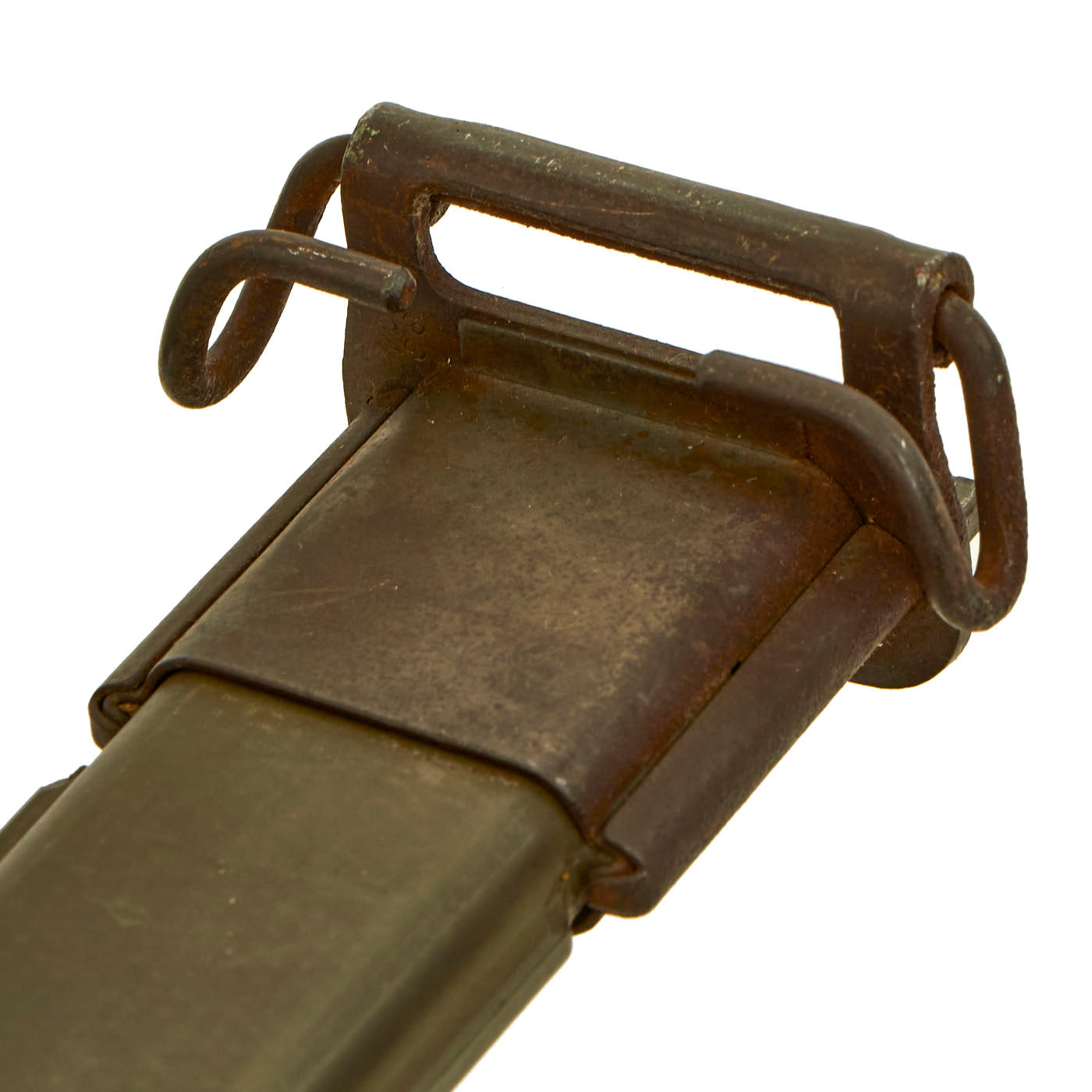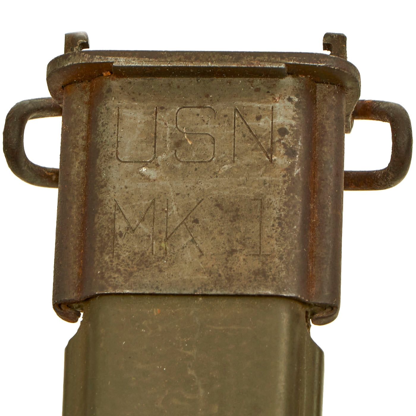 The original M3 scabbard is marked USN / MK 1 on the parkerized steel throat and is in good condition. The B N marking on the underside of the metal throat lip indicates manufacture by Beckwith Manufacturing, who produced a variety of thermoplastic impregnated cotton fabric scabbards during the war. The N is for New England Pressed Steel, who made the steel throats under contract with Beckwith. The finish on the throat is worn, with just a bit of corrosion. The scabbard body has no cracks or major chips, and the paint only shows minor wear on the edges.
