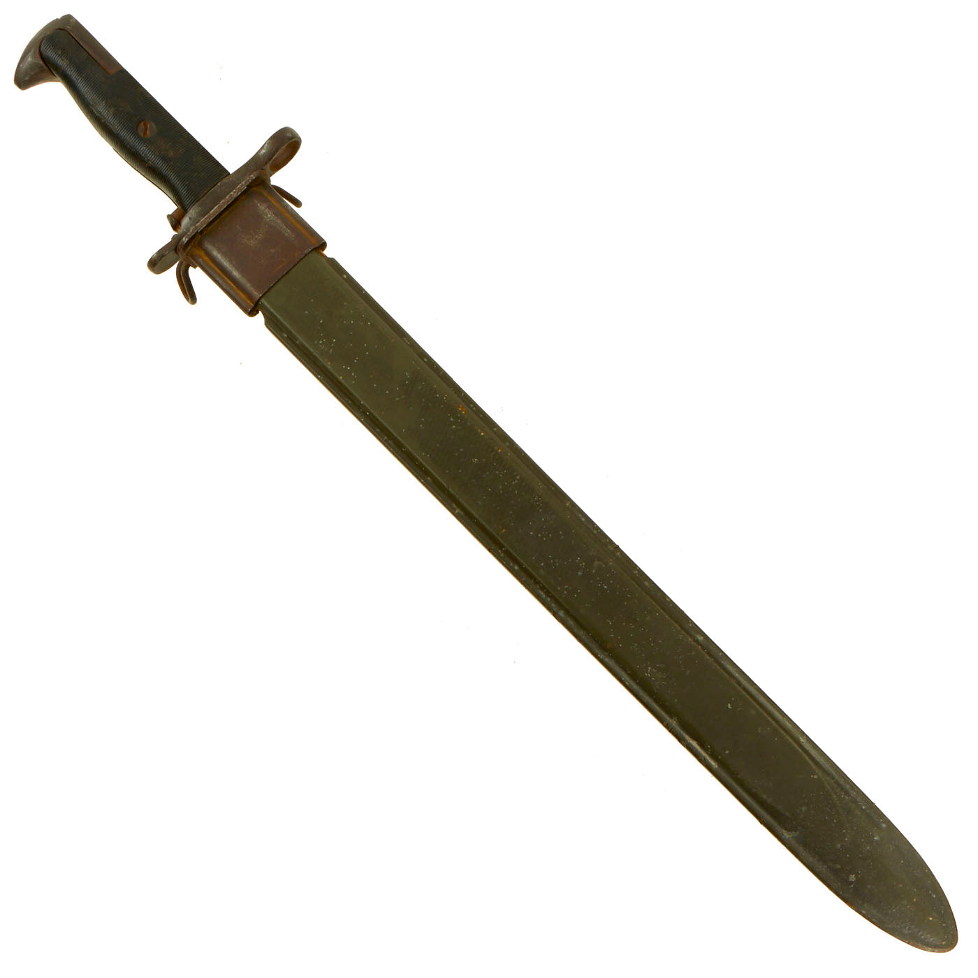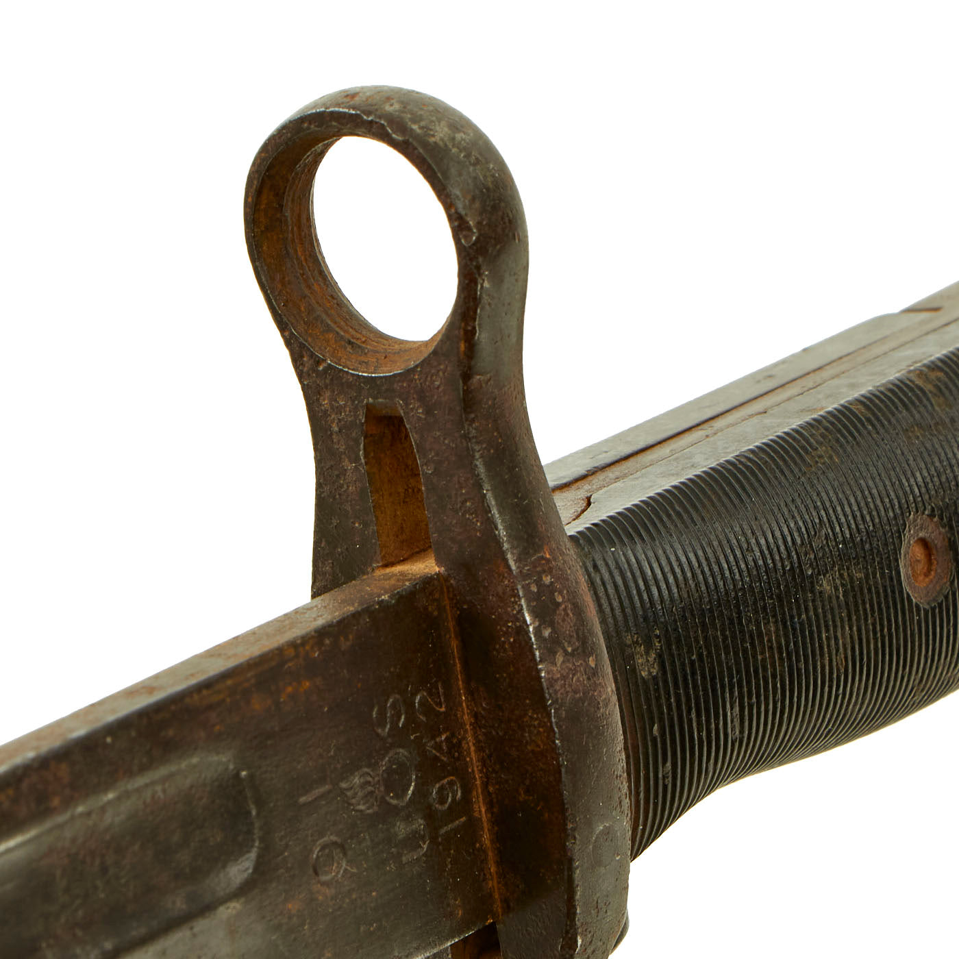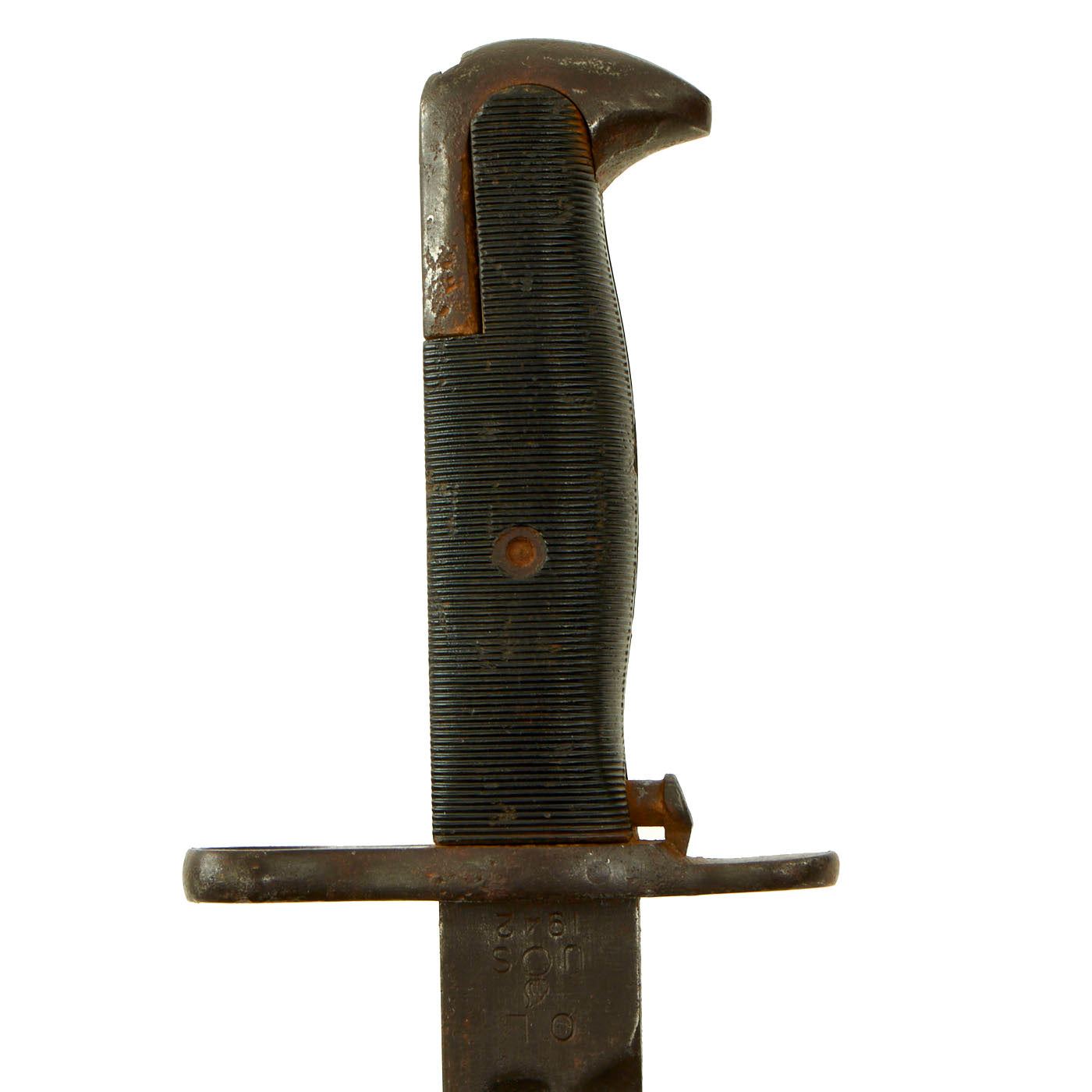 Original Item: Only One Available. This is an excellent condition U.S. M1942 bayonet for the M1 Garand Rifle, complete with the correct WWII Issue M3 scabbard. Technically, this bayonet is considered an M1905 bayonet by the U.S. Army, manufactured in 1942 with plastic ribbed grips. The M1 Garand rifle was designed to take the same blade bayonet as the M1903 Springfield rifle, so at the beginning of the war they were issued with bayonets originally made for those rifles. To keep up with Wartime production, new orders were placed for a version of the M1905 bayonet with plastic grips, and collectors use the designation M1942 for these bayonets, made from 1942 to 1943. Six civilian firms produced 1,540,578 M1905 bayonets from April 1942 to May 1943. Of these, only 250,000 were made by Oneida, making this a very desirable maker.