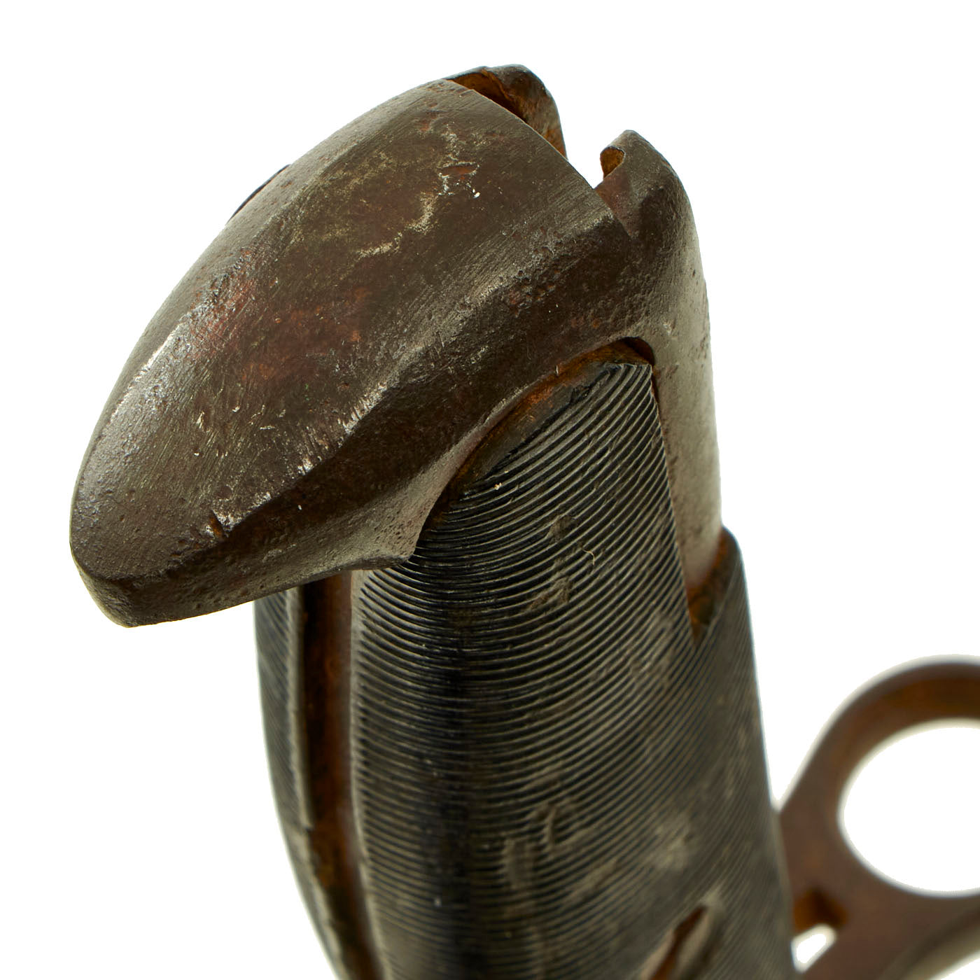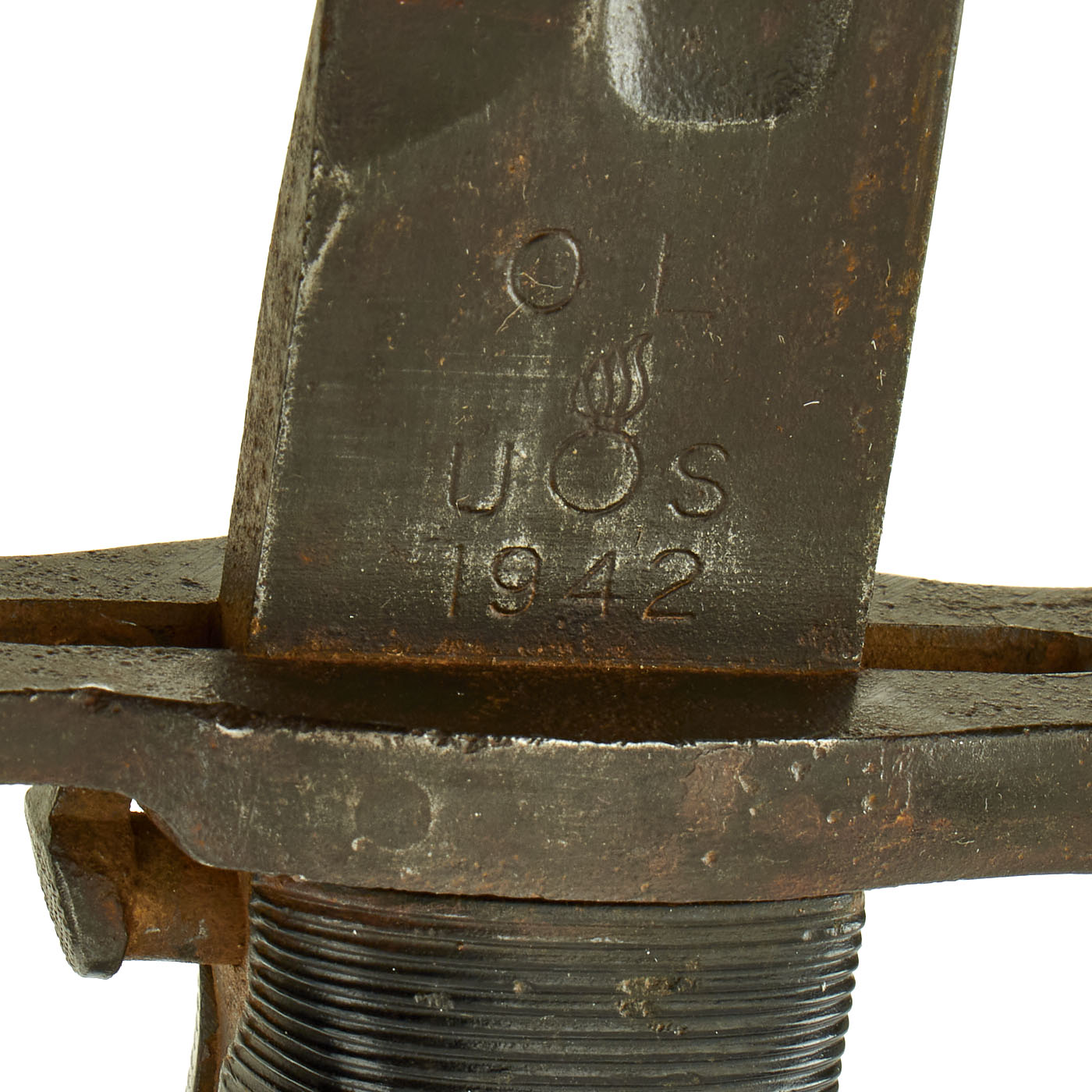 The blade ricasso is marked with maker OL (Oneida Limited) above U.S. around the Ordnance flaming bomb. Below this is the manufacture date of 1942. The reverse ricasso has an extremely faint U.S. Ordnance crossed cannon proof mark. The parkerized finish on the blade and handle is in fair condition, with the expected wear of age but does show quite a bit of staining and oxidation. The tip of the bayonet has some heavy pitting present, more than likely from water collecting in the lower portion of the scabbard.