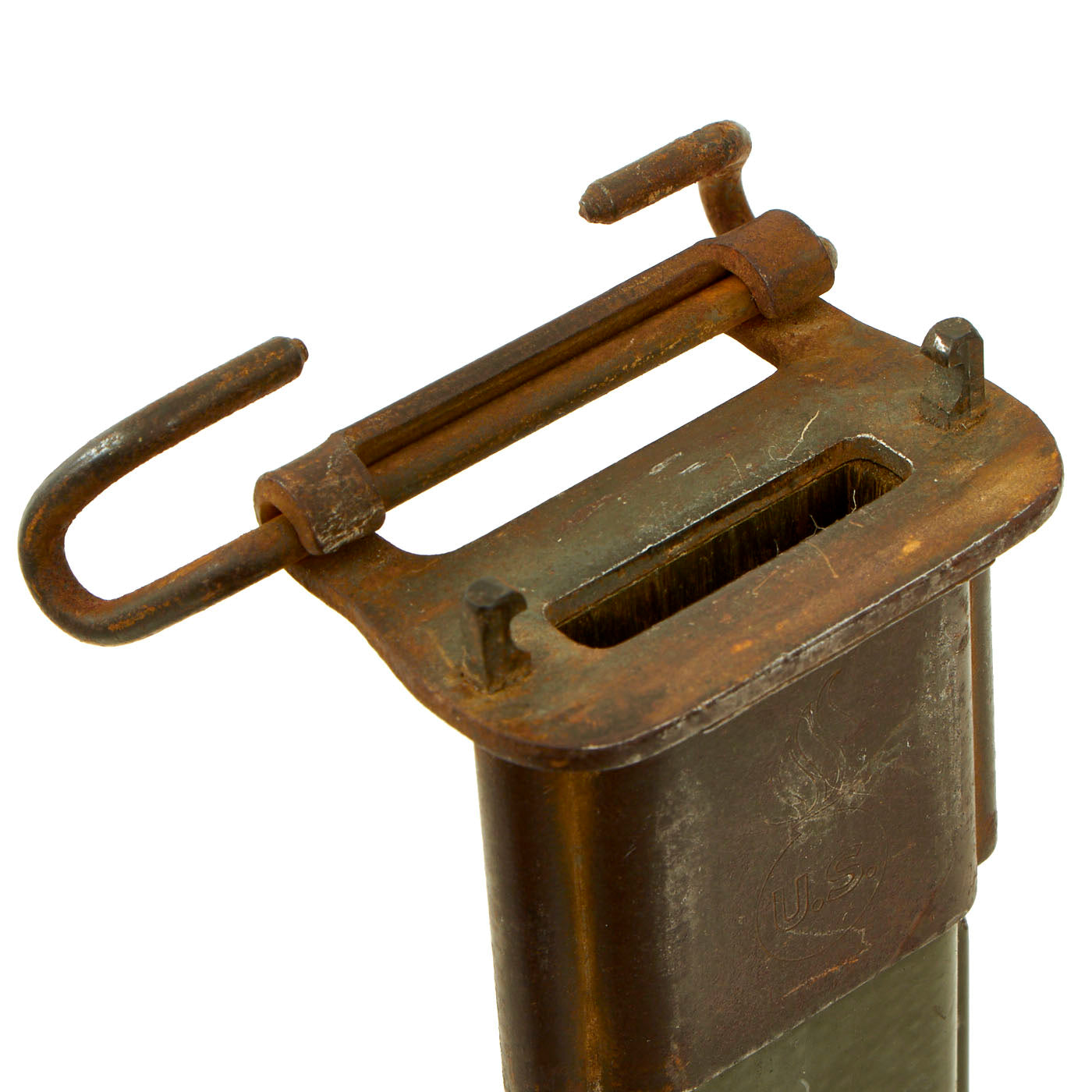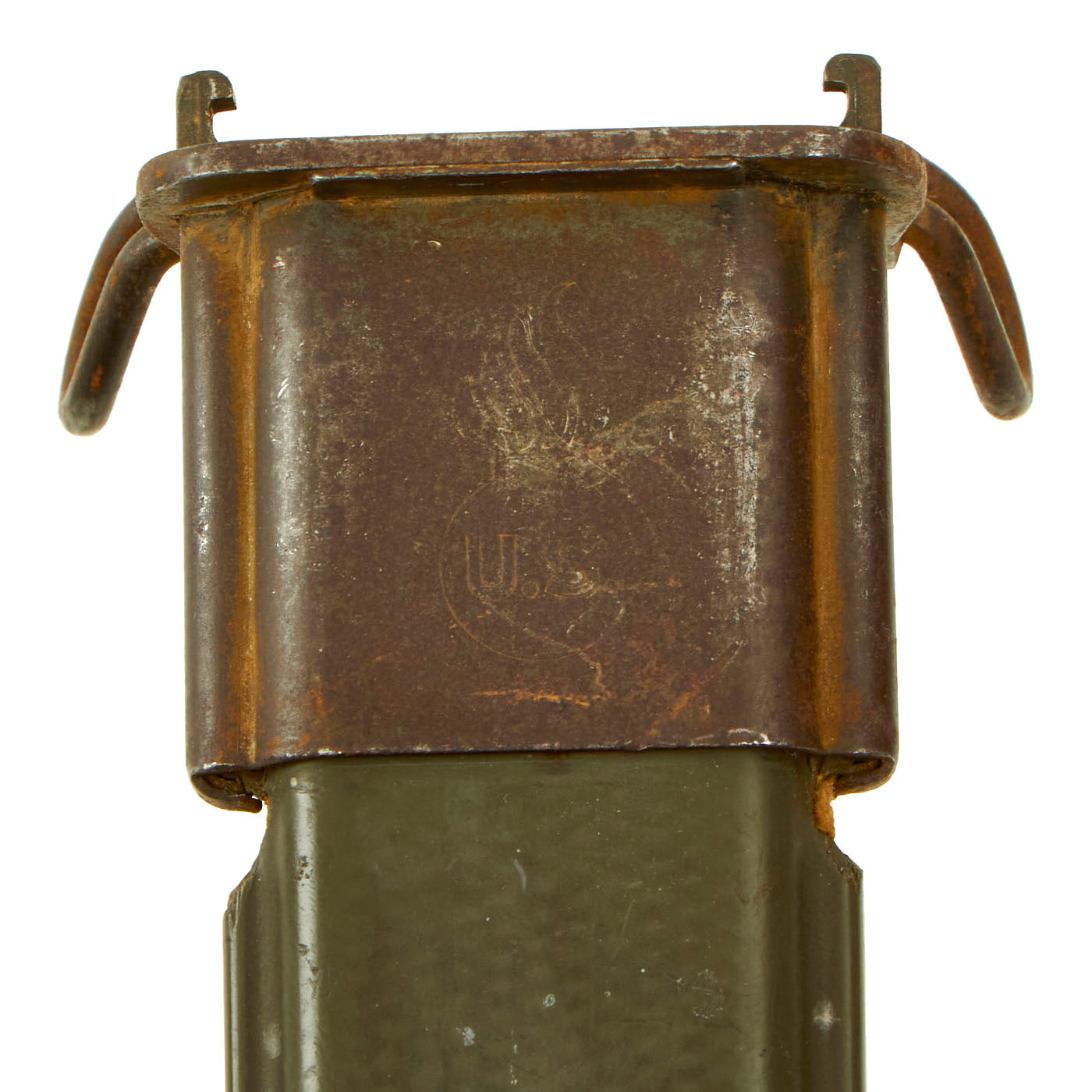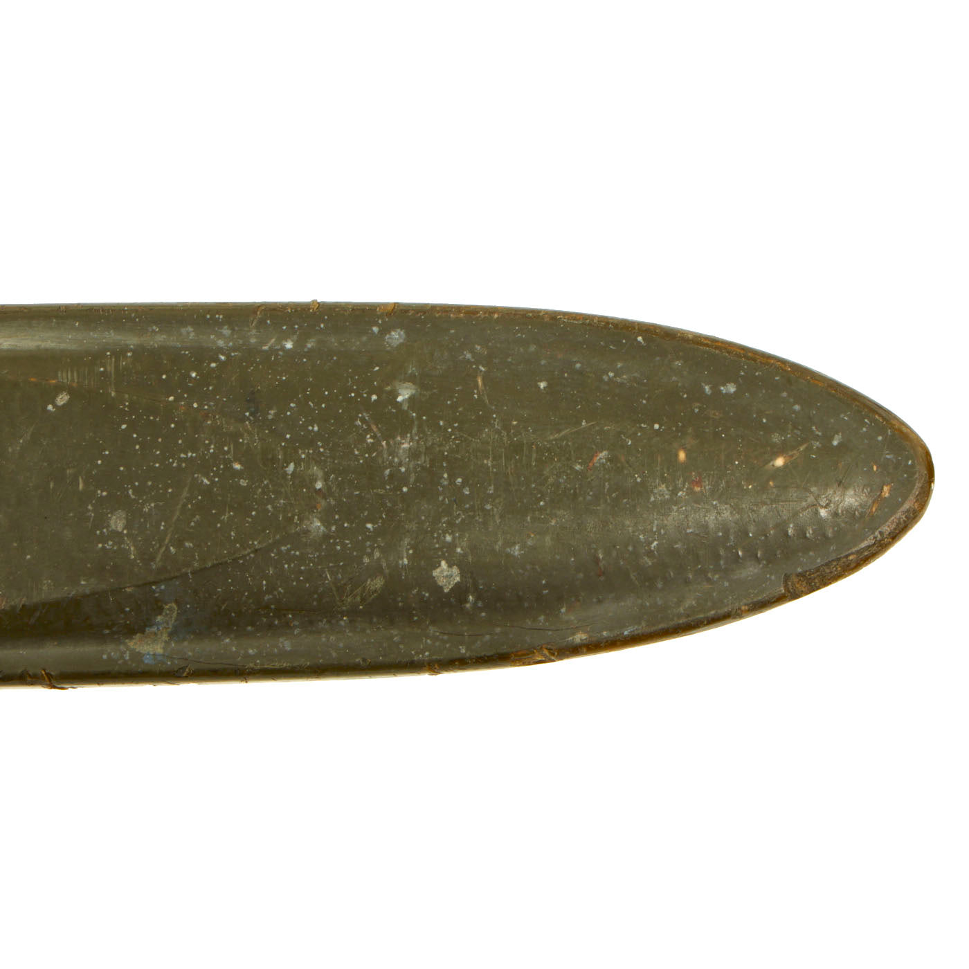The original M3 scabbard is marked US over the Ordnance "Flaming Bomb" on the oxidized parkerized steel throat and is in good condition. The B N marking on the underside of the metal throat lip indicates manufacture by Beckwith Manufacturing, who produced a variety of thermoplastic impregnated cotton fabric scabbards during the war. The N is for New England Pressed Steel, who made the steel throats under contract with Beckwith. The finish on the throat is worn, with just a bit of corrosion. The scabbard body has no cracks but does have chips, and the paint only shows minor wear on the edges.