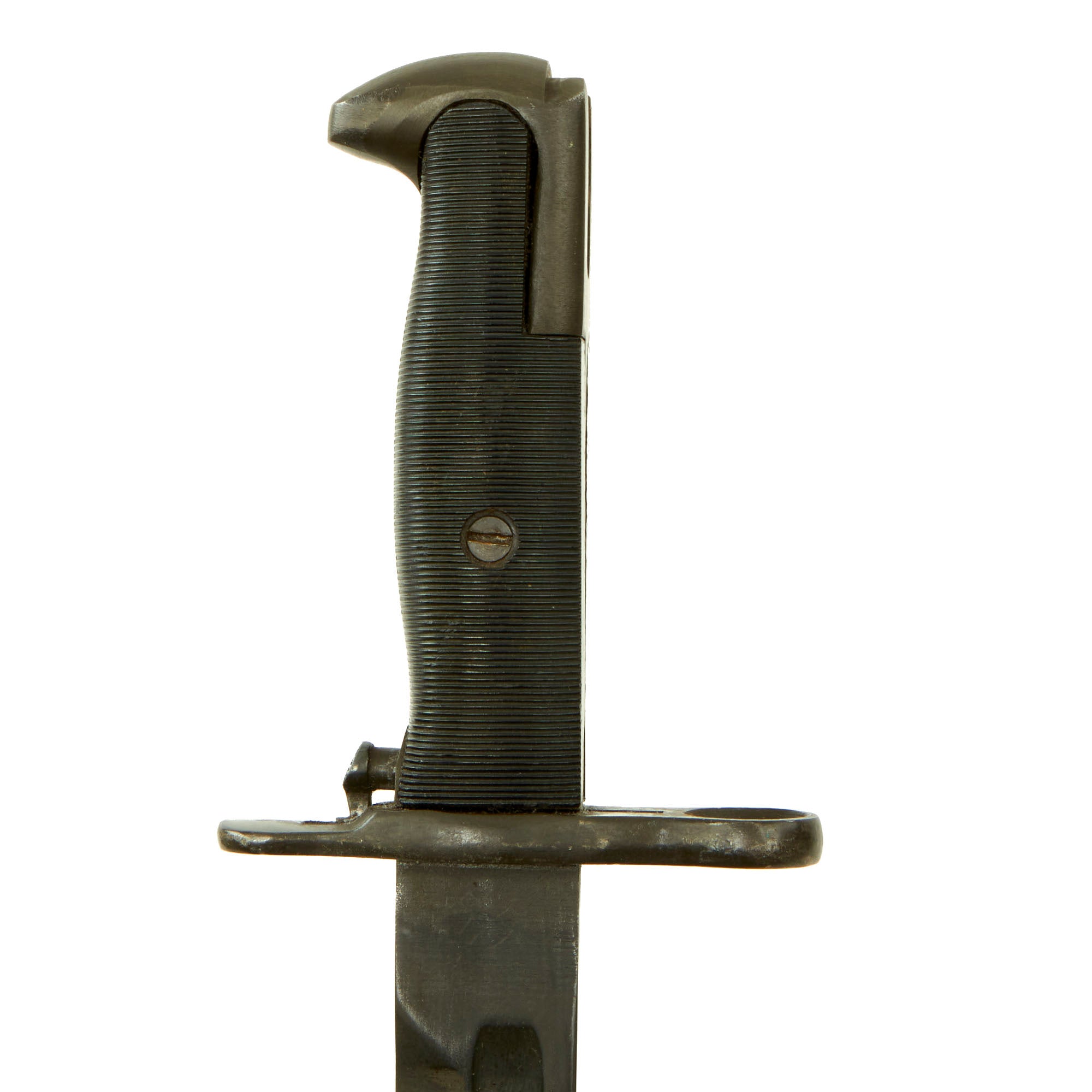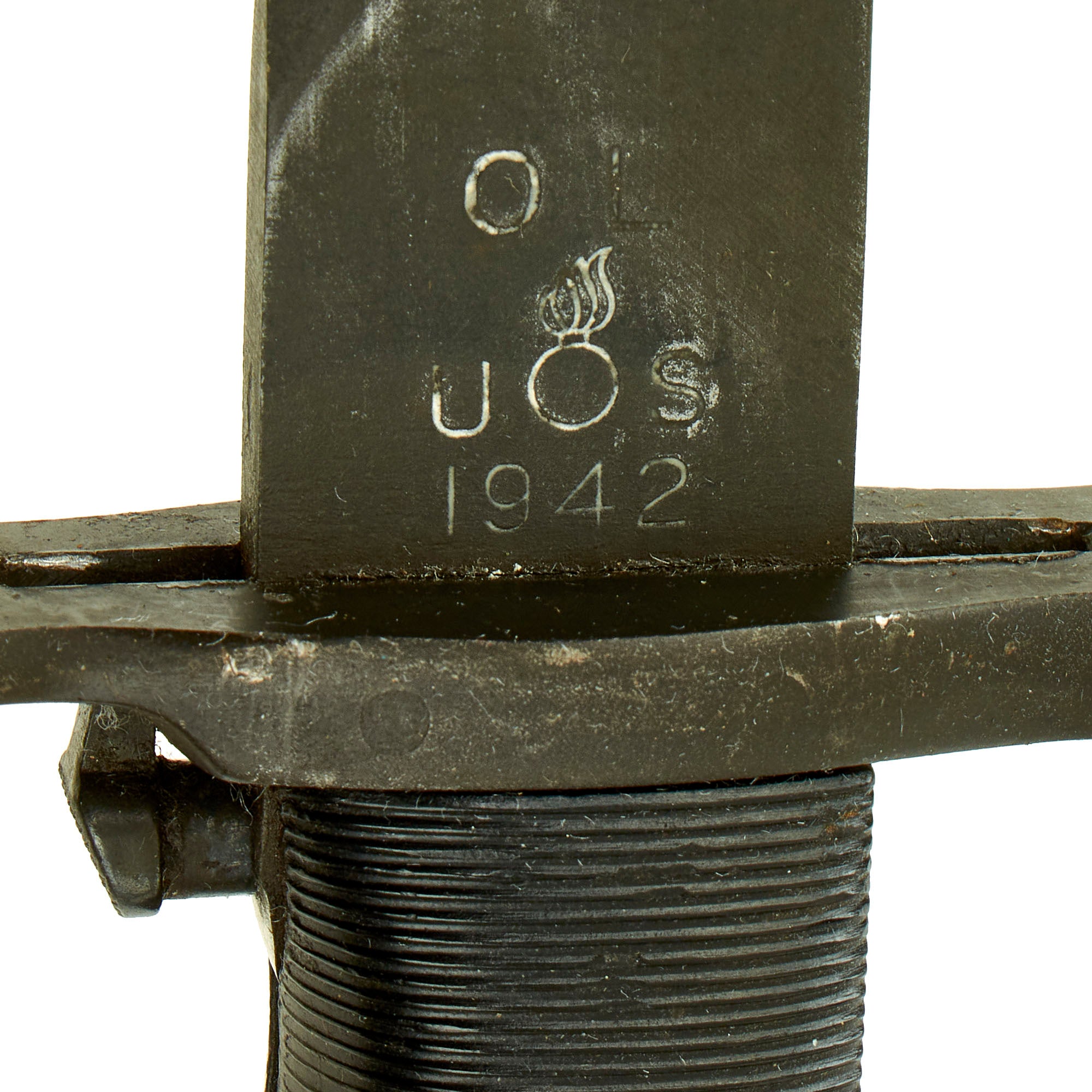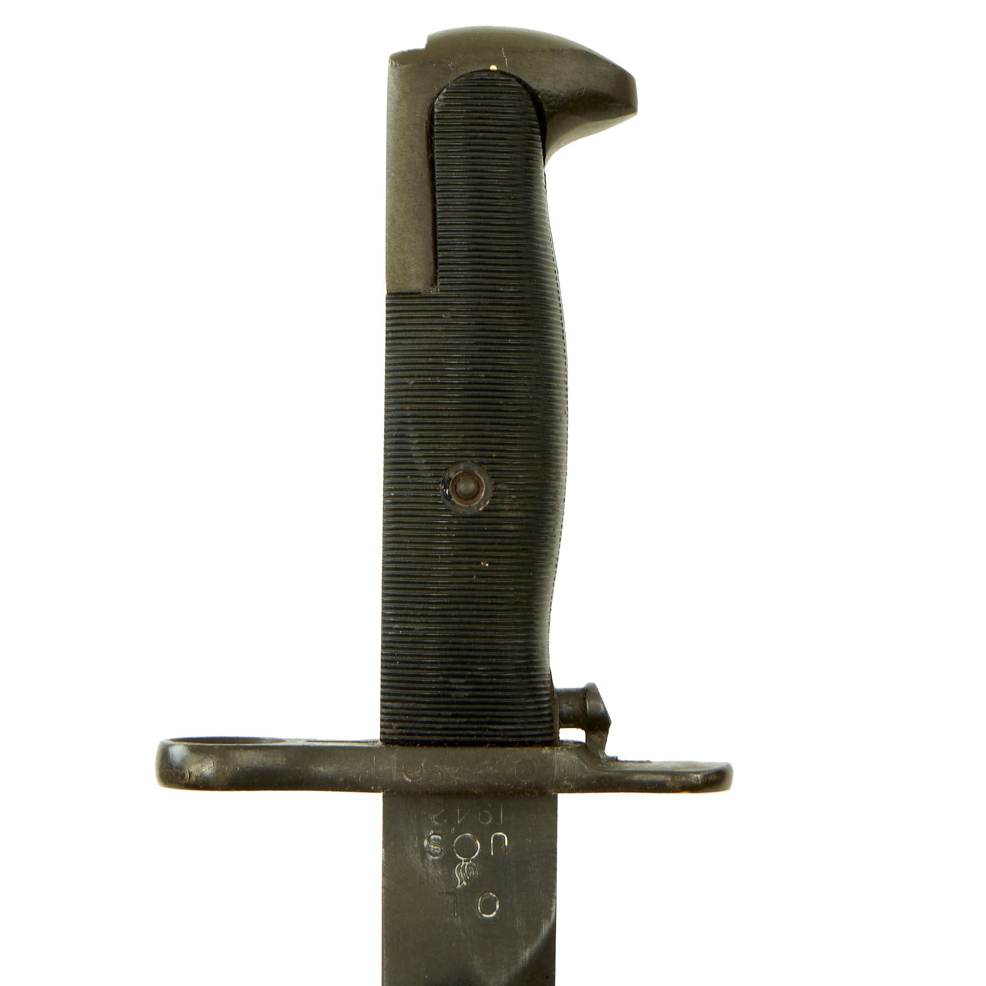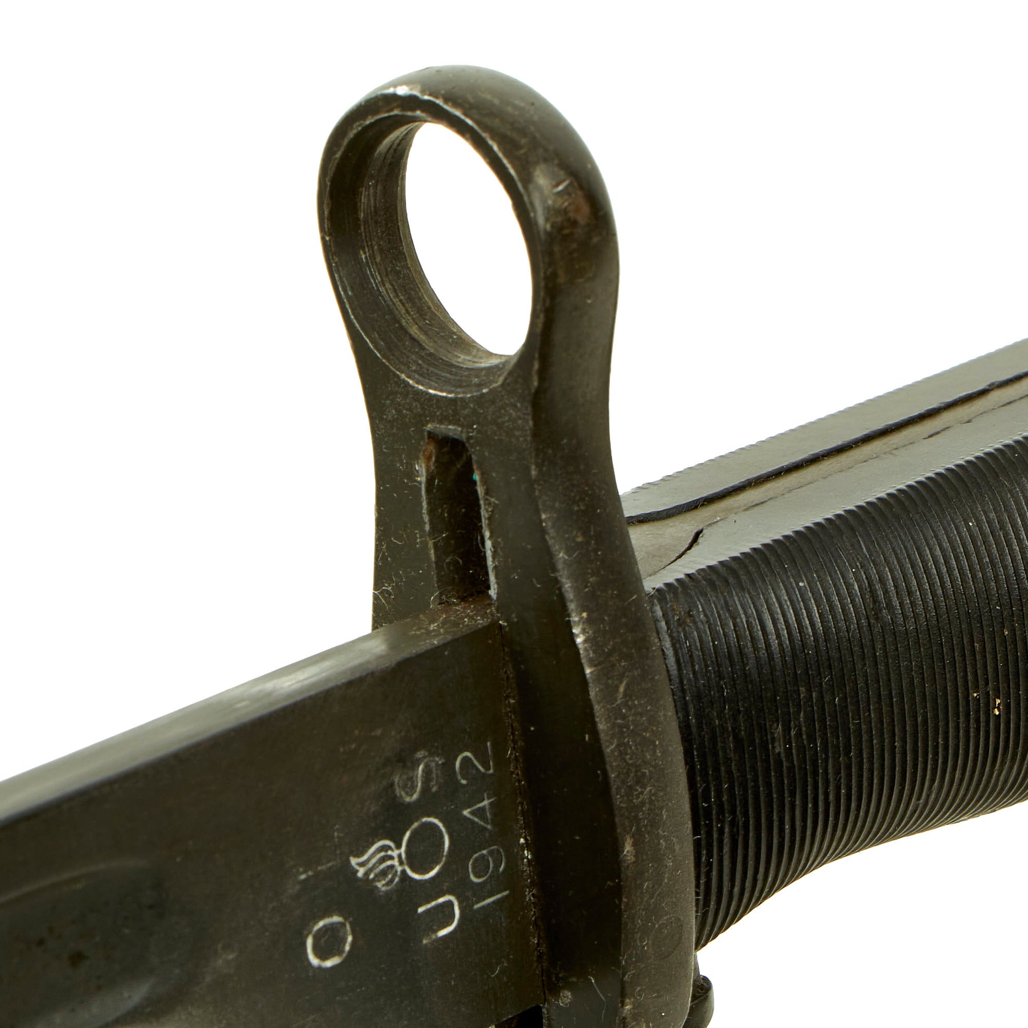 Original Item: Only One Available. This is an excellent condition U.S. M1942 bayonet for the M1 Garand Rifle, complete with the correct WWII Issue M3 scabbard. Technically, this bayonet is considered an M1905 bayonet by the U.S. Army, manufactured in 1942 with plastic ribbed grips. The M1 Garand rifle was designed to take the same blade bayonet as the M1903 Springfield rifle, so at the beginning of the war they were issued with bayonets originally made for those rifles. To keep up with Wartime production, new orders were placed for a version of the M1905 bayonet with plastic grips, and collectors use the designation M1942 for these bayonets, made from 1942 to 1943. Six civilian firms produced 1,540,578 M1905 bayonets from April 1942 to May 1943. Of these, only 250,000 were made by Oneida, making this a very desirable maker.