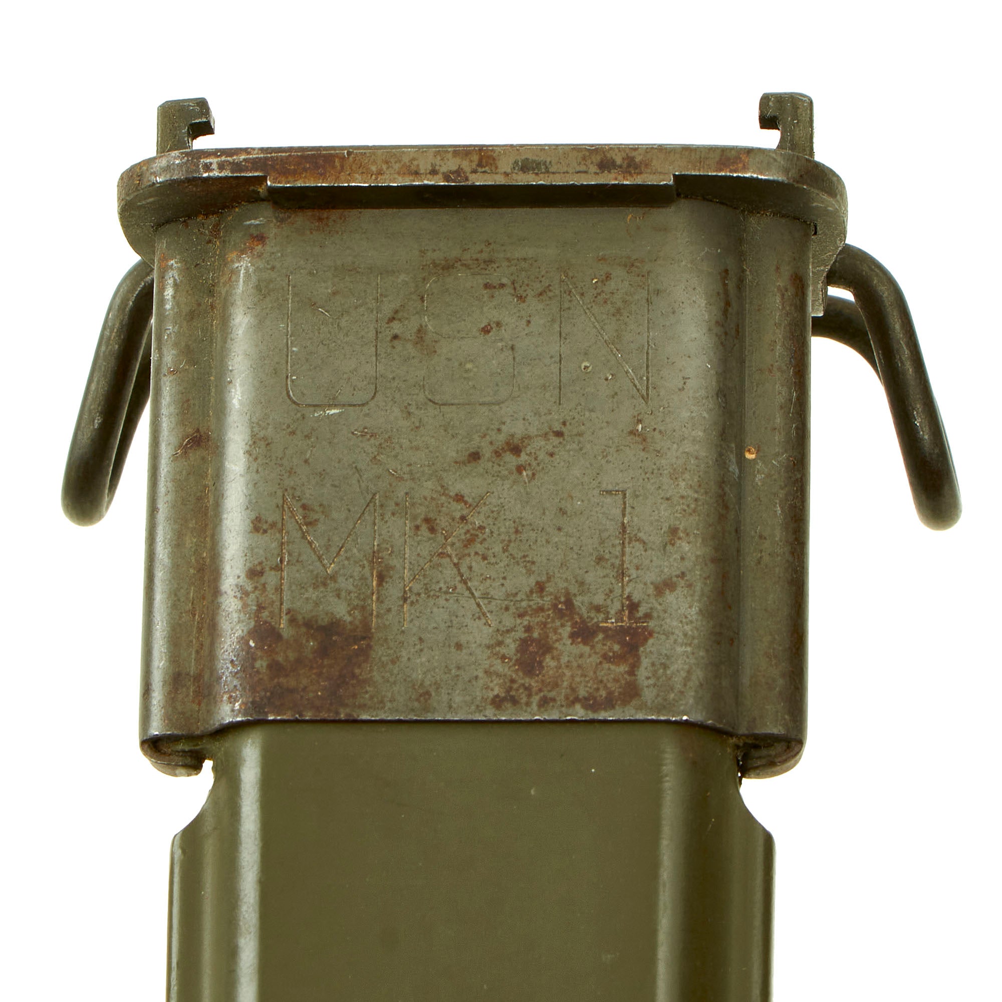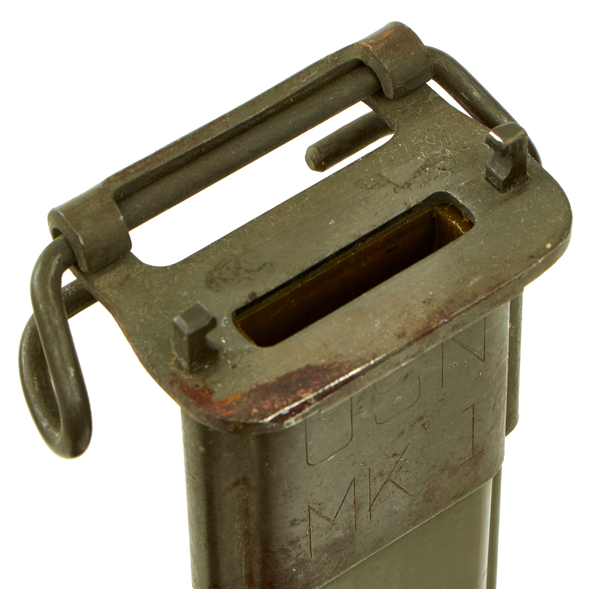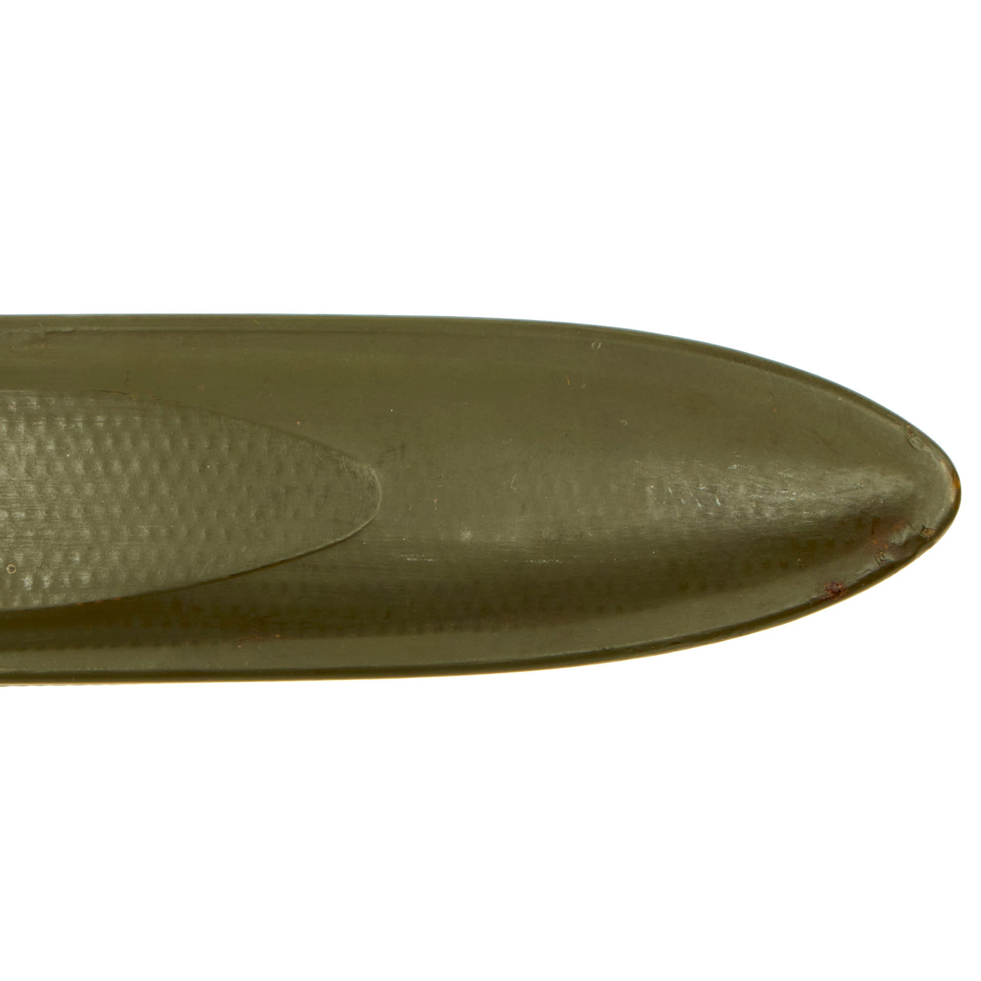 The original M3 scabbard is marked US over the Ordnance "Flaming Bomb" on the oxidized parkerized steel throat and is in good condition. The B N marking on the underside of the metal throat lip indicates manufacture by Beckwith Manufacturing, who produced a variety of thermoplastic impregnated cotton fabric scabbards during the war. The N is for New England Pressed Steel, who made the steel throats under contract with Beckwith. The finish on the throat is worn, with just a bit of corrosion. The scabbard body has no cracks but does have chips, and the paint only shows minor wear on the edges.