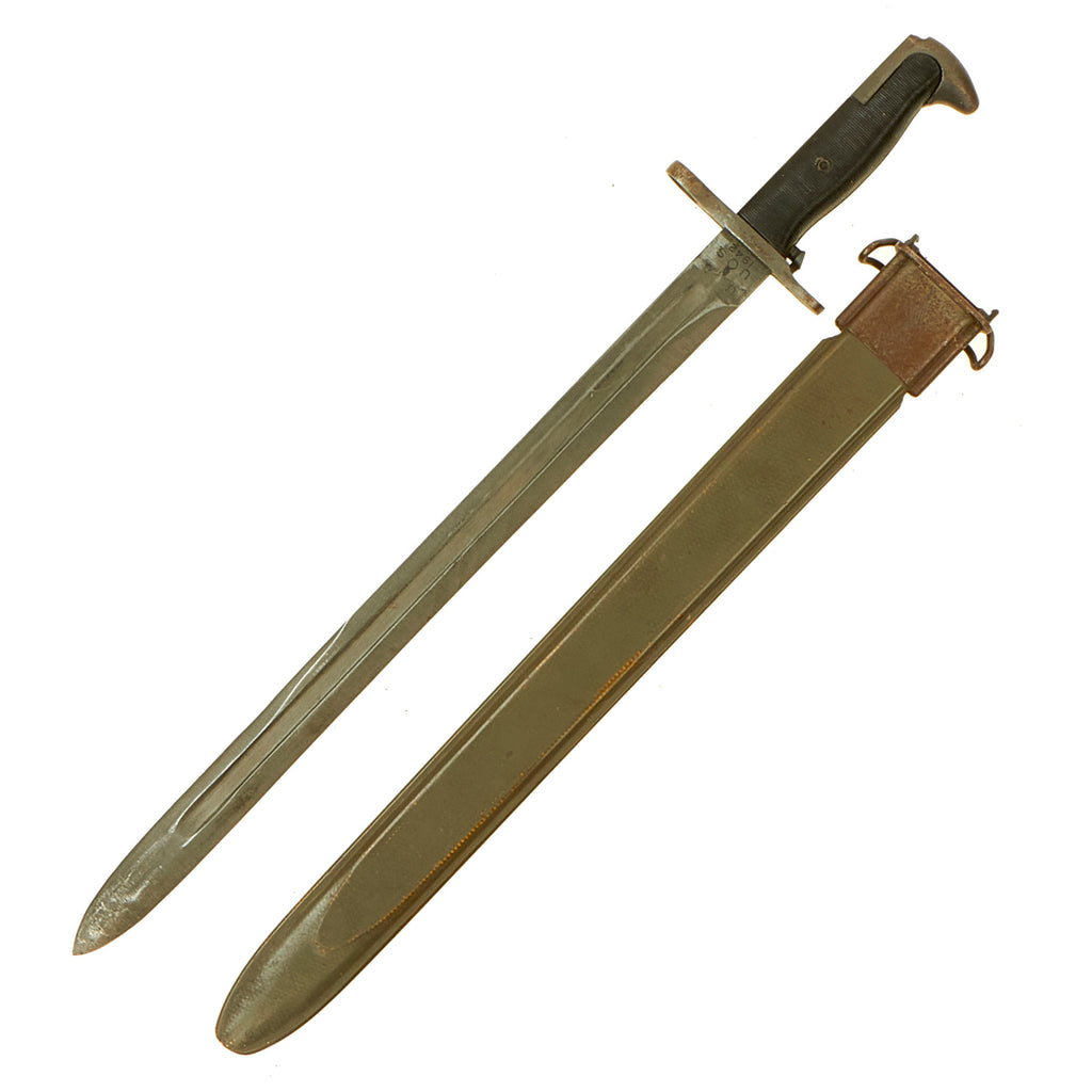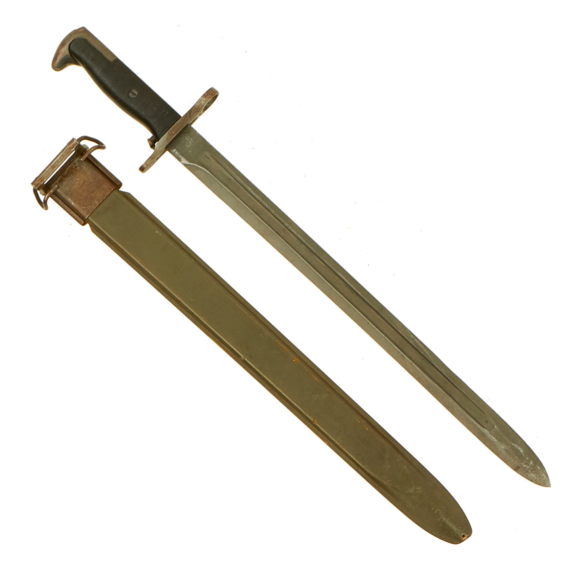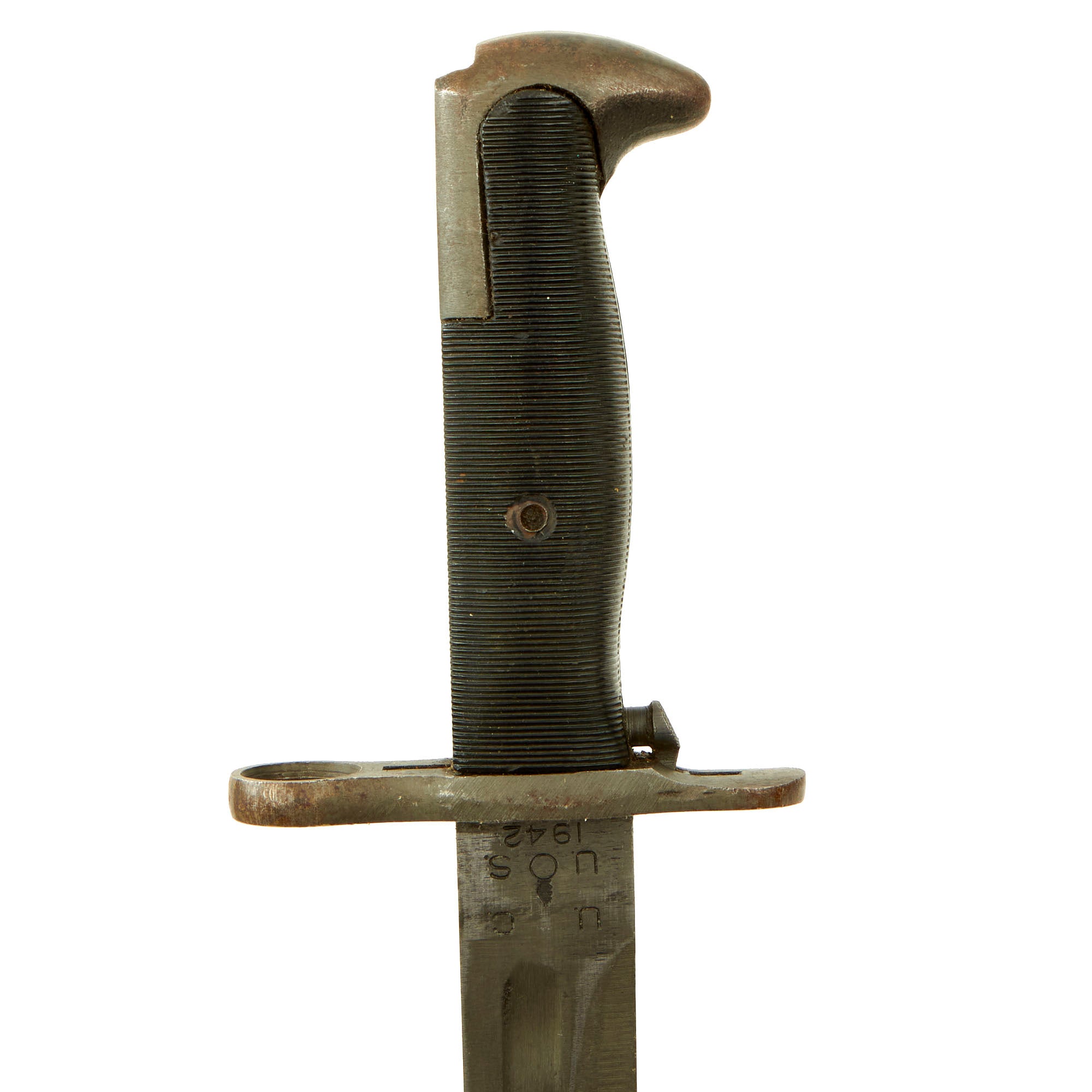 Original Item: Only One Available. This is a very good condition U.S. M1942 bayonet for the M1 Garand Rifle, complete with the correct WWII Issue M3 fiberglass scabbard. Technically, this bayonet is considered an M1905 bayonet by the U.S. Army, manufactured in 1942 with plastic ribbed grips. The M1 Garand rifle was designed to take the same blade bayonet as the M1903 Springfield rifle, so at the beginning of the war they were issued with bayonets originally made for those rifles. To keep up with Wartime production, new orders were placed for a version of the M1905 bayonet with plastic grips, and collectors use the designation M1942 for these bayonets, made from 1942 to 1943. Six civilian firms produced 1,540,578 M1905 bayonets from April 1942 to May 1943.