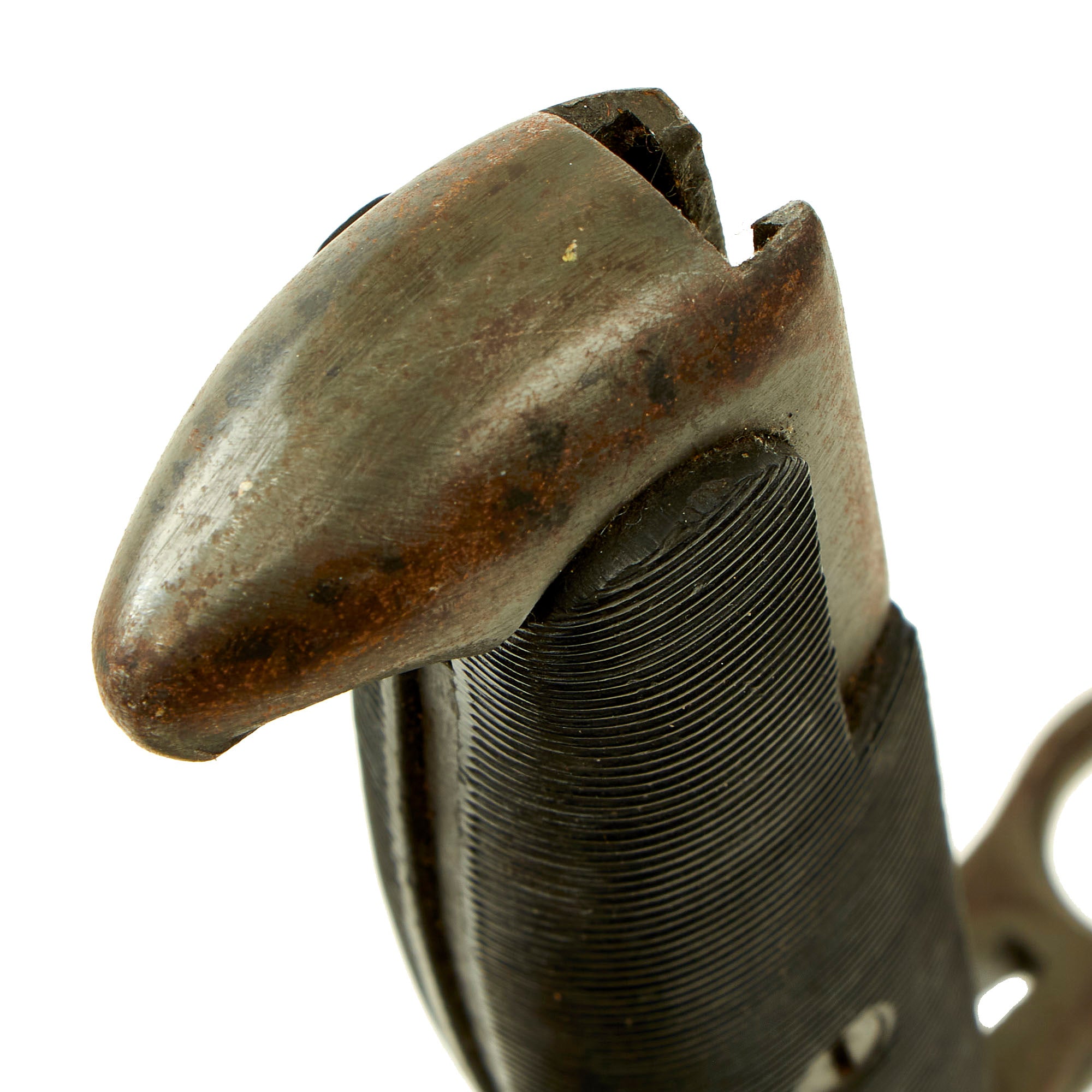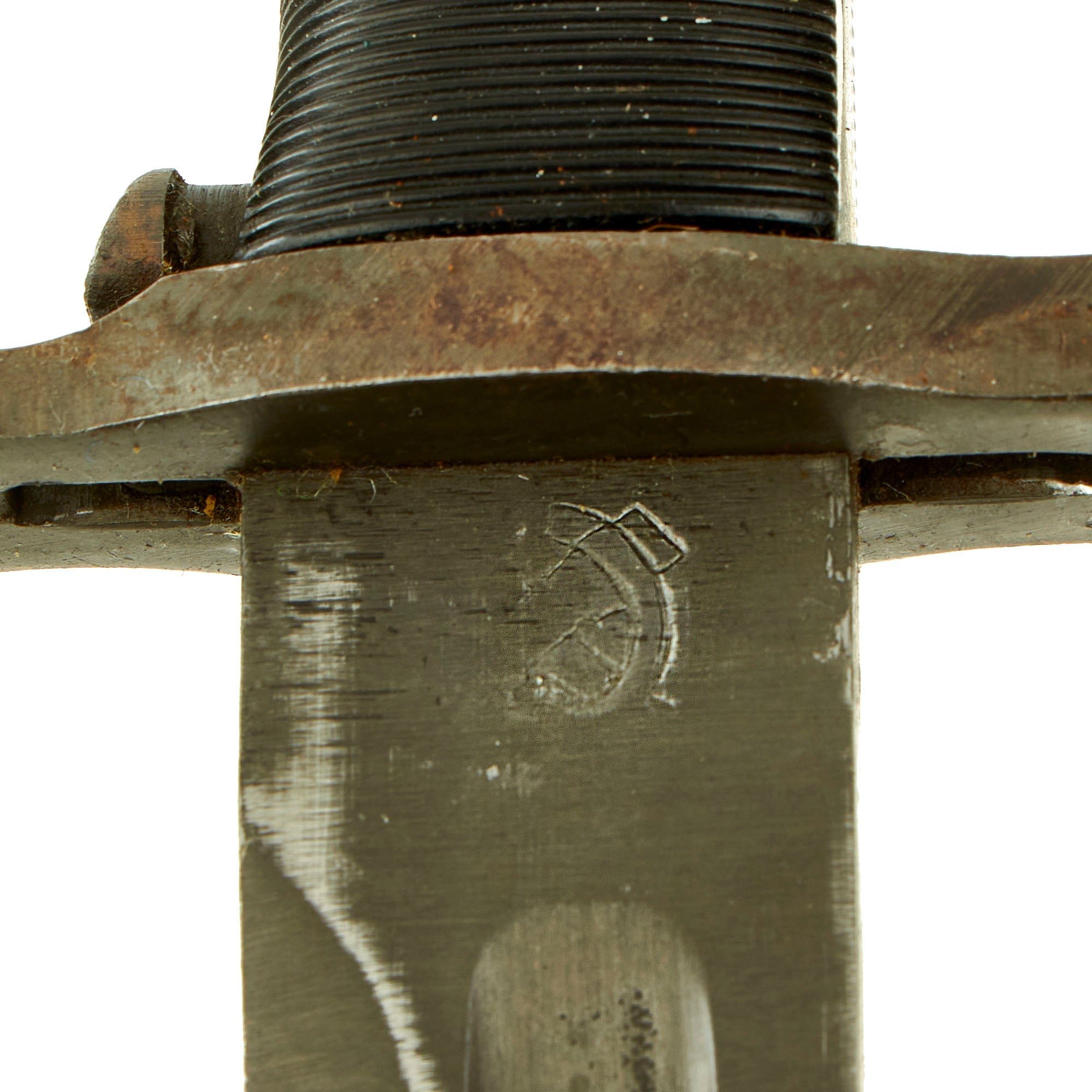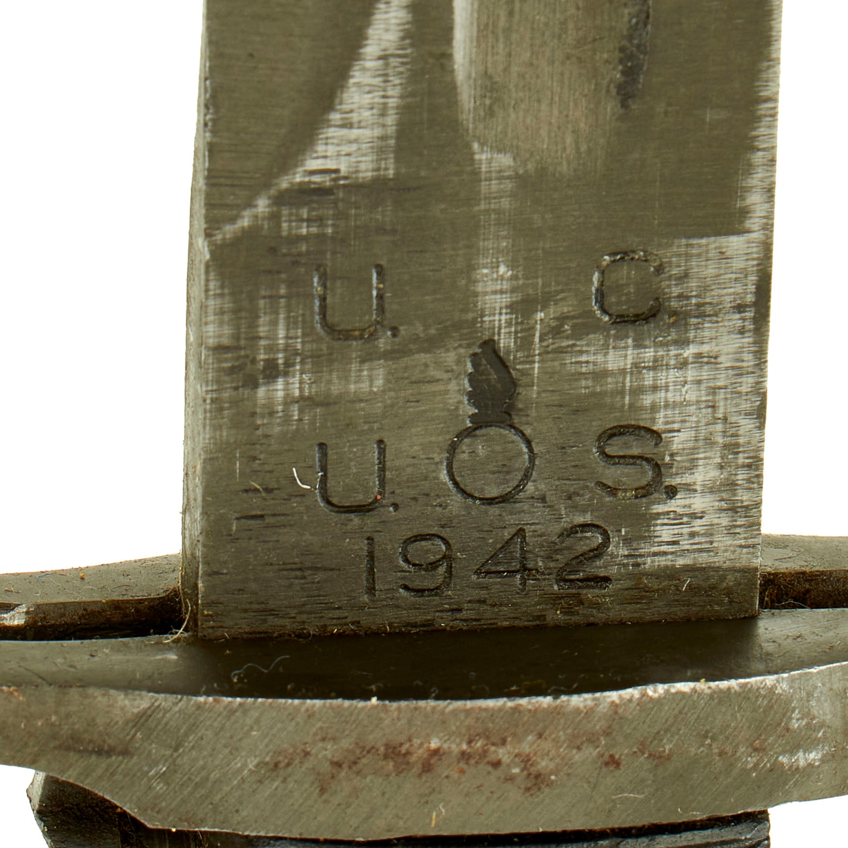 The blade ricasso is marked with maker U C (Utica Cutlery) above U.S. around the Ordnance flaming bomb. Below this is the manufacture date of 1942. The reverse ricasso has the U.S. Ordnance crossed cannons proof mark. The parkerized finish on the blade and handle is in good condition, with the expected wear of age. The tip of the bayonet has had some sharpening, but the majority of the edge is still the original factory grind.