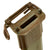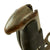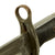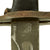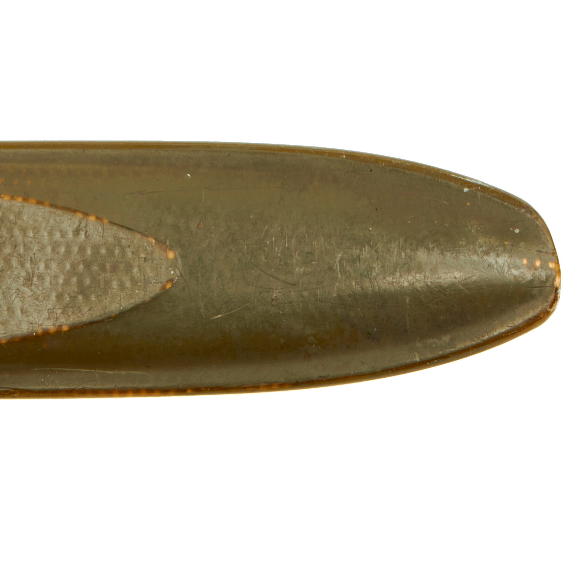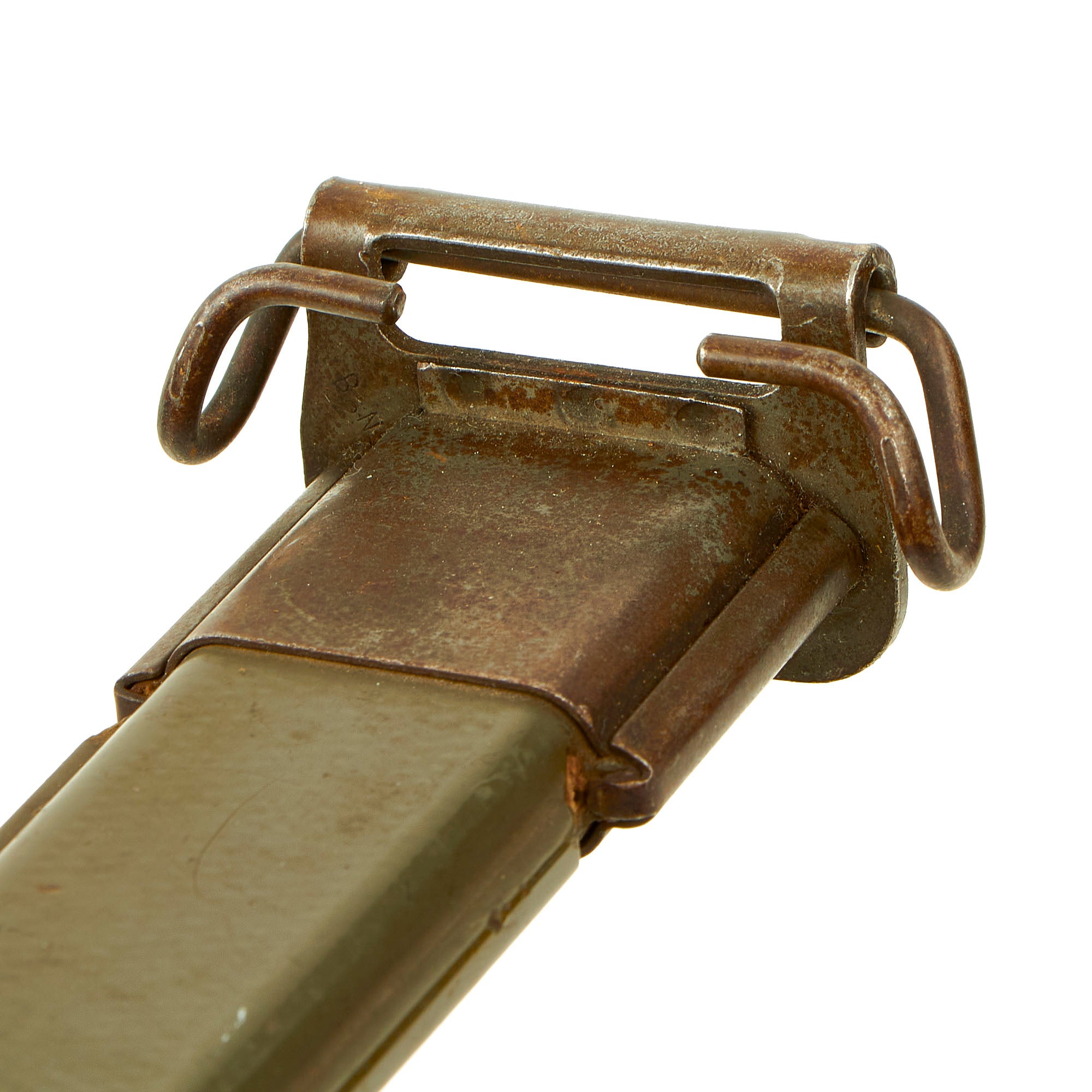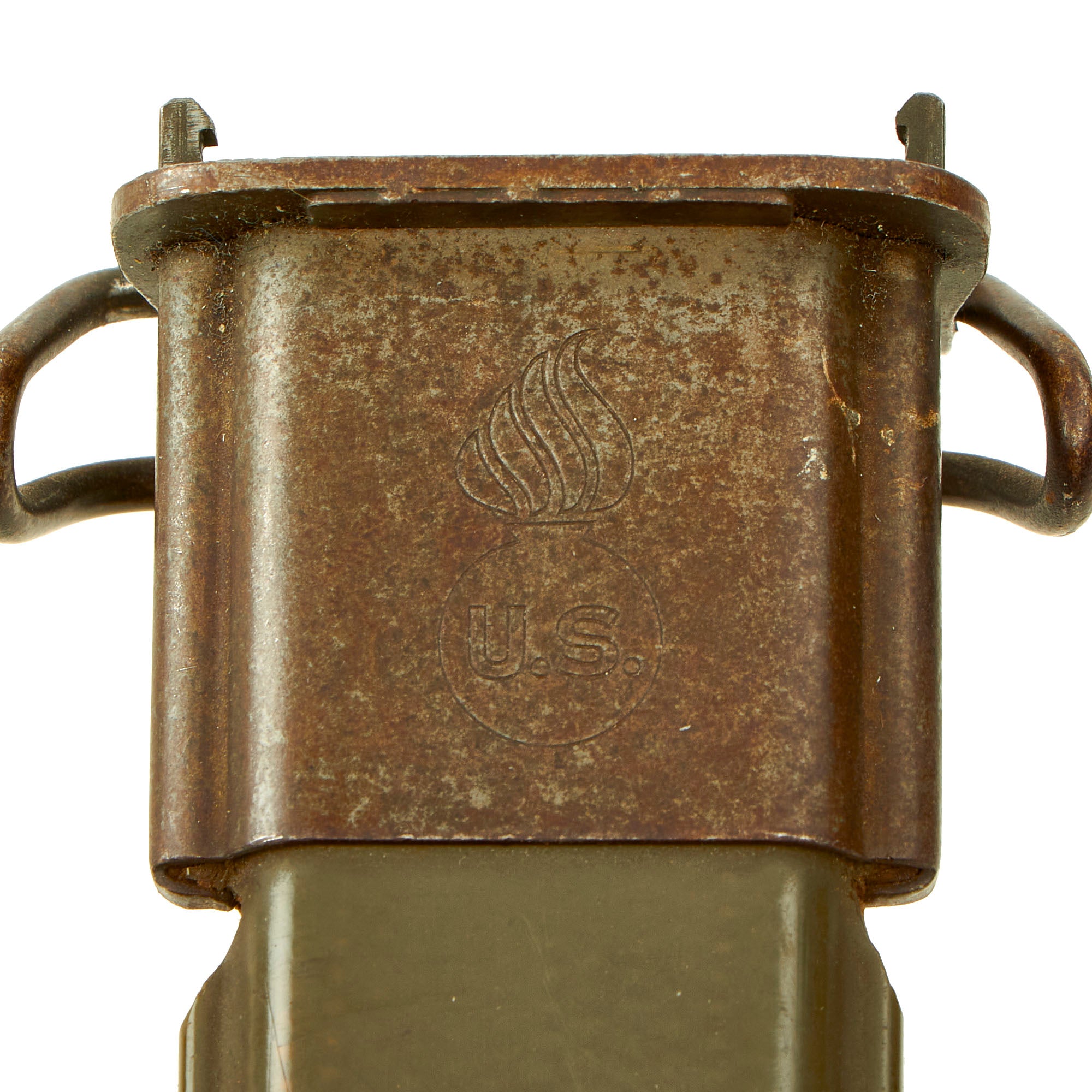 The original M3 scabbard is marked U.S. on the parkerized steel throat over the "Flaming Bomb", and is in good condition. The B N marking on the underside of the metal throat lip indicates manufacture by Beckwith Manufacturing, who produced a variety of thermoplastic impregnated cotton fabric scabbards during the war. The N is for New England Pressed Steel, who made the steel throats under contract with Beckwith. The finish on the throat is worn, with just a bit of corrosion. The scabbard body has no cracks or major chips, and the paint only shows minor wear on the edges.