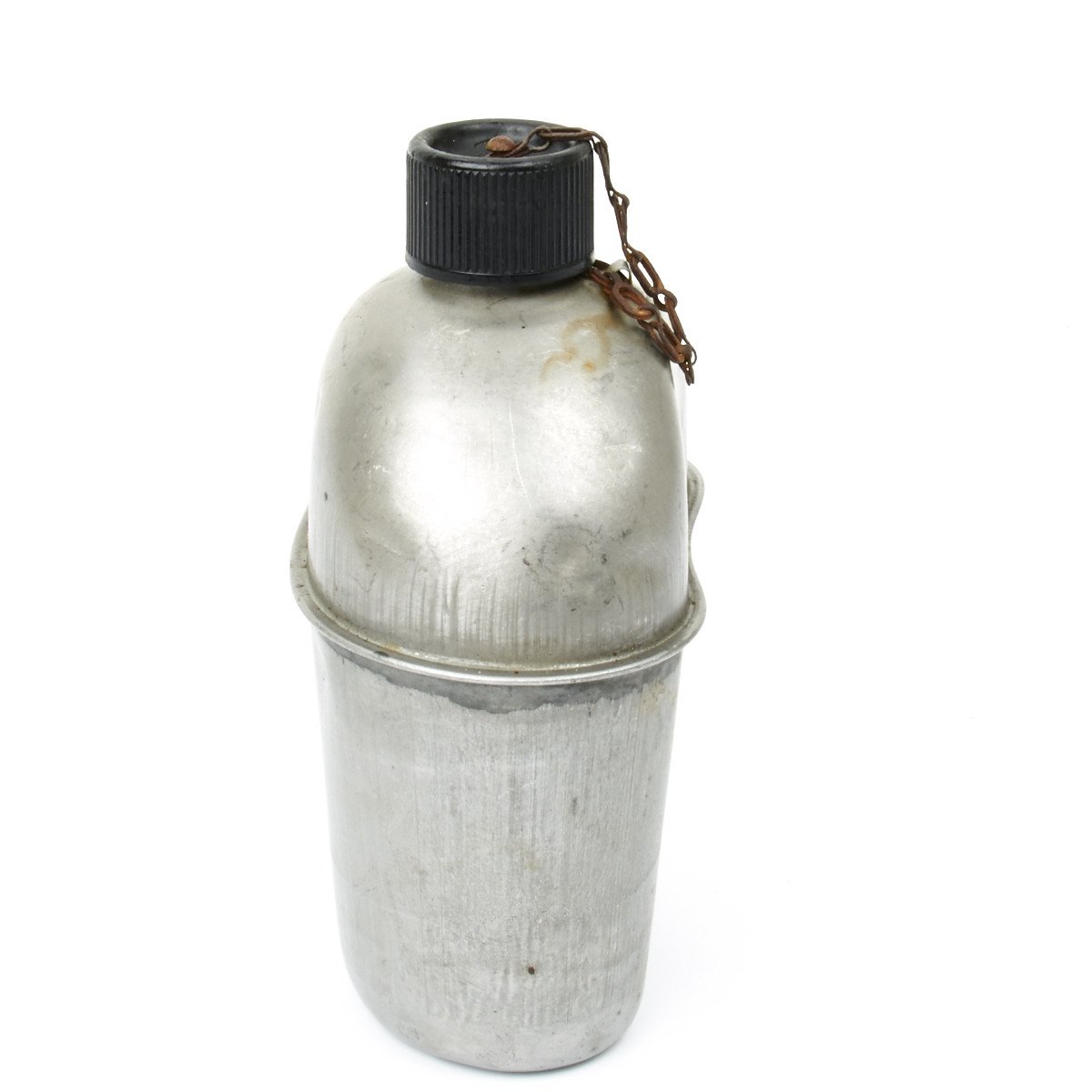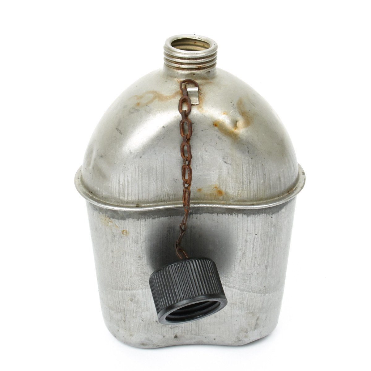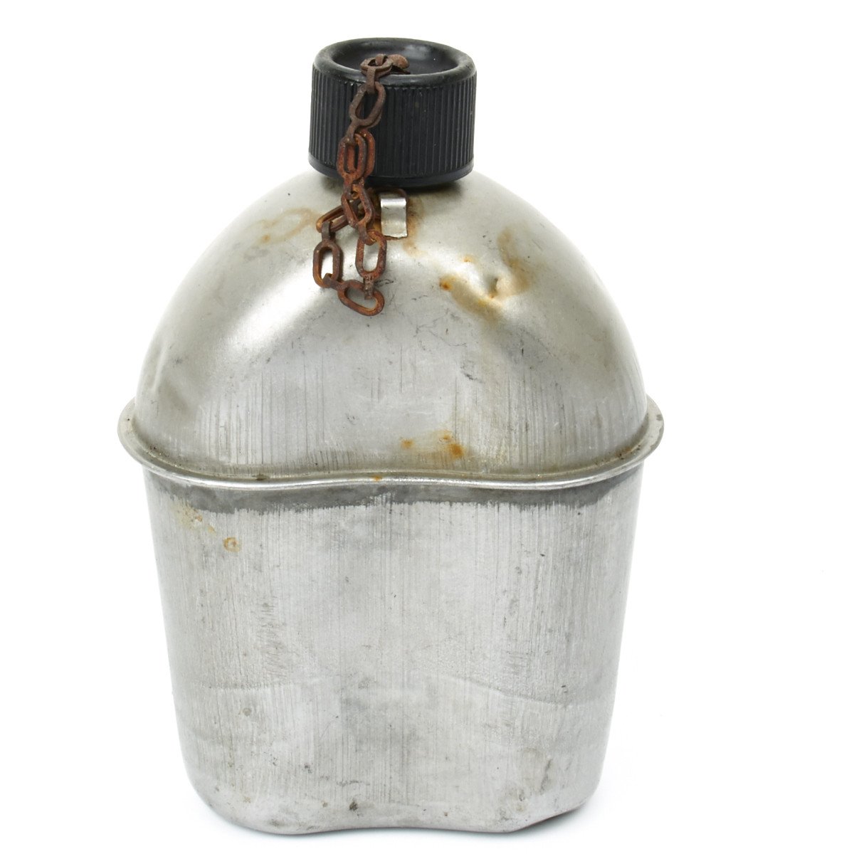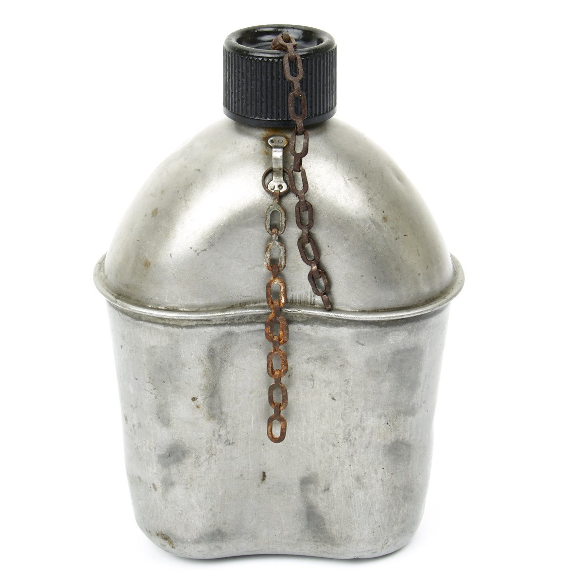 Original Item: Original WW2 marked and dated M-1942 Aluminum canteen with cap. The Model 1942 had a horizontal seam and was perfect for holding the cup securely. Canteen is constructed of aluminum and complete with the black cap. No cups or covers are included, this is just the bottle, cap, and chain (chain is reproduction).