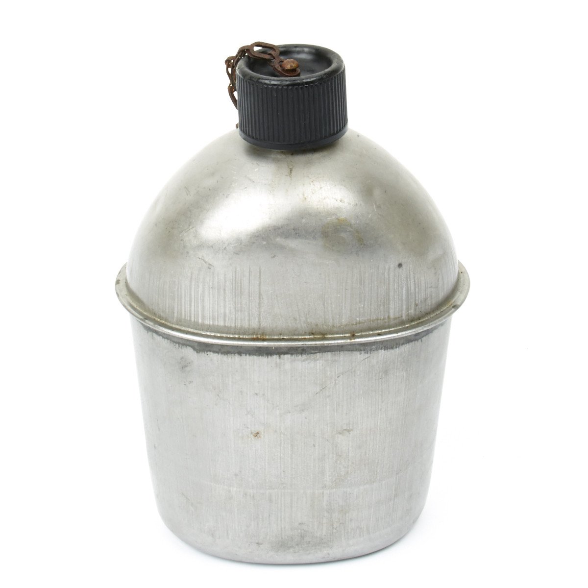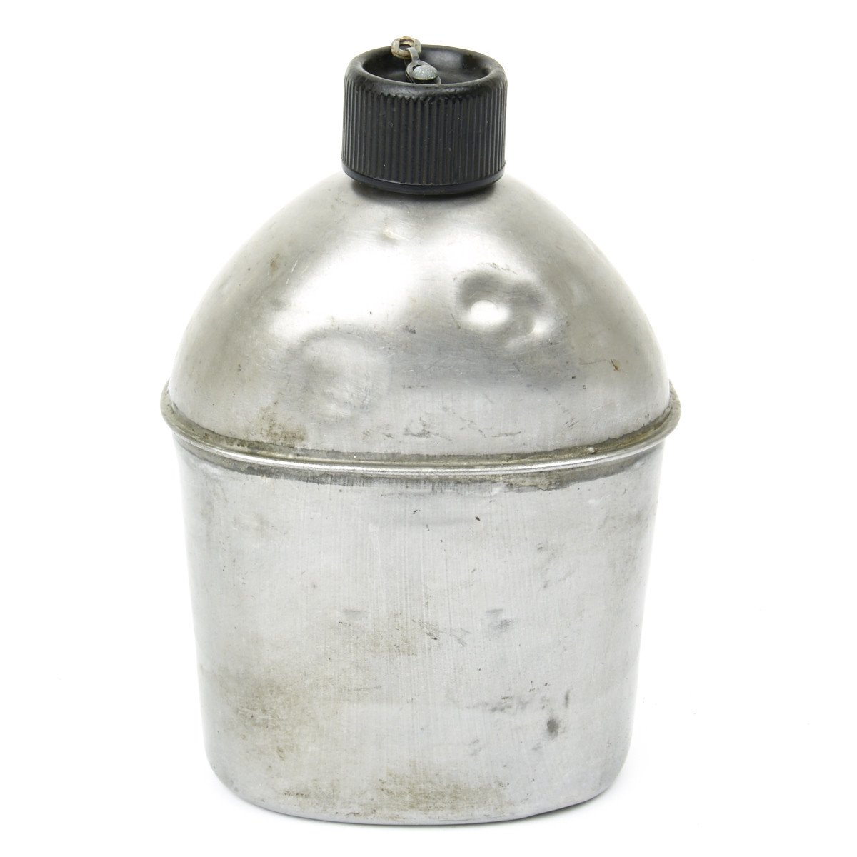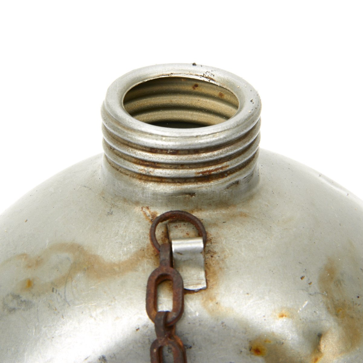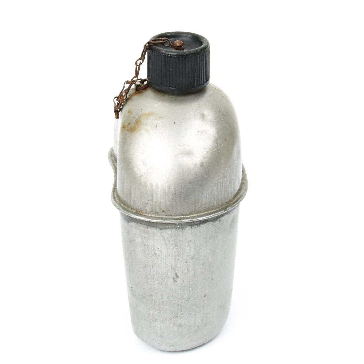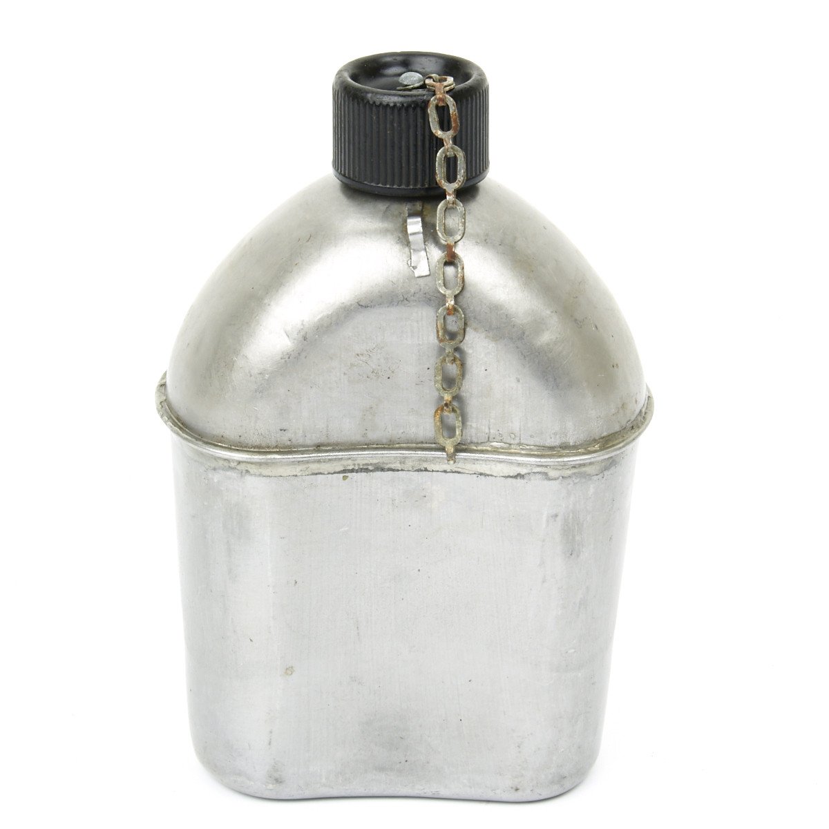 Original Item: Original WW2 marked and dated M-1942 Aluminum canteen with cap. The Model 1942 had a horizontal seam and was perfect for holding the cup securely. Canteen is constructed of aluminum and complete with the black cap. No cups or covers are included, this is just the bottle, cap, and chain (chain is reproduction).