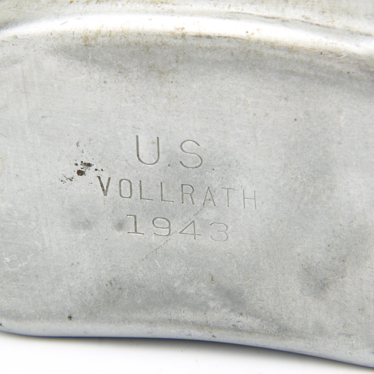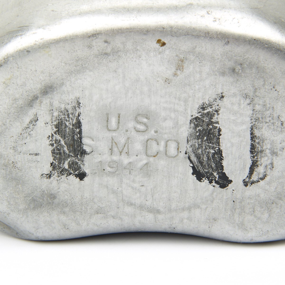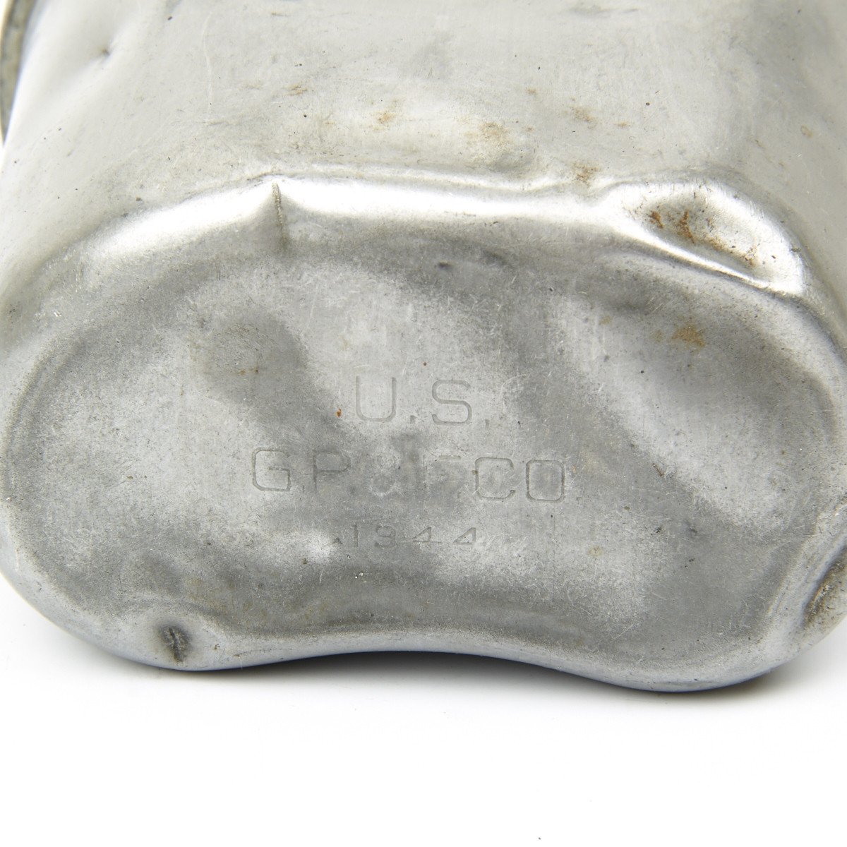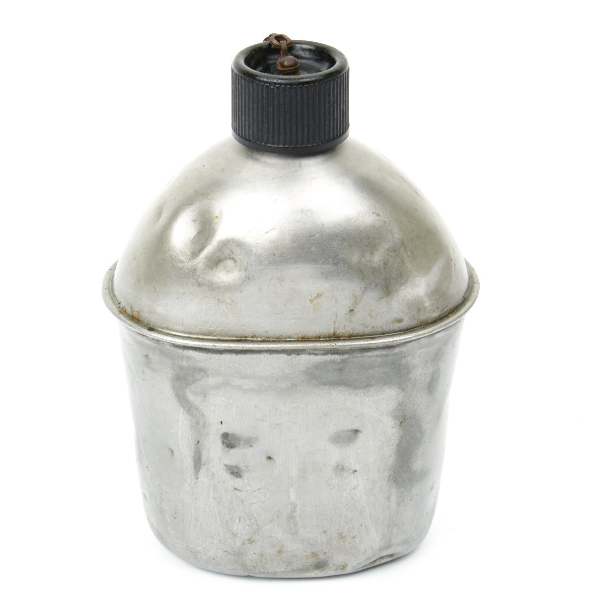 Original Item: Original WW2 marked and dated M-1942 Aluminum canteen with cap. The Model 1942 had a horizontal seam and was perfect for holding the cup securely. Canteen is constructed of aluminum and complete with the black cap. No cups or covers are included, this is just the bottle, cap, and chain (chain is reproduction).