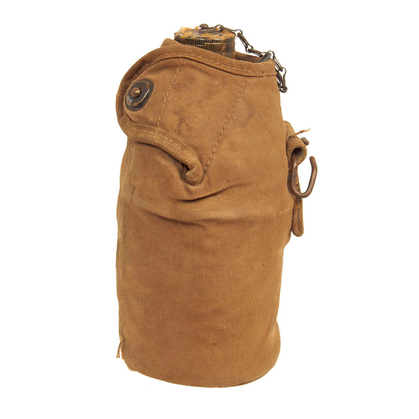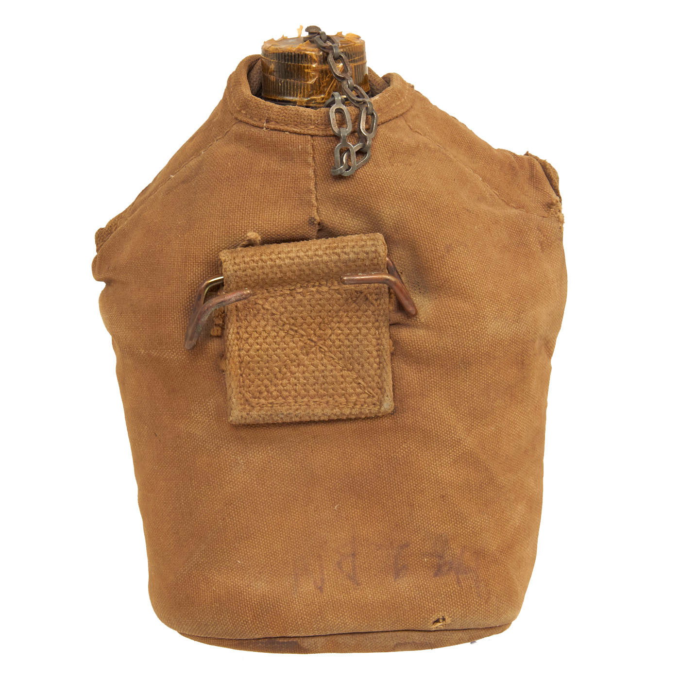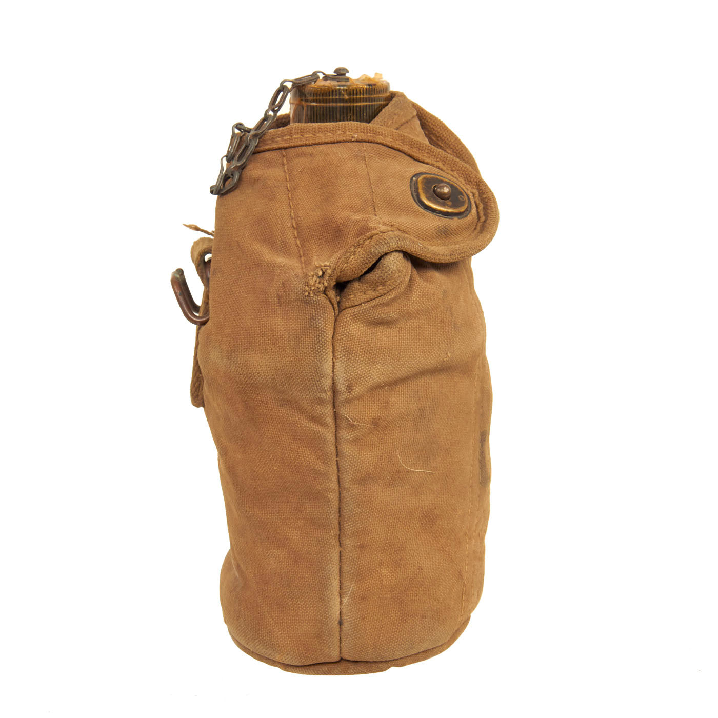 This set is in very good condition, especially the canteen itself, which has no dents and only small chips in the porcelain enamel. It still has the original stopper cap, retained by the correct galvanized steel chain, though the washer is missing. It also has a cracked cap, which appears to have been period “repaired” with tape.