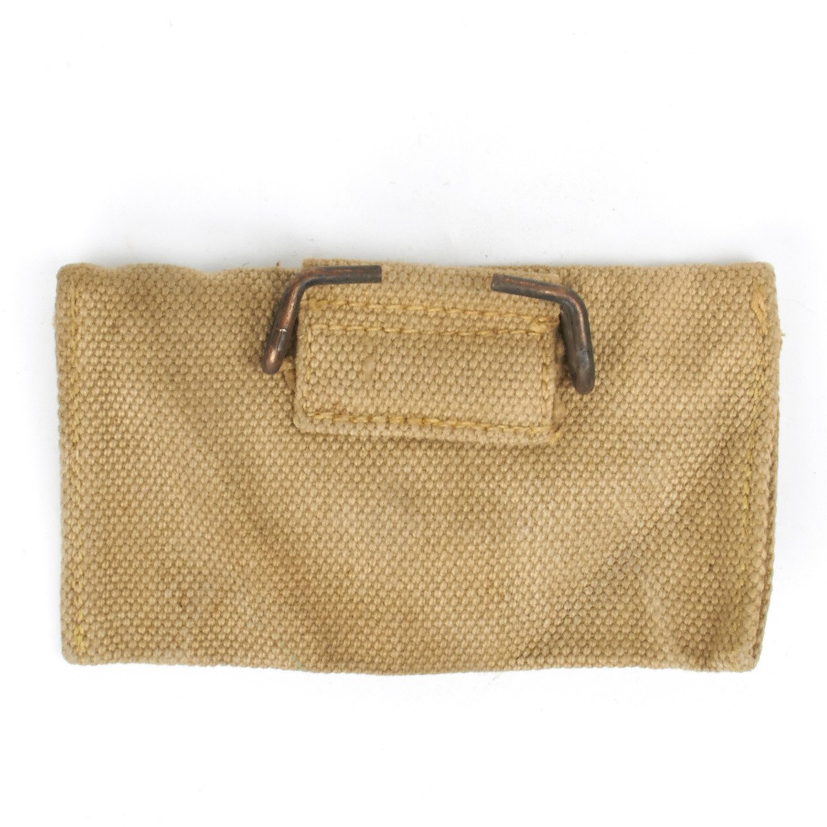 Original Item: This M1942 pouch is slightly larger than the M1924. It was necessary to enlarge the pouch to fit the later bandages that were packaged in cardboard boxes rather than the tin. Worn on a standard GI pistol belt. Most still have a visible U.S." marking on the front and some wartime manufacture marking and/or WWII dates. This model is not large enough to hold the later dressings in the cardboard boxes. All show some wear and age, but overall in good condition.