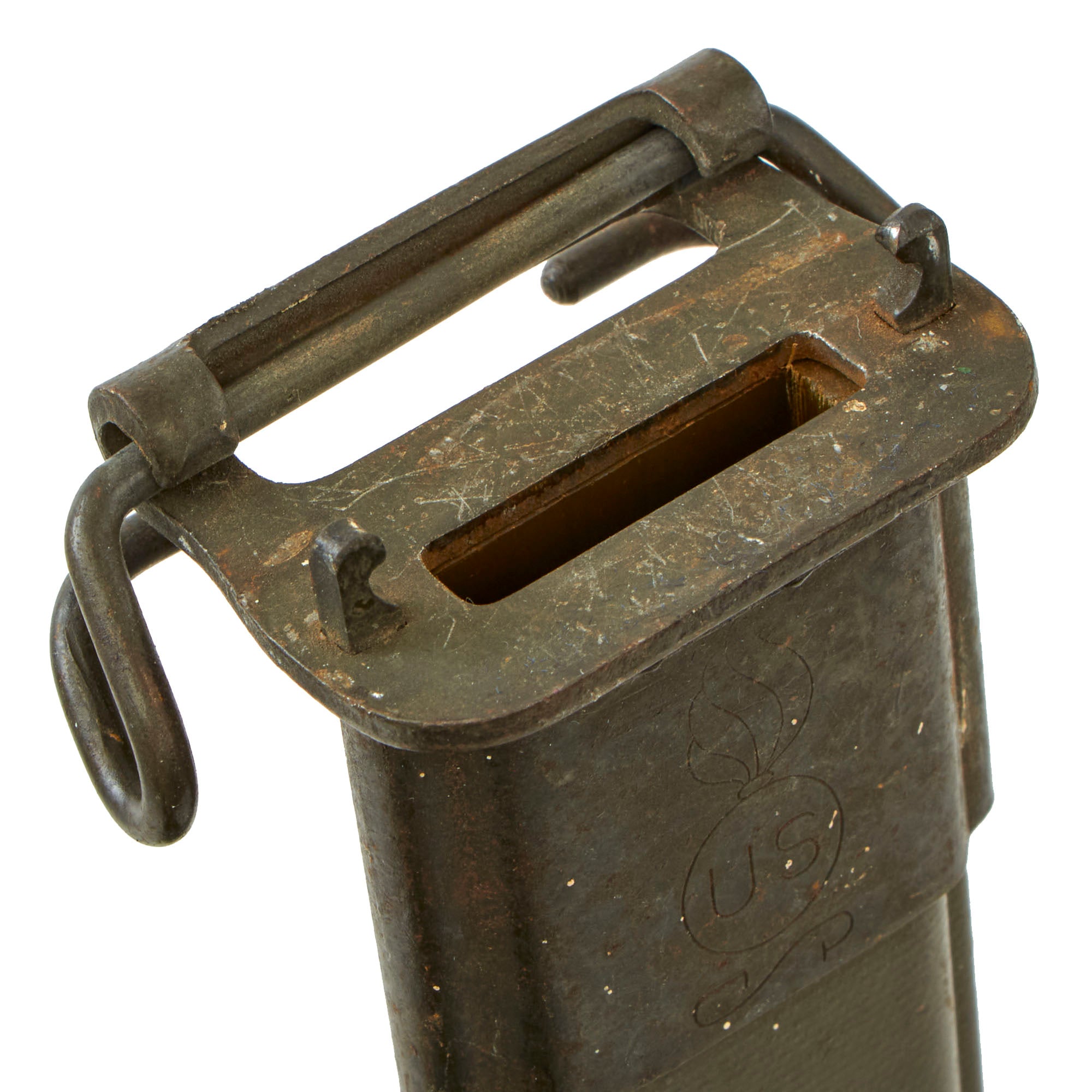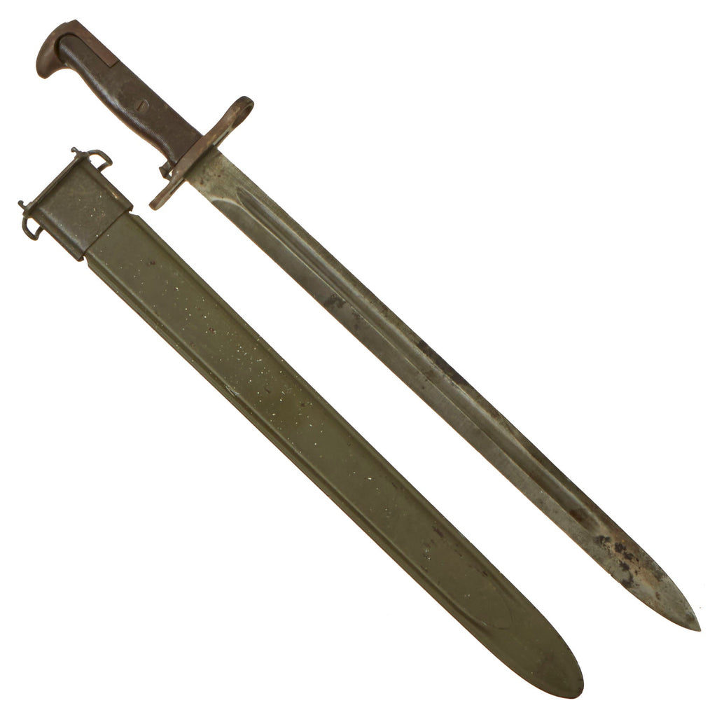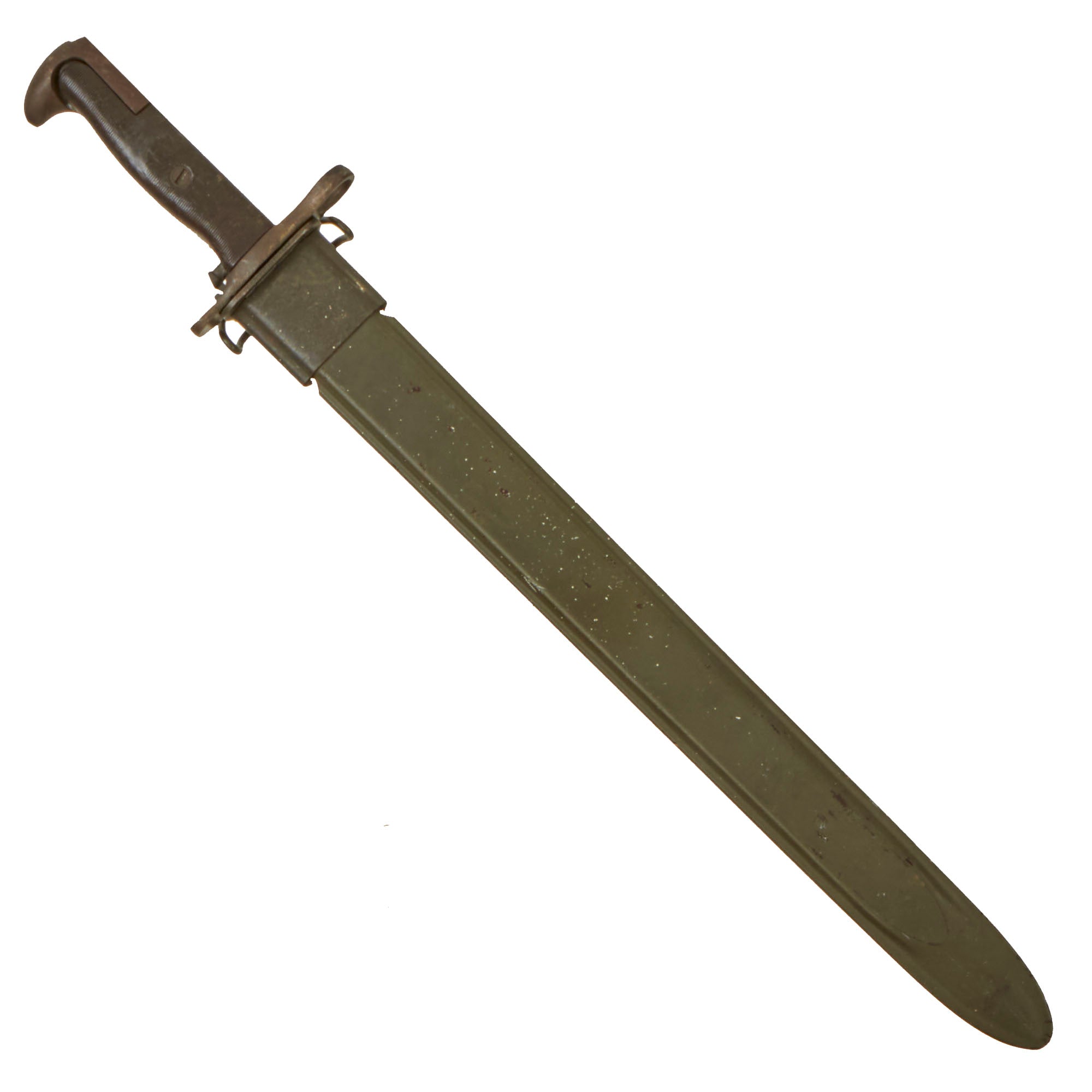 Original Item: Only One Available. This is an excellent condition U.S. M1942 bayonet for the M1 Garand Rifle, complete with the correct WWII Issue M3 fiberglass scabbard. Technically, this bayonet is considered an M1905 bayonet by the U.S. Army, manufactured in 1942 with plastic ribbed grips. The M1 Garand rifle was designed to take the same blade bayonet as the M1903 Springfield rifle, so at the beginning of the war they were issued with bayonets originally made for those rifles. To keep up with Wartime production, new orders were placed for a version of the M1905 bayonet with plastic grips, and collectors use the designation M1942 for these bayonets, made from 1942 to 1943. Six civilian firms produced 1,540,578 M1905 bayonets from April 1942 to May 1943.