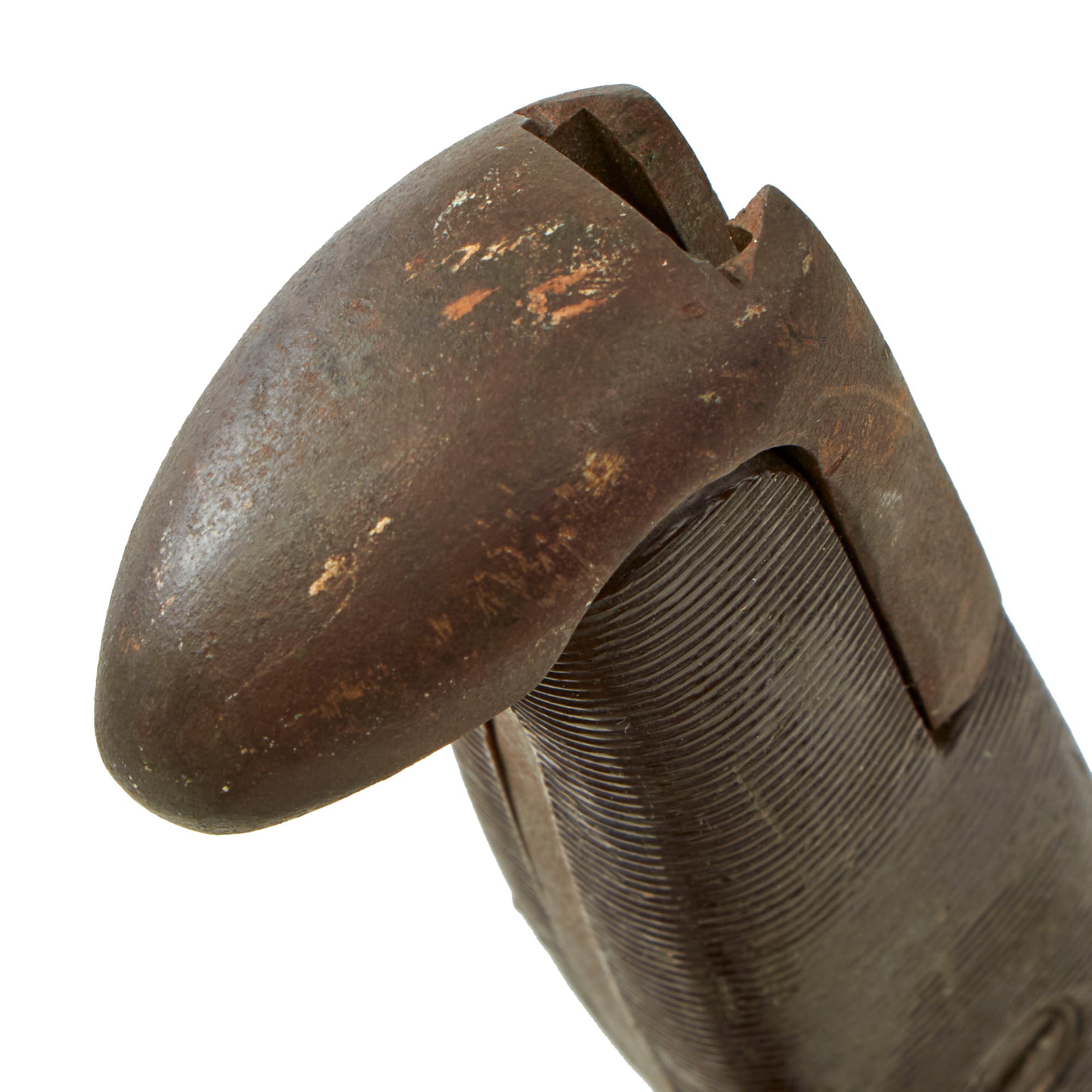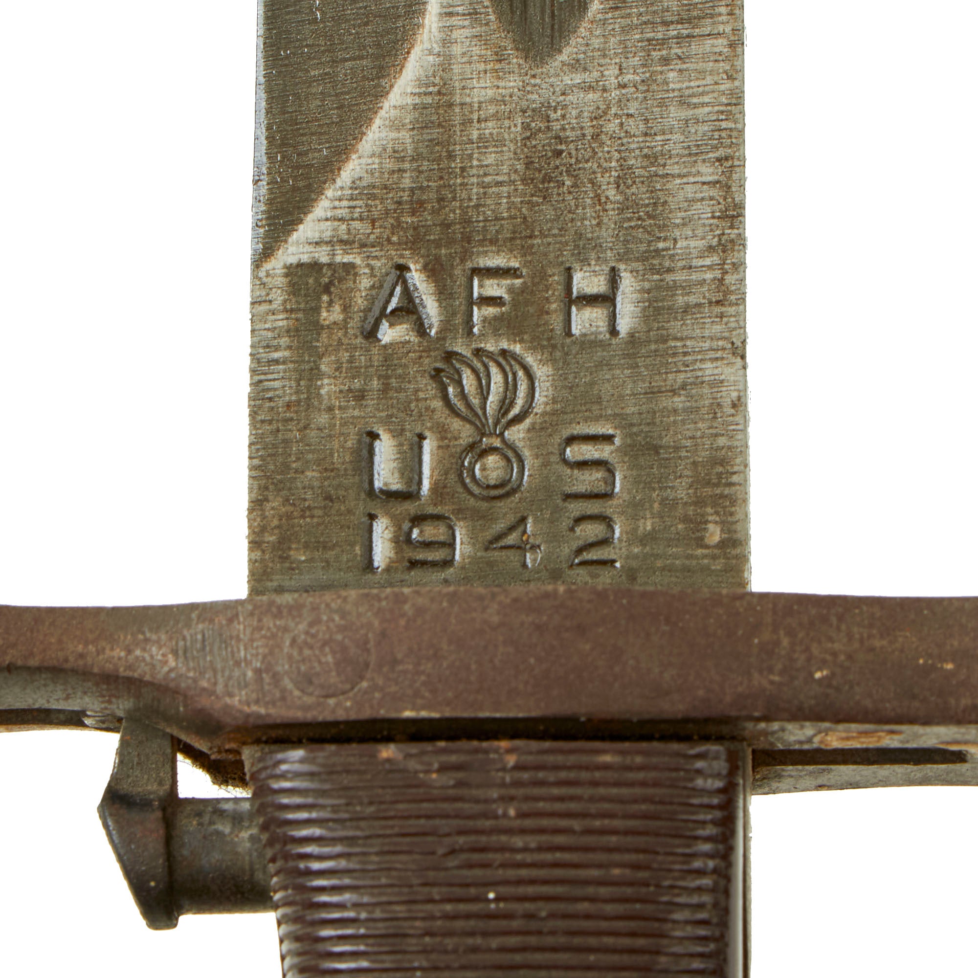 The blade ricasso is marked by maker A. F. H. (American Fork & Hoe of Geneva, Ohio) above U.S. around the Ordnance flaming bomb. Below this is the manufacture date of 1942. The parkerized finish on the bayonet blade is retained in areas with spots of loss with oxidation, and the bayonet still has the original factory edge, with minor wear/nicks. The red grips present on this example are actually somewhat rare. The bayonet doesn't have the standard black plastic grips, instead they are made of Cellulose Acetate Butyrate, commonly called CAB. In use, it was found that this material was softened by the solvents used to remove grease in the field. As it had been found that there were sufficient supplies of the black Bakelite material, the use of CAB was discontinued in April 1943.