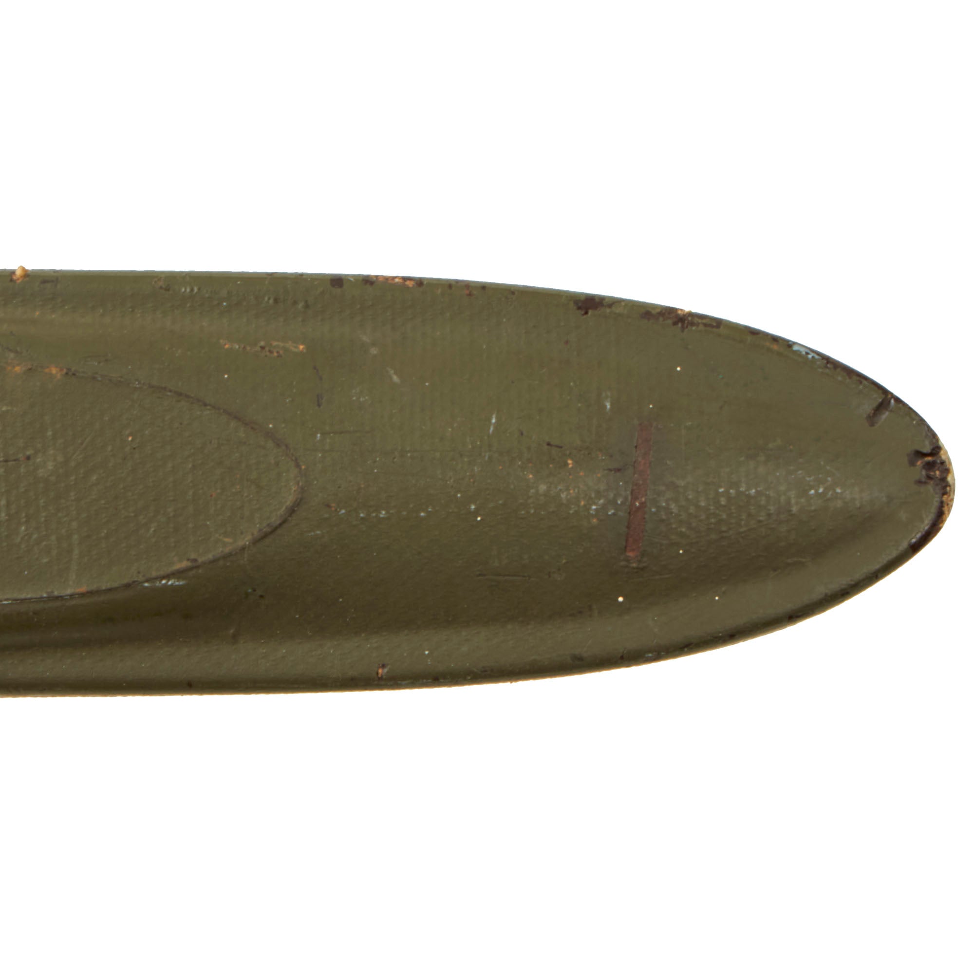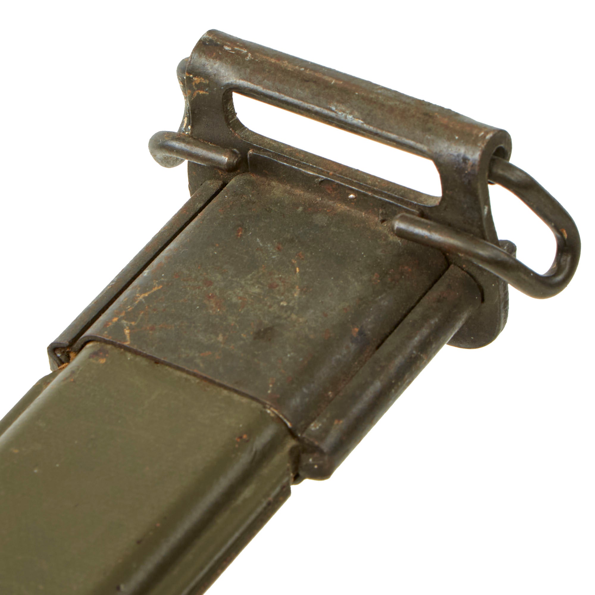 The scabbard bodies proved to be brittle in service, and it was recommended that a change in the type of plastic be made. Also, it proved almost impossible to find a paint that would adhere properly to the body, and most of those found today will have much of the paint missing. This example, however, retains almost all of its original paint with minor storage marks rubbing it off. The throat has almost none of the original finish, making this a very nice example of a rare scabbard.