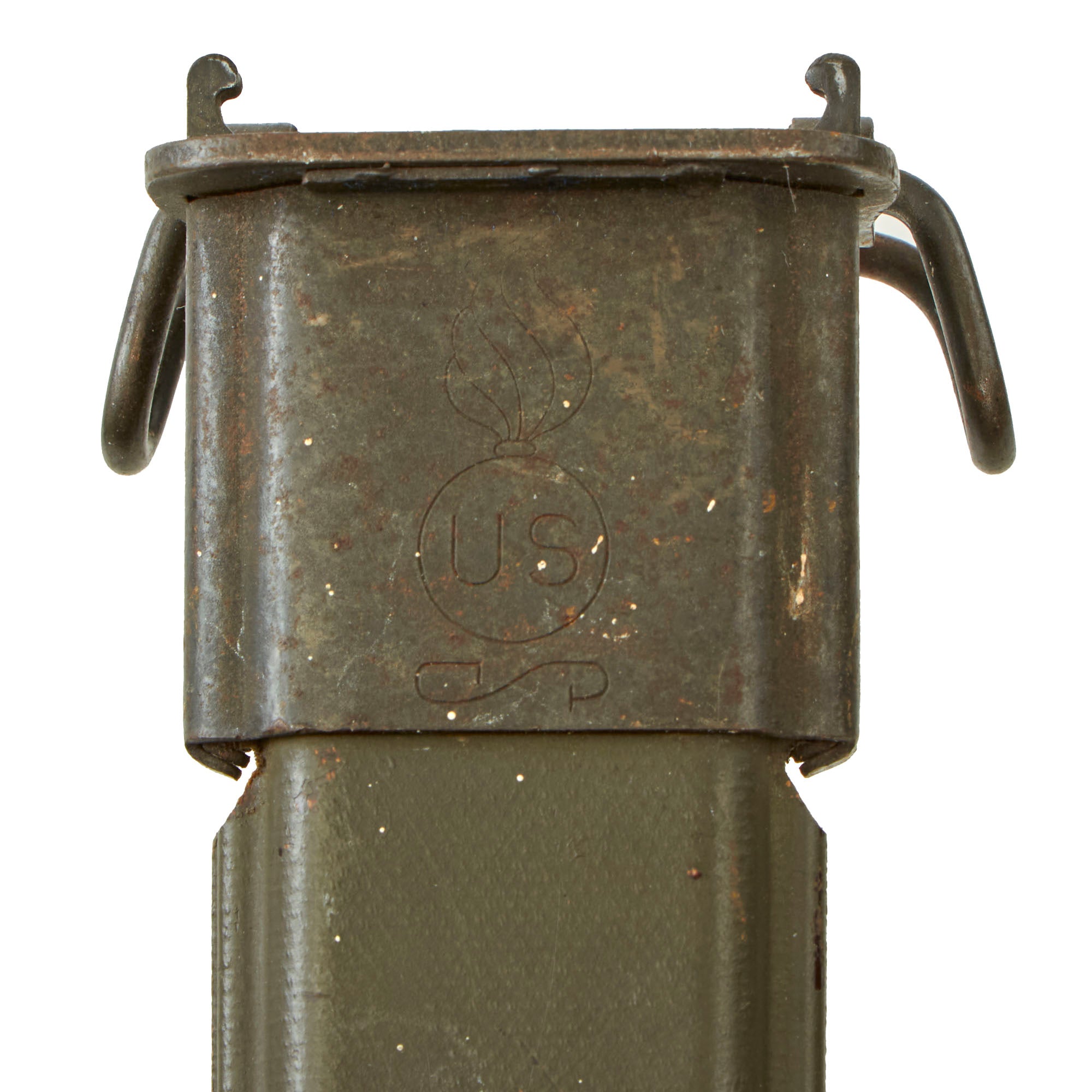The original M3 scabbard on this example is a rare example, produced by Detroit Gasket & Manufacturing Company of Detroit, Michigan. Their contract, number 374ORD 1293 was for $251,000 and called for deliveries to be made from January 1942 to June 1943. The body of the scabbard was made of different materials than Beckwith MFG Co used, consisting of cotton tubing impregnated with a phenol-formaldehyde thermosetting resin. Scabbards made of this material have a much finer weave in the body material, and the resin is a dark brown. These were marked with a sideways "Lazy S" under the "flaming bomb" on the throat.