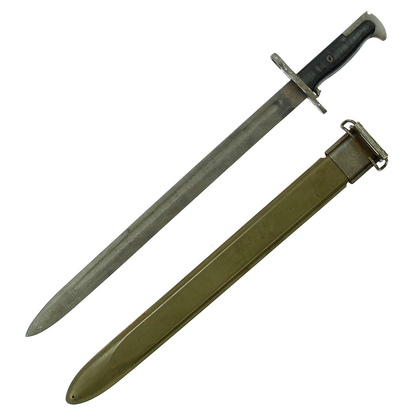 Original Item: Only One Available. This is an excellent condition U.S. M1942 bayonet for the M1 Garand Rifle, complete with the correct WWII Issue M3 fiberglass scabbard. Technically, this bayonet is considered an M1905 bayonet by the U.S. Army, manufactured in 1942 with plastic ribbed grips. The M1 Garand rifle was designed to take the same blade bayonet as the M1903 Springfield rifle, so at the beginning of the war they were issued with bayonets originally made for those rifles. To keep up with Wartime production, new orders were placed for a version of the M1905 bayonet with plastic grips, and collectors use the designation M1942 for these bayonets, made from 1942 to 1943. Six civilian firms produced 1,540,578 M1905 bayonets from April 1942 to May 1943.