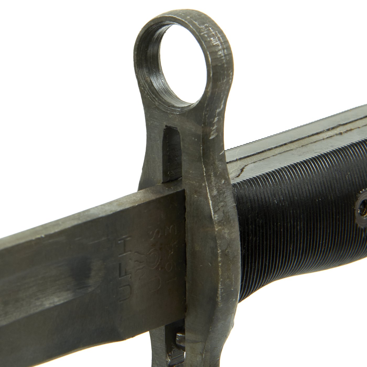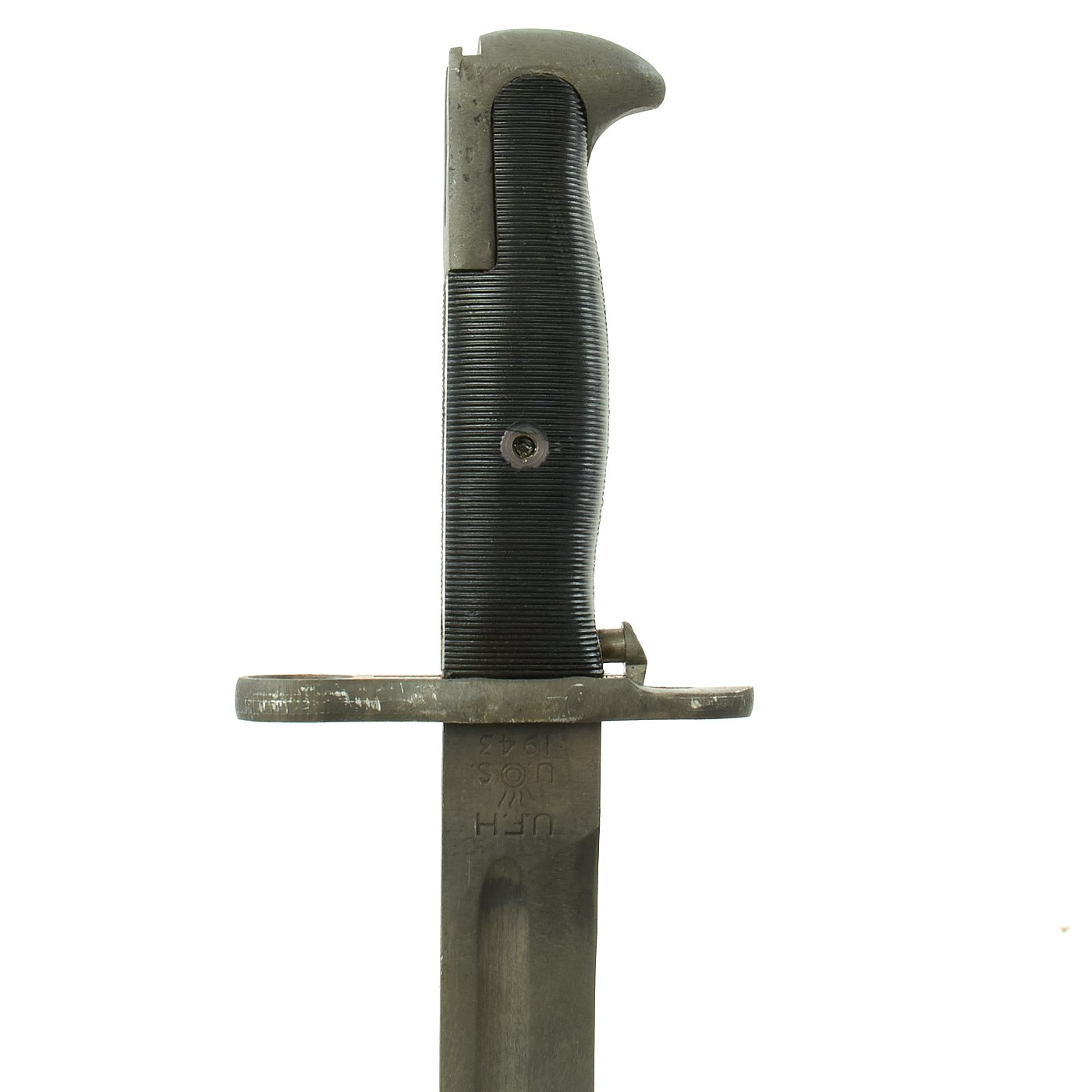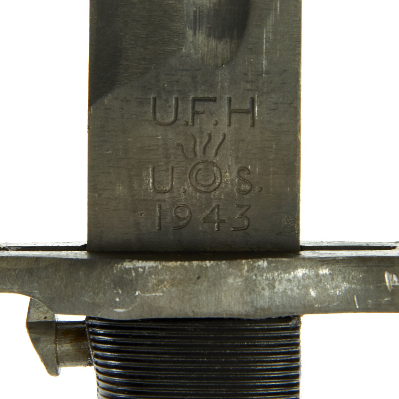 The blade ricasso is marked with maker U. F. H. (Union Fork & Hoe of Columbus, Ohio) above U.S. around the Ordnance flaming bomb. Below this is the manufacture date of 1943. The parkerized finish on the bayonet is in excellent condition, and the bayonet still seems to have the original factory edge, with minimal wear. The plastic grooved grips are pretty much in MINT condition.
