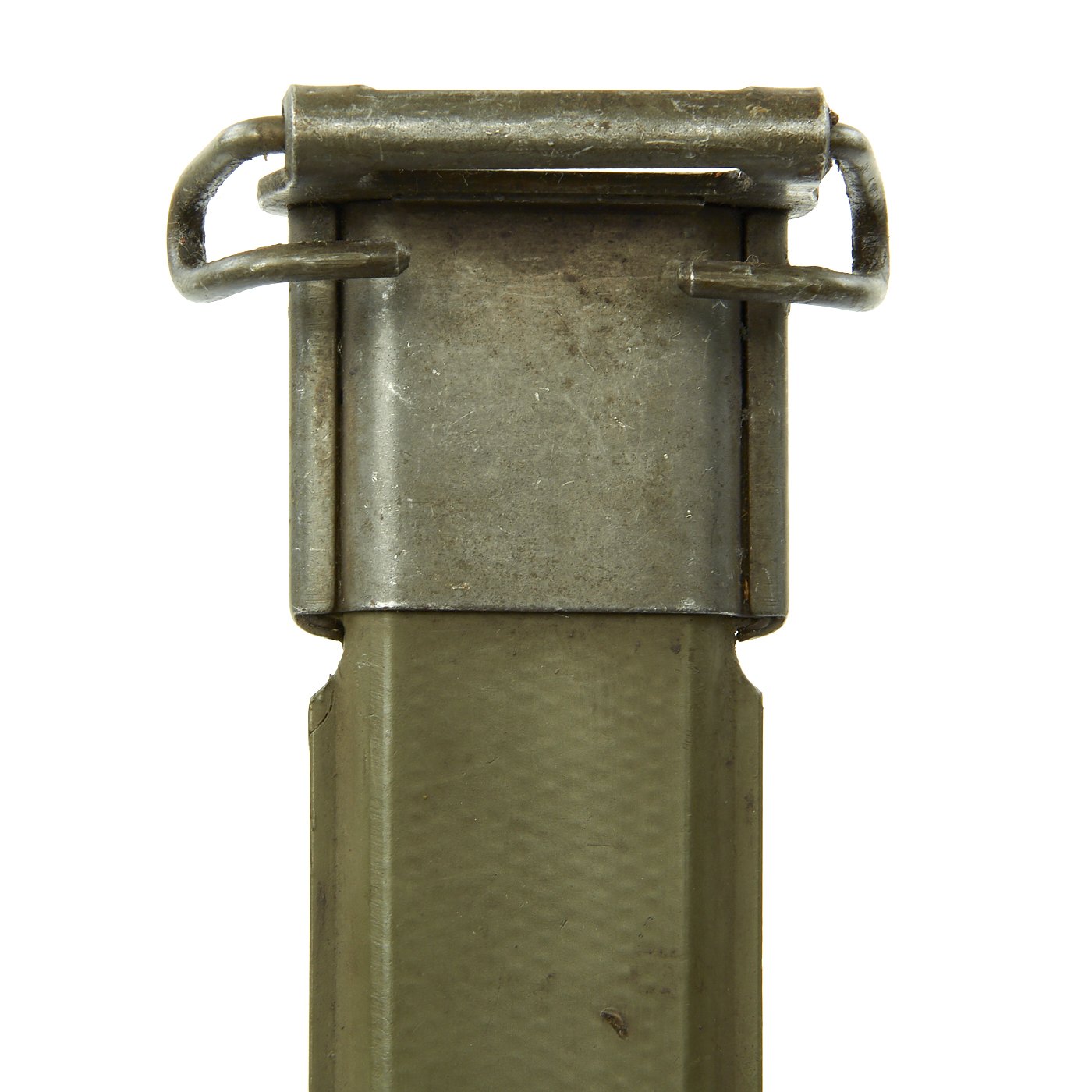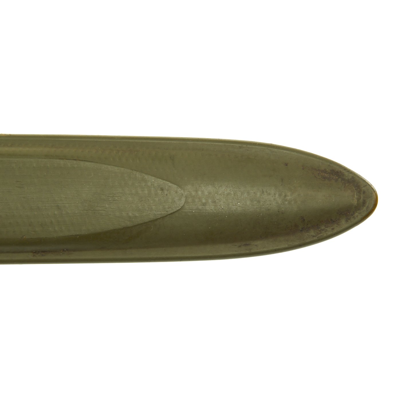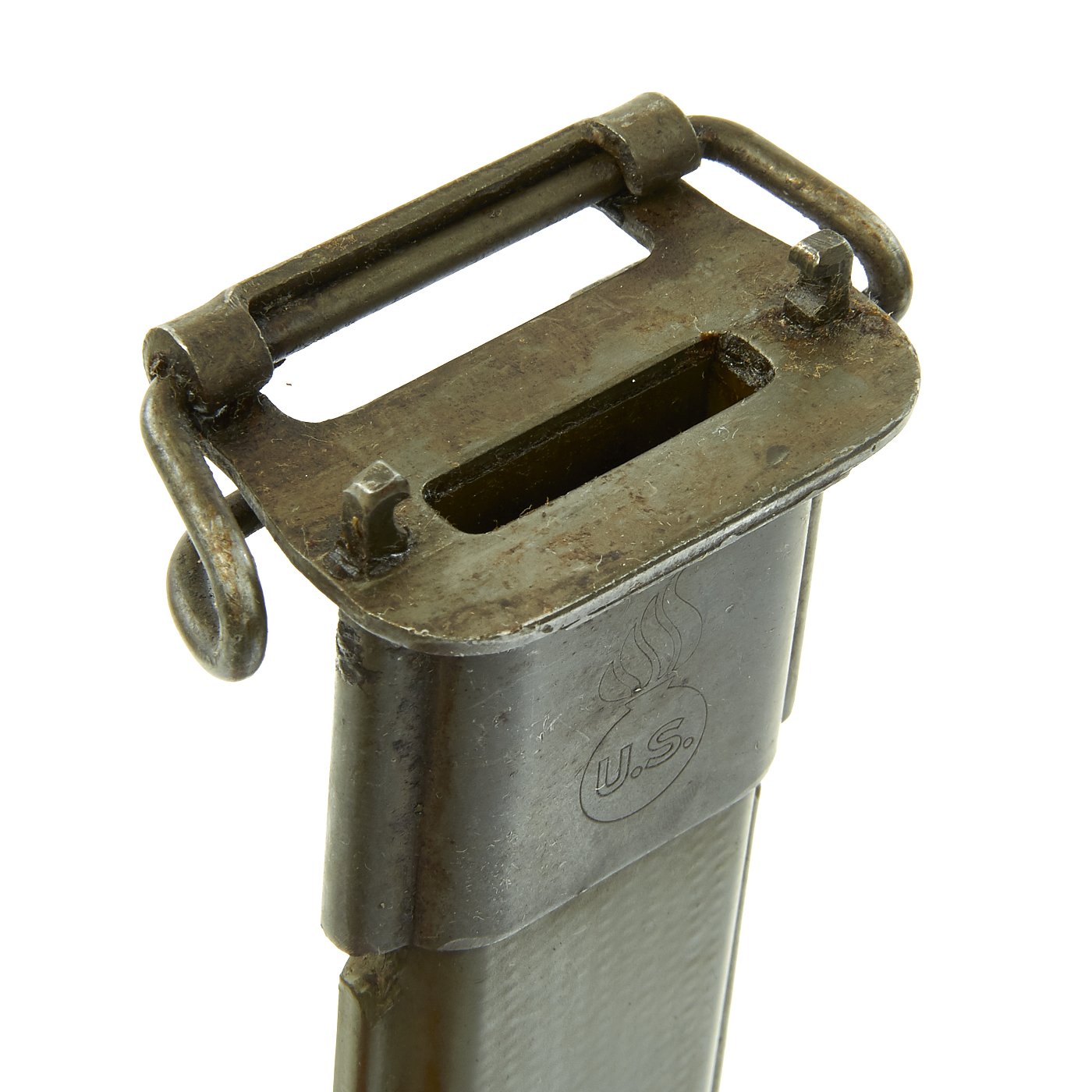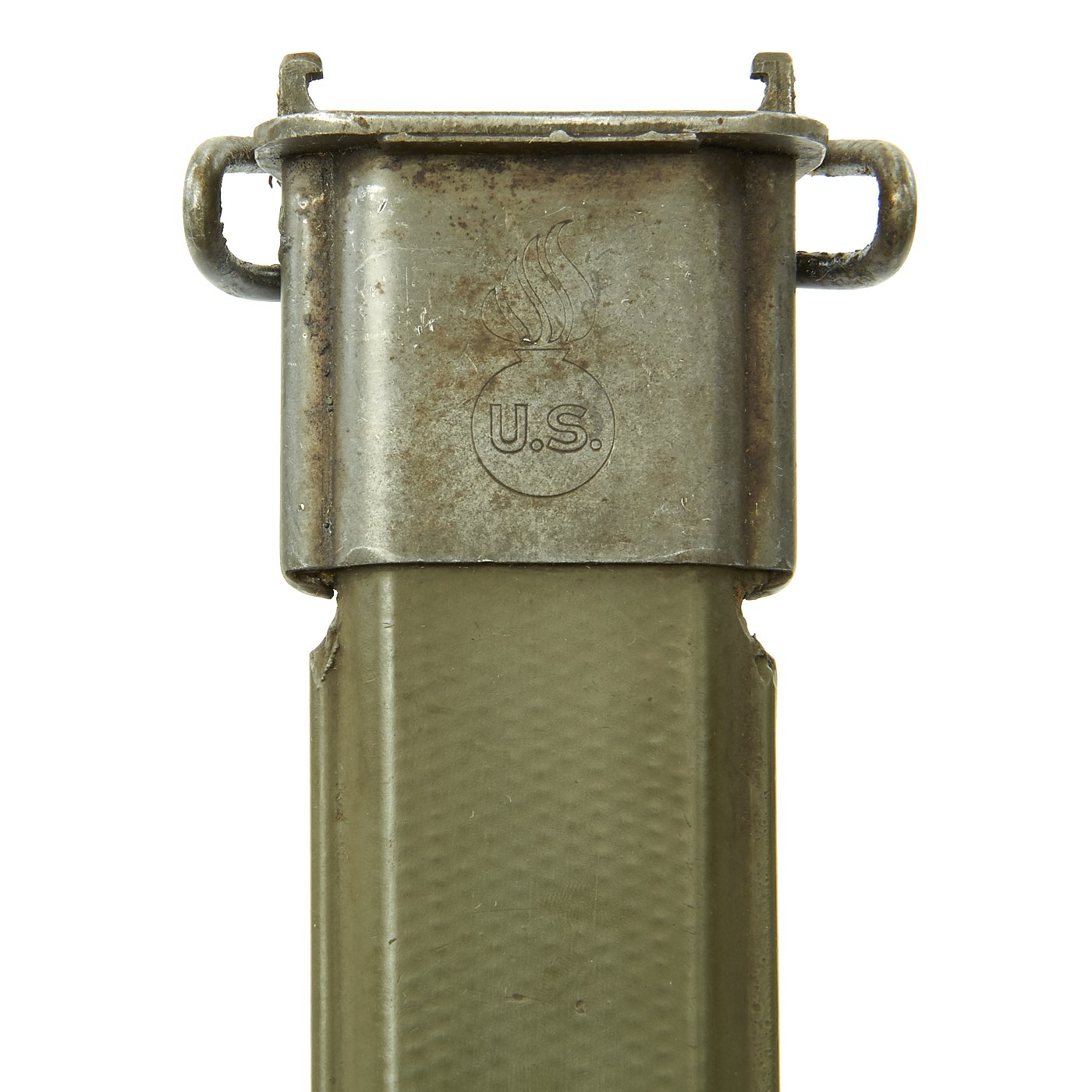 The original M3 Fiberglass scabbard is marked U.S. on the parkerized steel throat over the "Flaming Bomb", and is in excellent condition. The B N marking on the underside of the metal throat lip indicates manufacture by Beckwith Manufacturing, who produced a variety of fiberglass scabbards during the war. The N is for New England Pressed Steel, who made the steel throats under contract with Beckwith. The phosphate finish on the throat is still mostly present, with no real rust. The scabbard body has no cracks or major chips, and the original paint is still almost completely intact, with just a bit of wear.