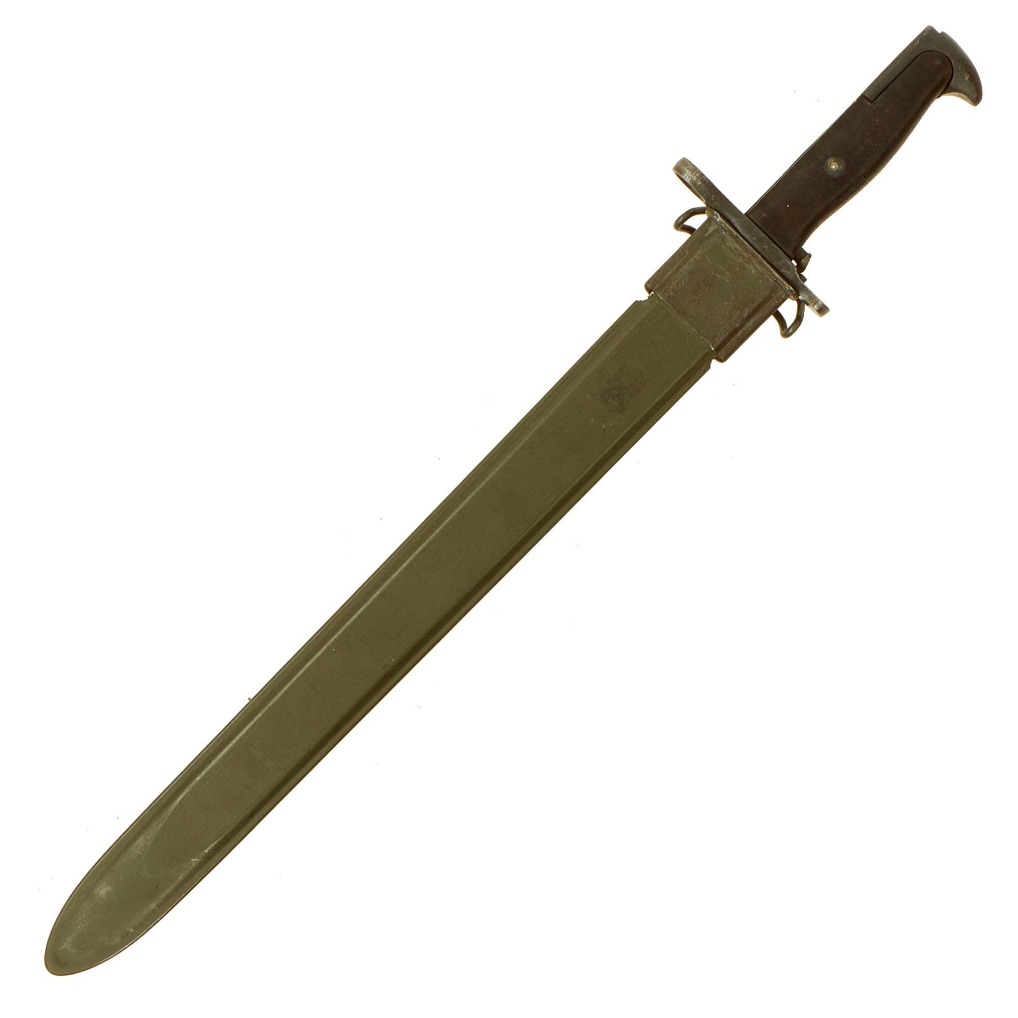 Original Item: Only One Available. This is a lovely, service worn condition U.S. M1942 bayonet for the M1 Garand Rifle, complete with the correct WWII Issue M3 scabbard. Technically, this bayonet is considered an M1905 bayonet by the U.S. Army, manufactured in 1942 with plastic ribbed grips. The M1 Garand rifle was designed to take the same bayonet as the M1903 Springfield rifle, so at the beginning of the war they were issued with bayonets originally made for those rifles. To keep up with Wartime production, new orders were placed for a version of the M1905 bayonet with plastic grips, and collectors use the designation M1942 for these bayonets, made from 1942 to 1943. Six civilian firms produced 1,540,578 M1905 bayonets from April 1942 to May 1943.