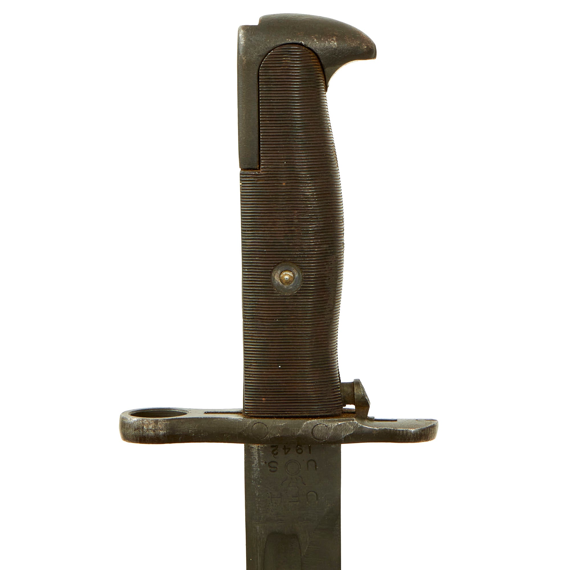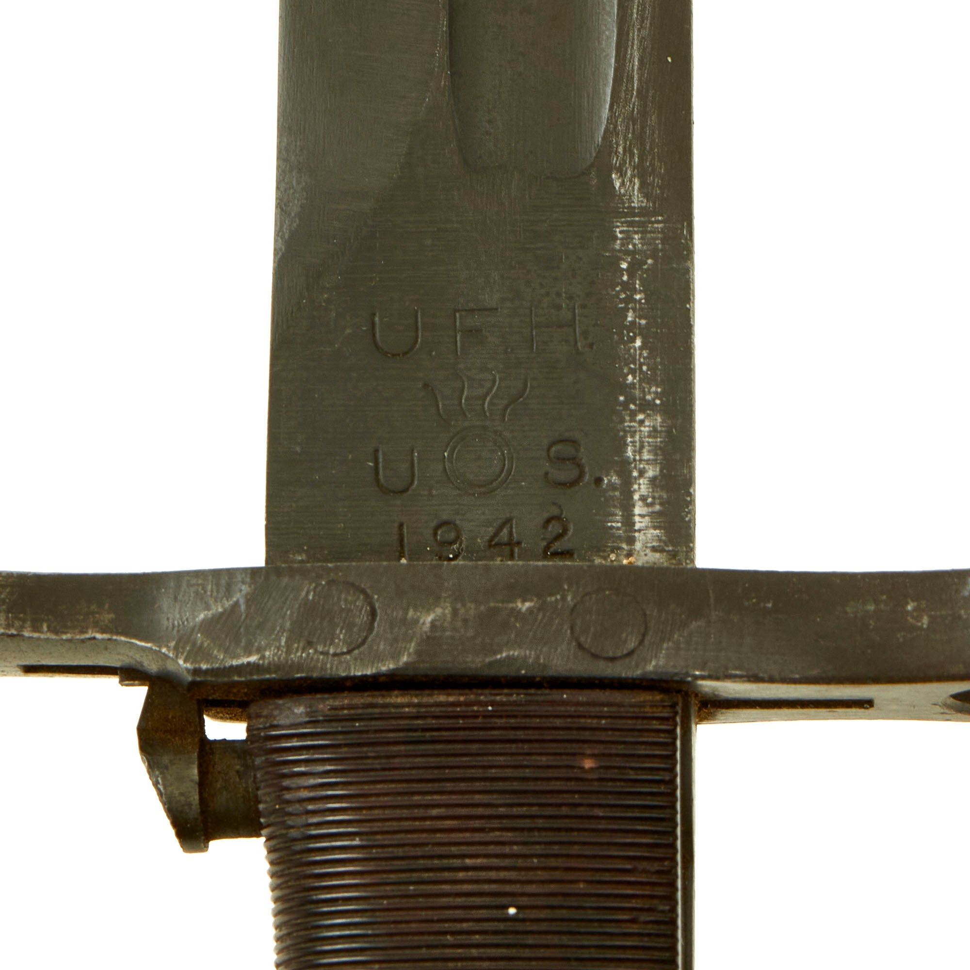 The blade ricasso is marked by maker U. F. H. (Union Fork & Hoe of Columbus, Ohio) above U. S. around the Ordnance flaming bomb. Below this is the manufacture date of 1942. The parkerized finish on the bayonet is very nice but worn. The tip of the bayonet is a little more rounded than we are used to, we believe the tip suffered a break and it was rounded off. The edge is still quite sharp, with a few nicks and edge dents. The hilt does have minor surface rust and oxidation, but the plastic grips are in good condition with a nice worn appearance.