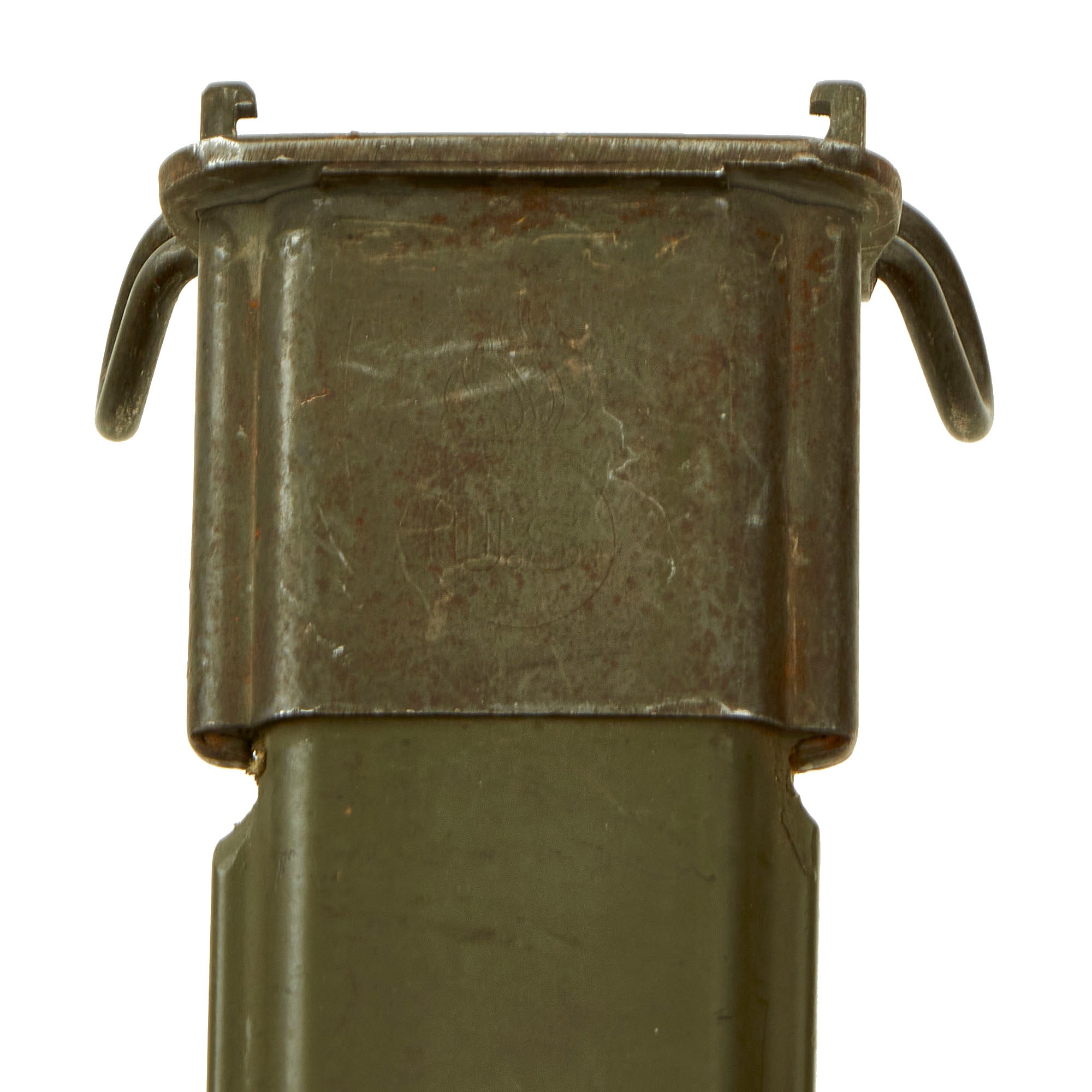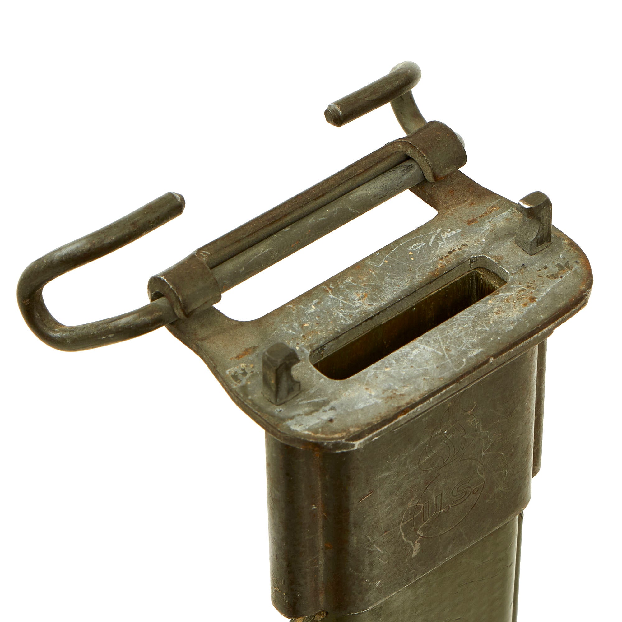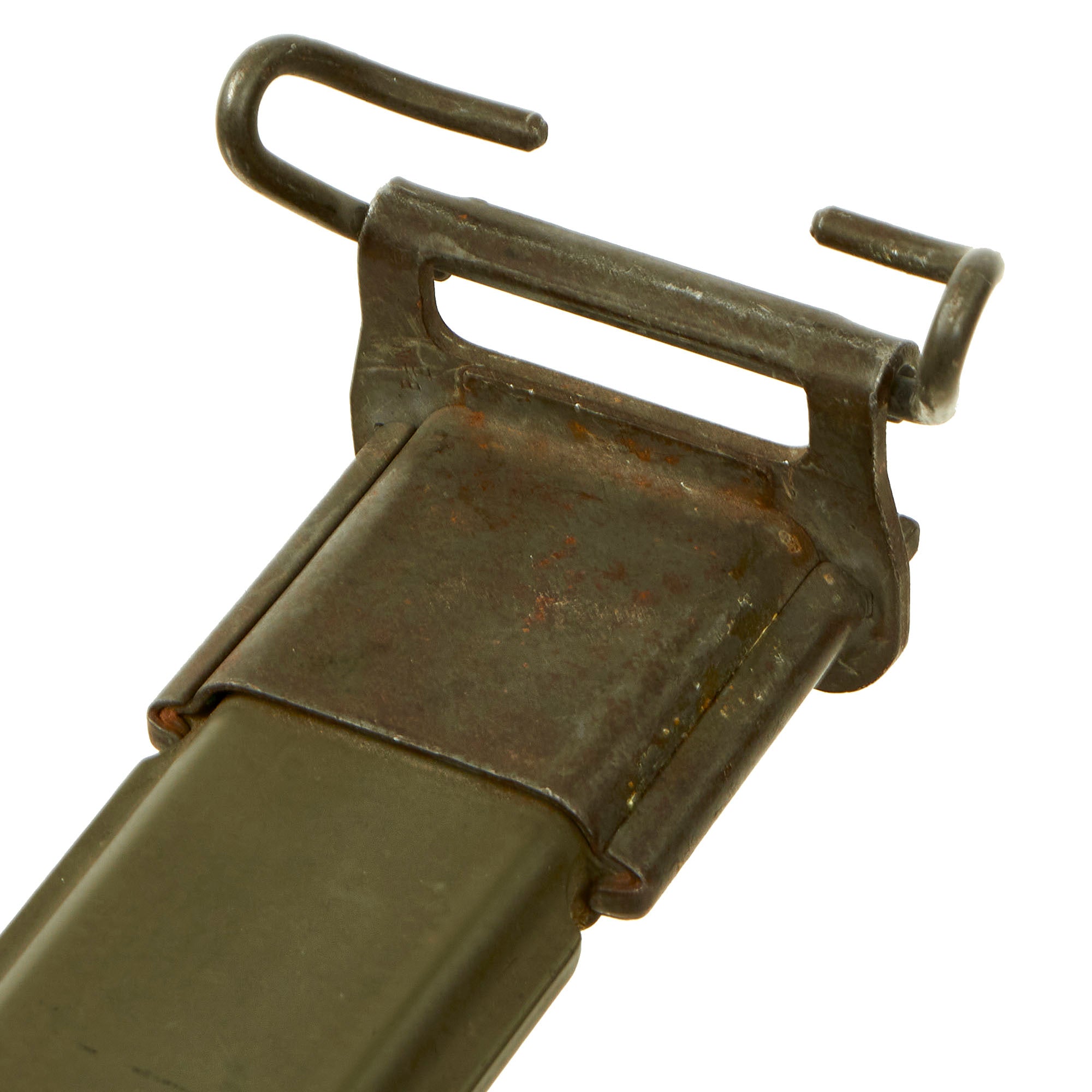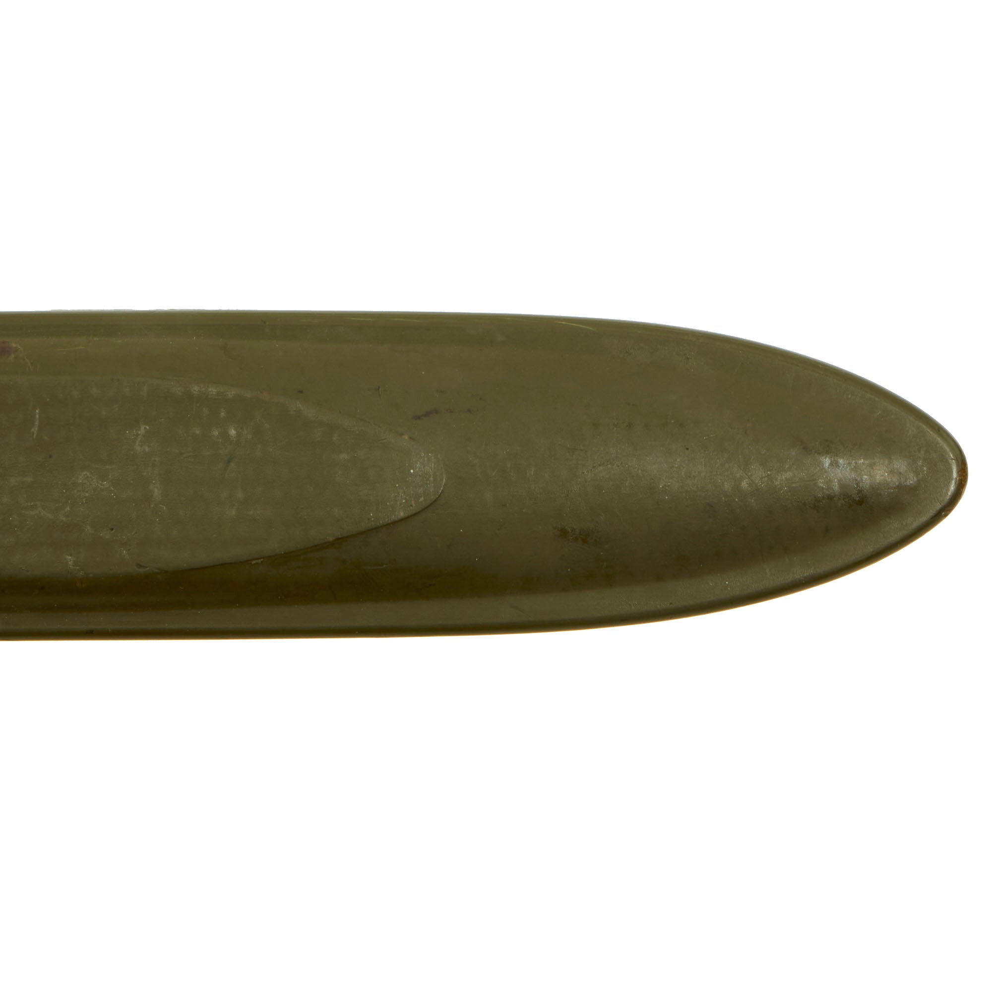 The original M3 scabbard is marked U.S. on the oxidized steel throat over the "Flaming Bomb". The B N marking on the underside of the metal throat lip indicates manufacture by Beckwith Manufacturing, who produced a variety of thermoplastic impregnated cotton fabric scabbards during the war. The N is for New England Pressed Steel, who made the steel throats under contract with Beckwith. The scabbard body is in great shape, with an almost fully intact original finish, and just some light scuffs.