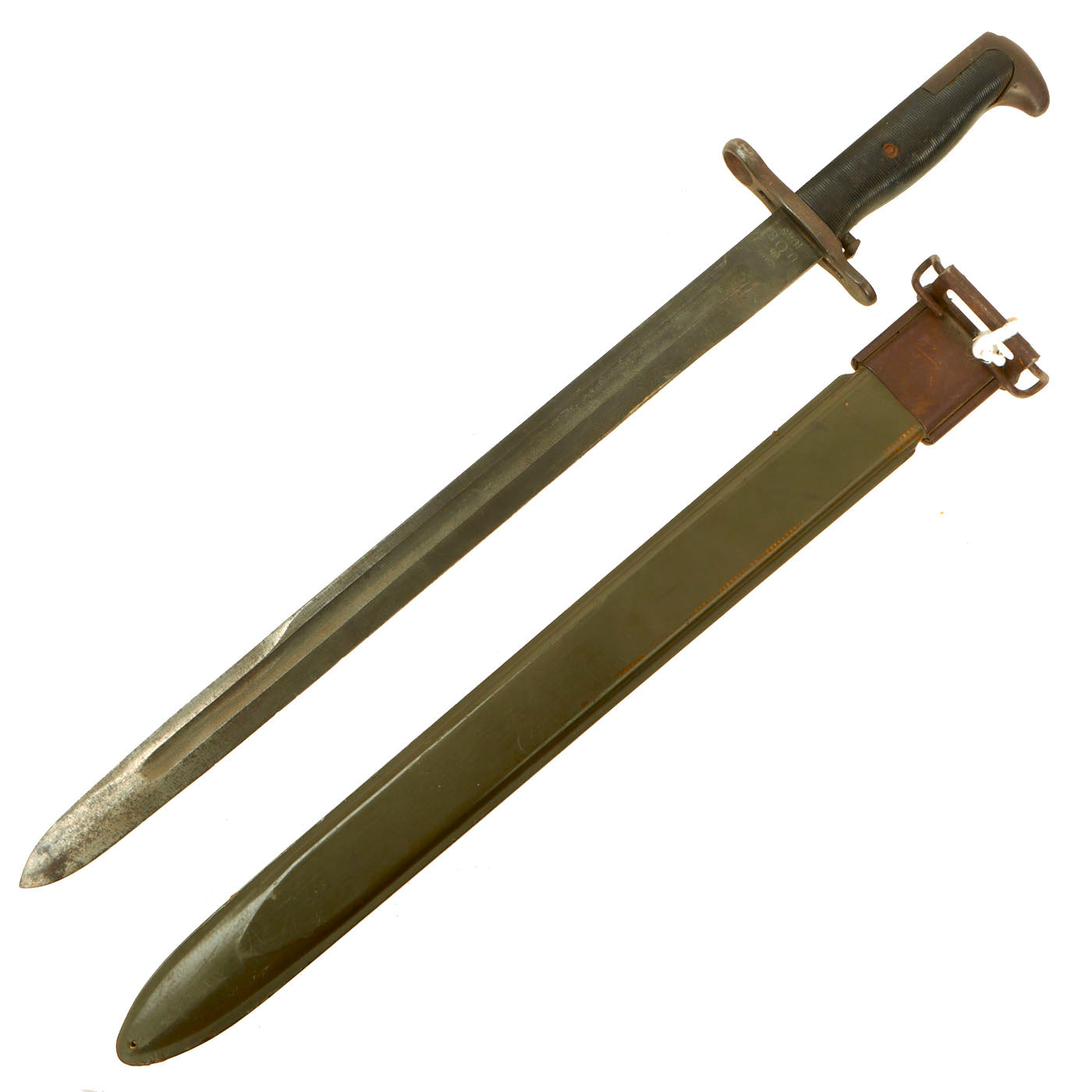 Original Item: Only One Available. This is a very nice condition U.S. M1942 bayonet for the M1 Garand Rifle, complete with the correct WWII Issue M3 scabbard. Technically, this bayonet is considered an M1905 bayonet by the U.S. Army, manufactured in 1942 with plastic ribbed grips. The M1 Garand rifle was designed to take the same blade bayonet as the M1903 Springfield rifle, so at the beginning of the war they were issued with bayonets originally made for those rifles. To keep up with Wartime production, new orders were placed for a version of the M1905 bayonet with plastic grips, and collectors use the designation M1942 for these bayonets, made from 1942 to 1943. Six civilian firms produced 1,540,578 M1905 bayonets from April 1942 to May 1943.