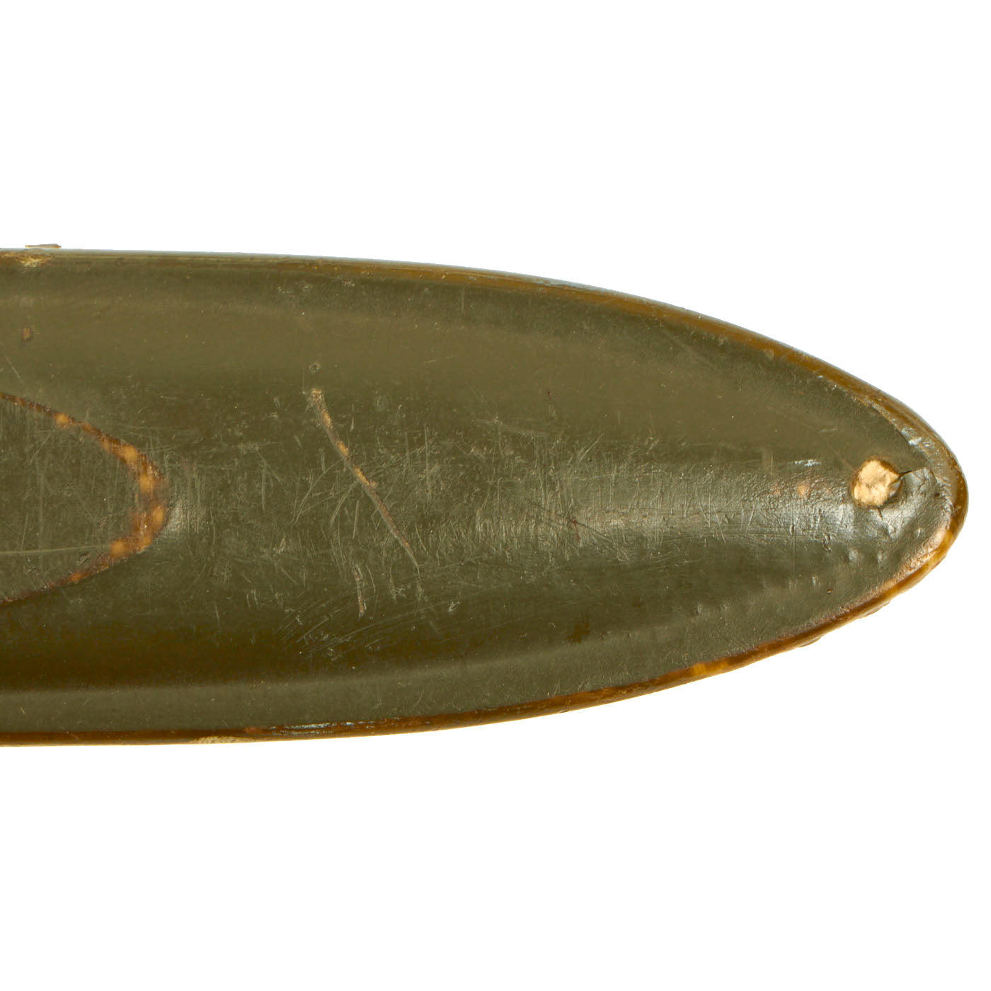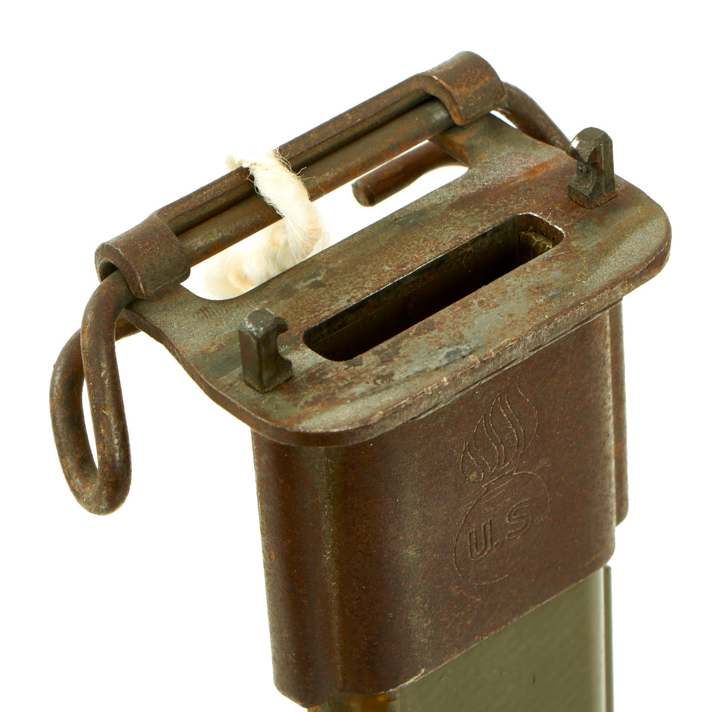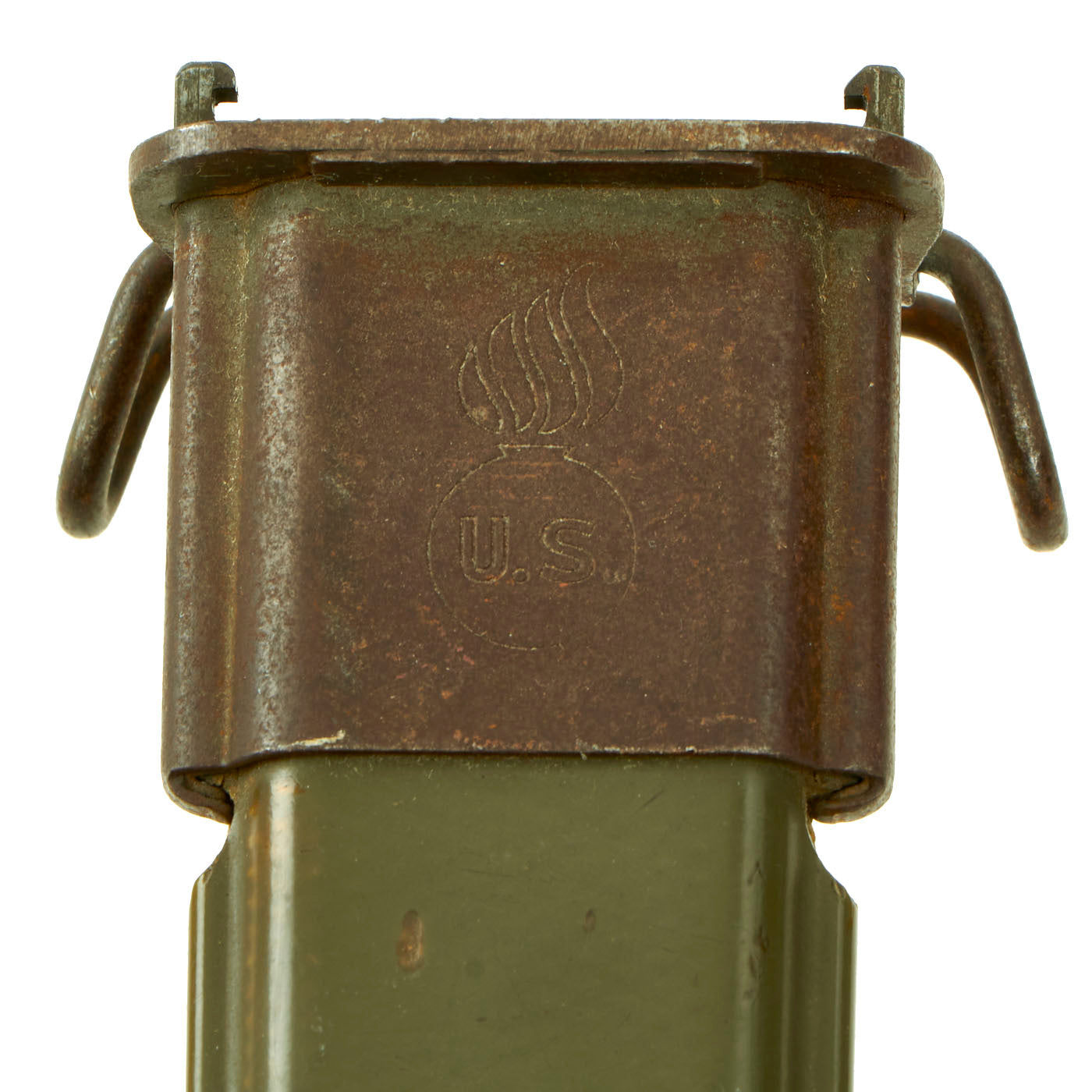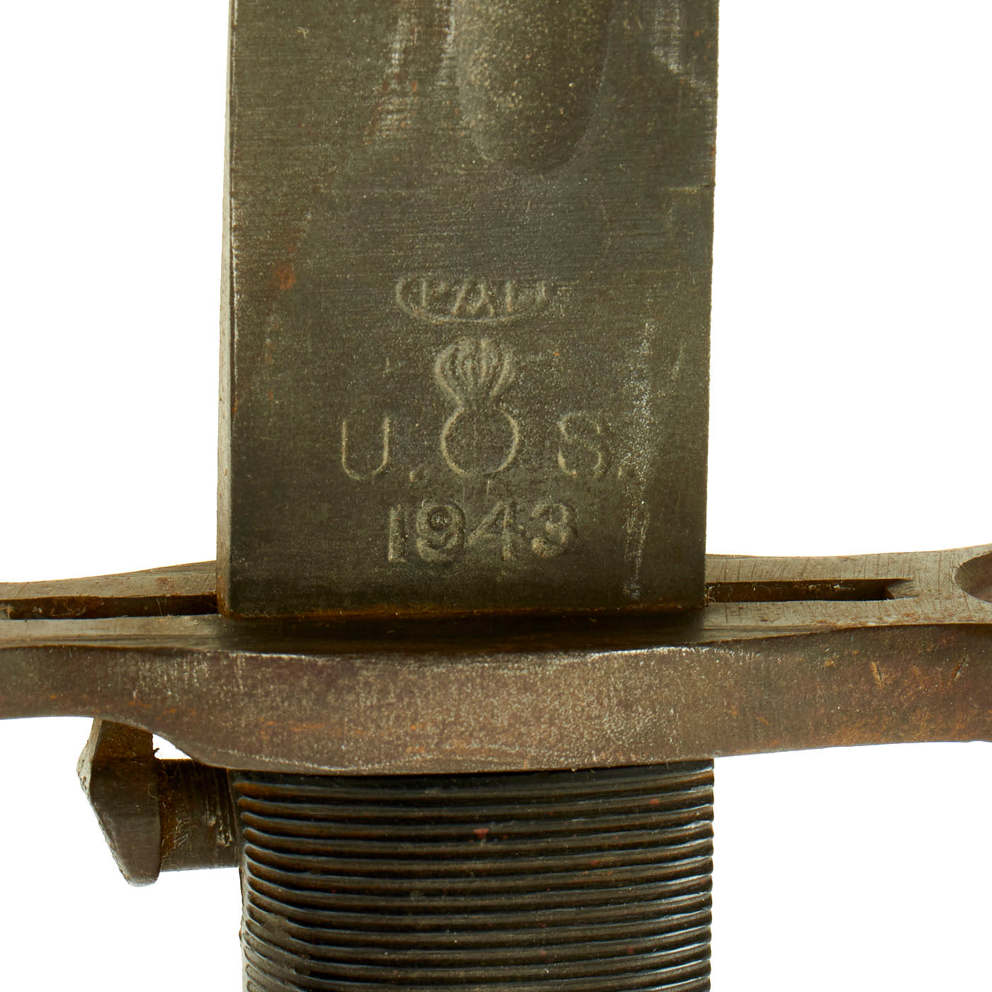 The original M3 scabbard is marked U.S. on the parkerized steel throat over the "Flaming Bomb", and is in very good condition with minor surface oxidation. The B N marking on the underside of the metal throat lip indicates manufacture by Beckwith Manufacturing, who produced a variety of thermoplastic impregnated cotton fabric scabbards during the war. The N is for New England Pressed Steel, who made the steel throats under contract with Beckwith. The scabbard is in good condition.