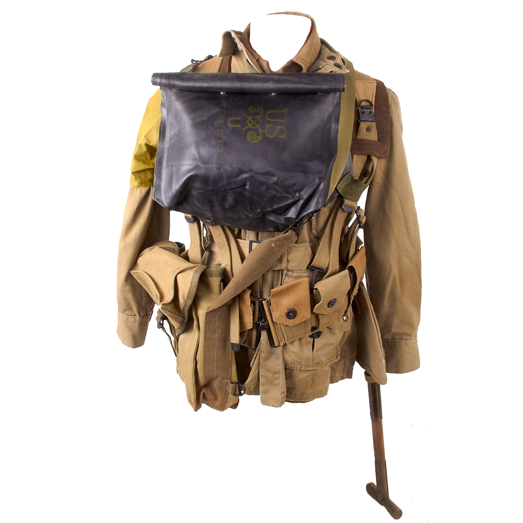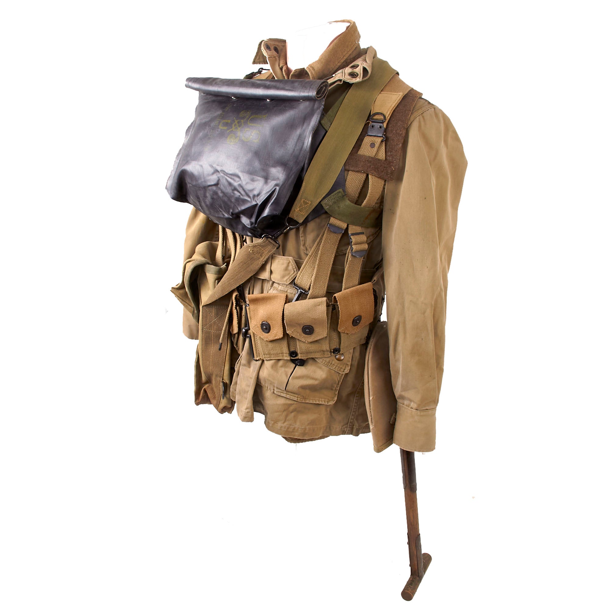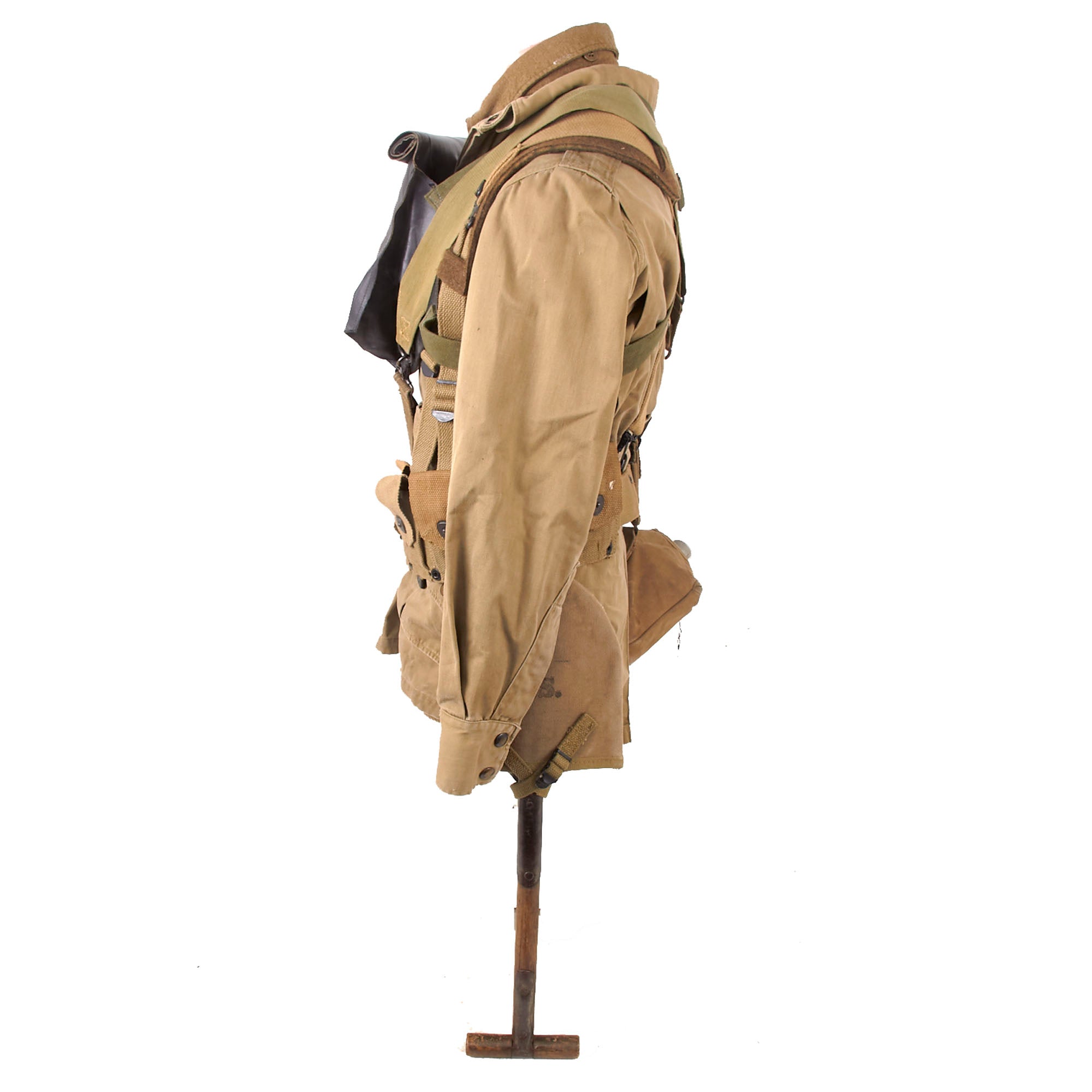 Original Items. Only One Group Available. This is a lovely M1942 Paratrooper Jump Jacket which comes with an original gas detection brassard attached, along with a mix of original and reproduction items to make for a fantastic mannequin display. The M1 D-Bale helmet, Suspender pads, and Paratrooper medical bandage packet are reproduction.