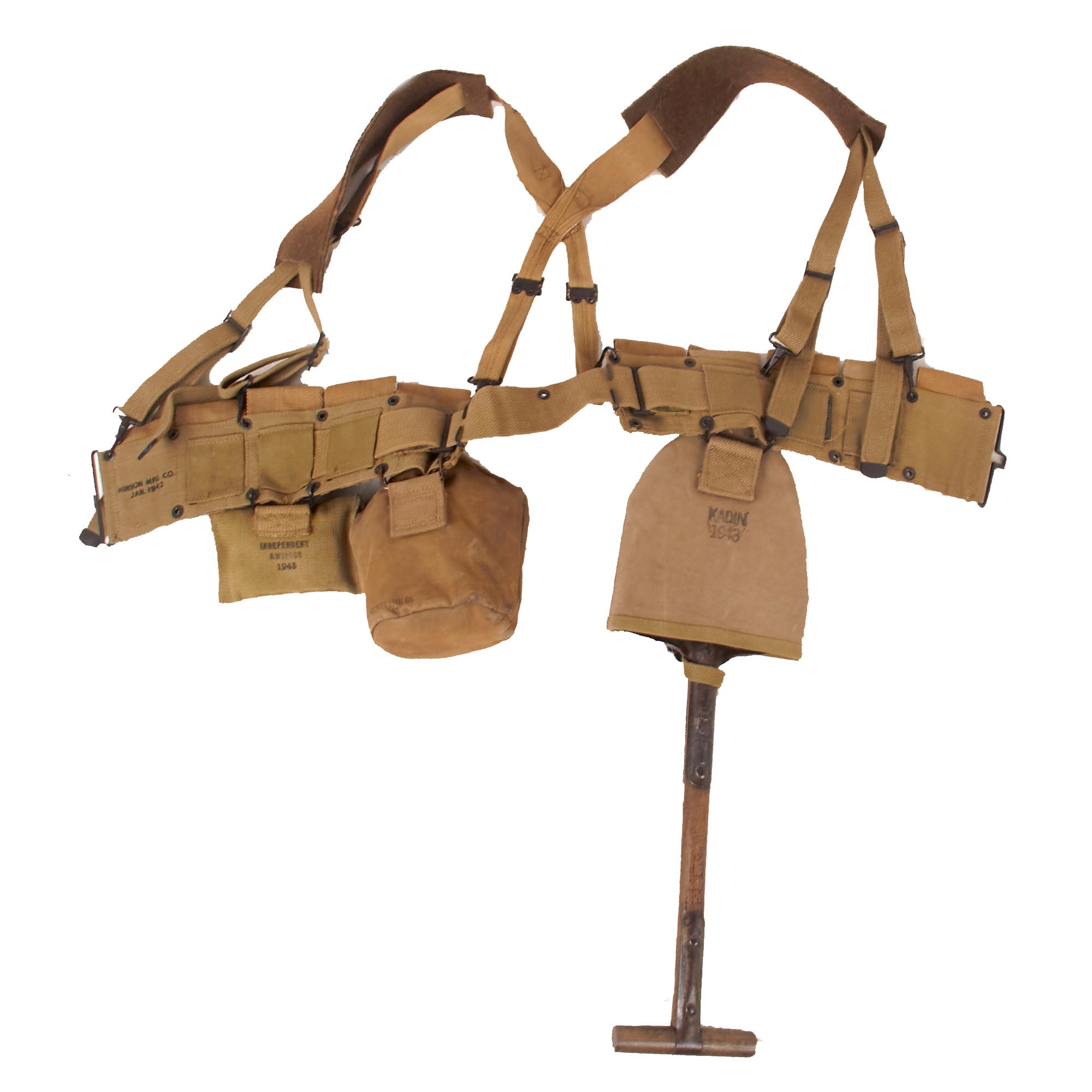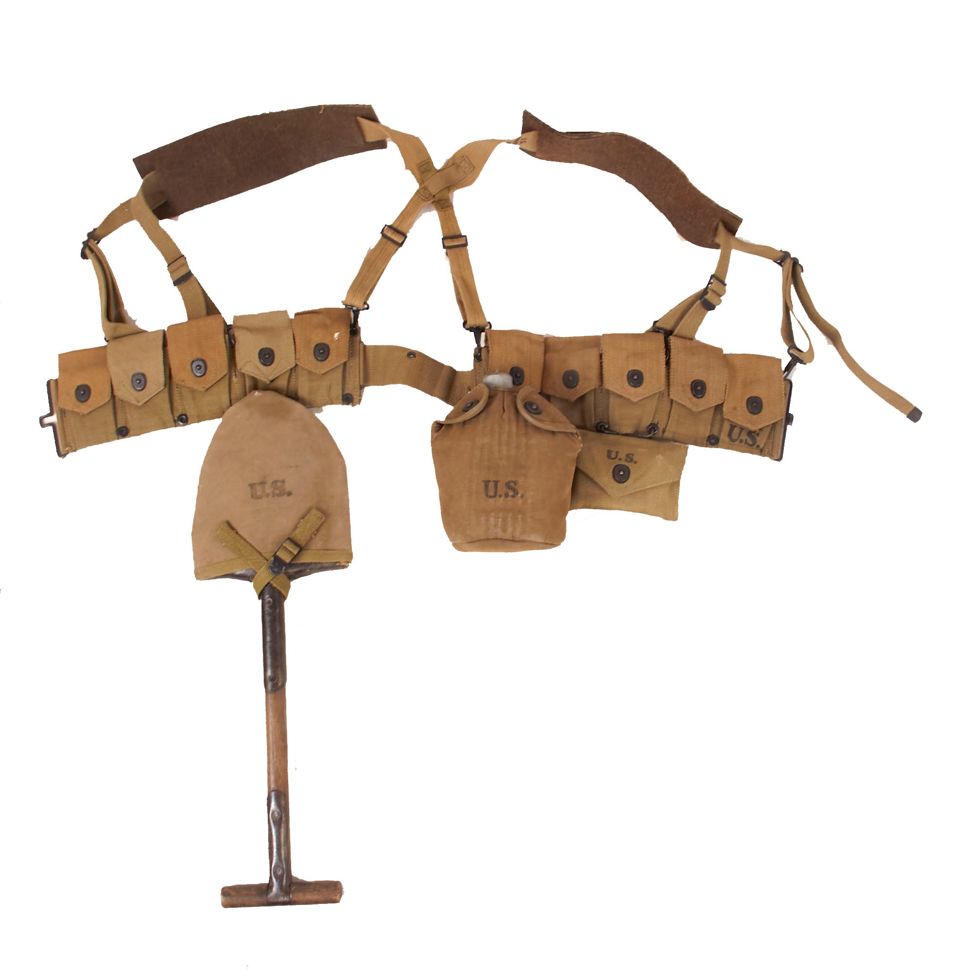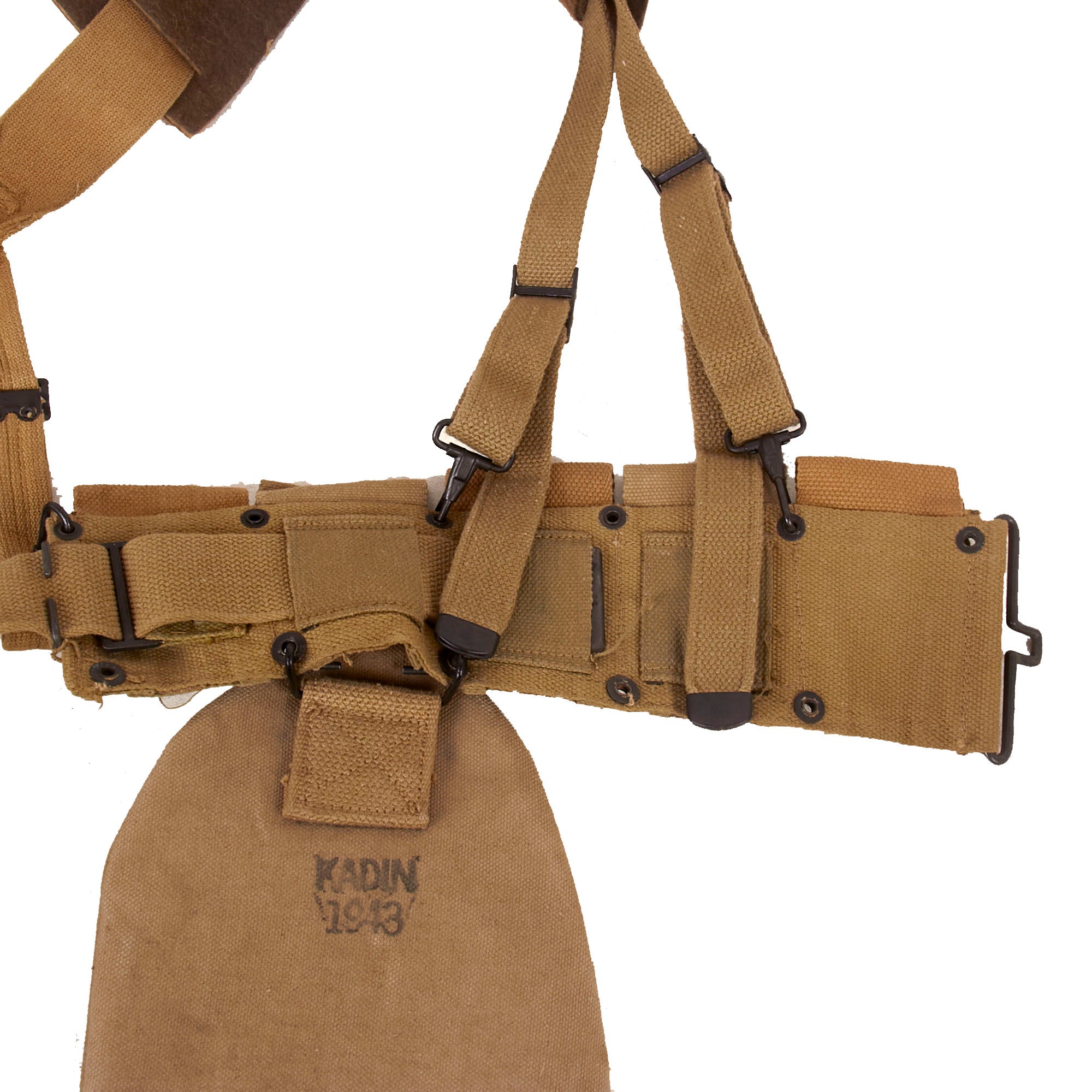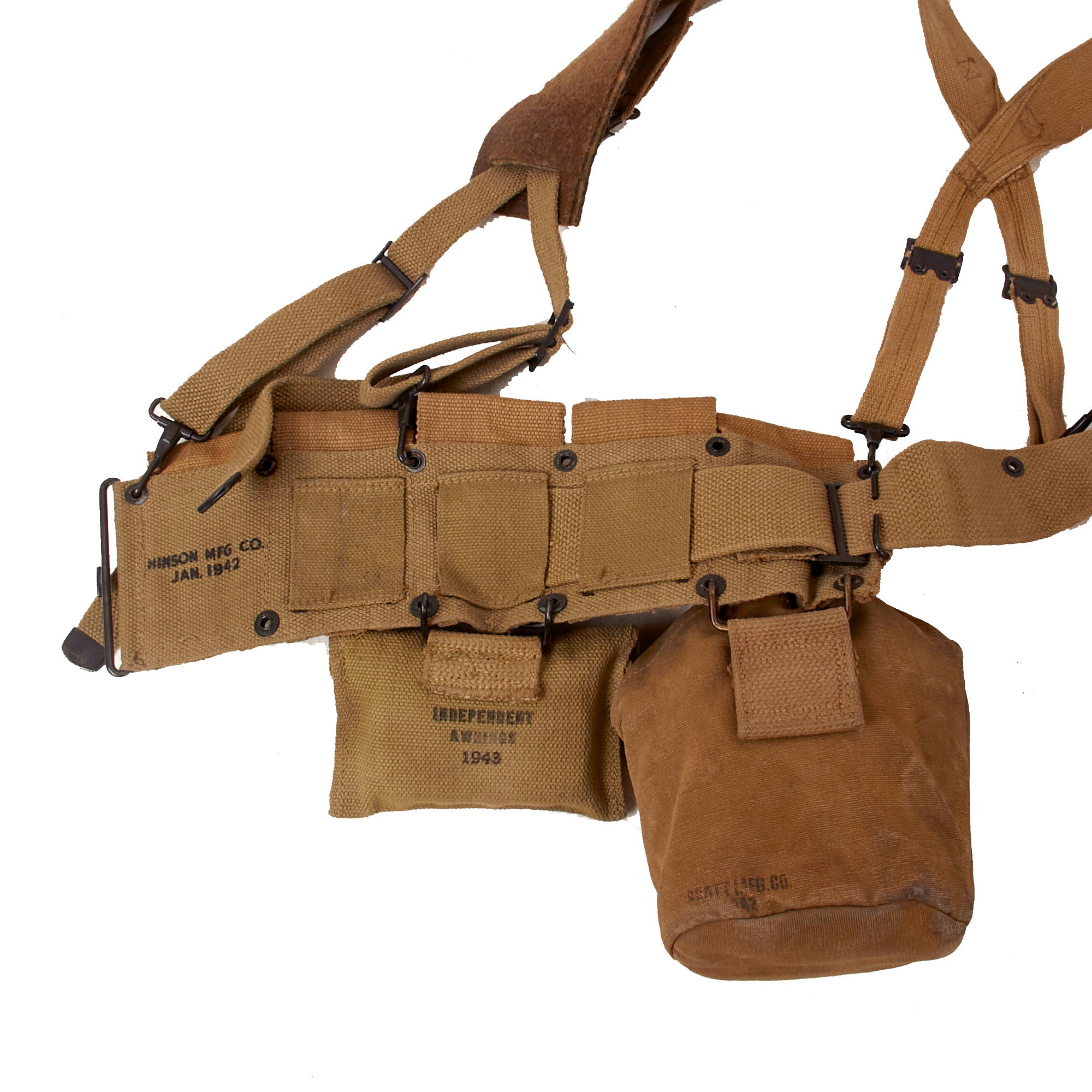 - Original U.S. WWII Belt Rig with M-1923 Cartridge belt by Hinson Mfg. Co. dated January 1942, M-1910 Entrenching tool with 1943 Dated cover by KADIN, M1910 Canteen with 1942-dated cover, and a first aid packet marked Independent Awnings dated 1943 with a Carlisle bandage inside. The rig also has suspenders with padding, but the padding is reproduction. We believe the suspenders themselves to be original.