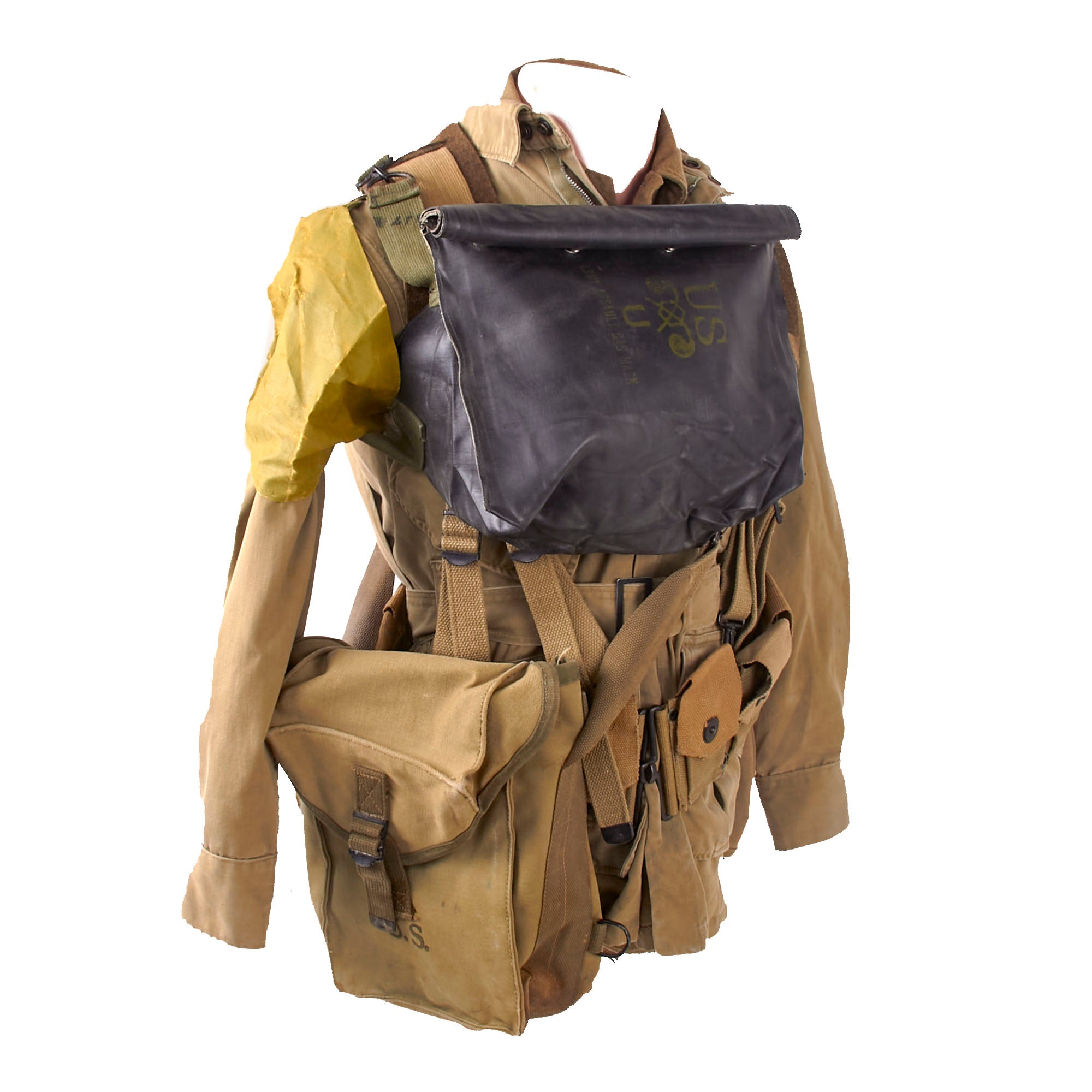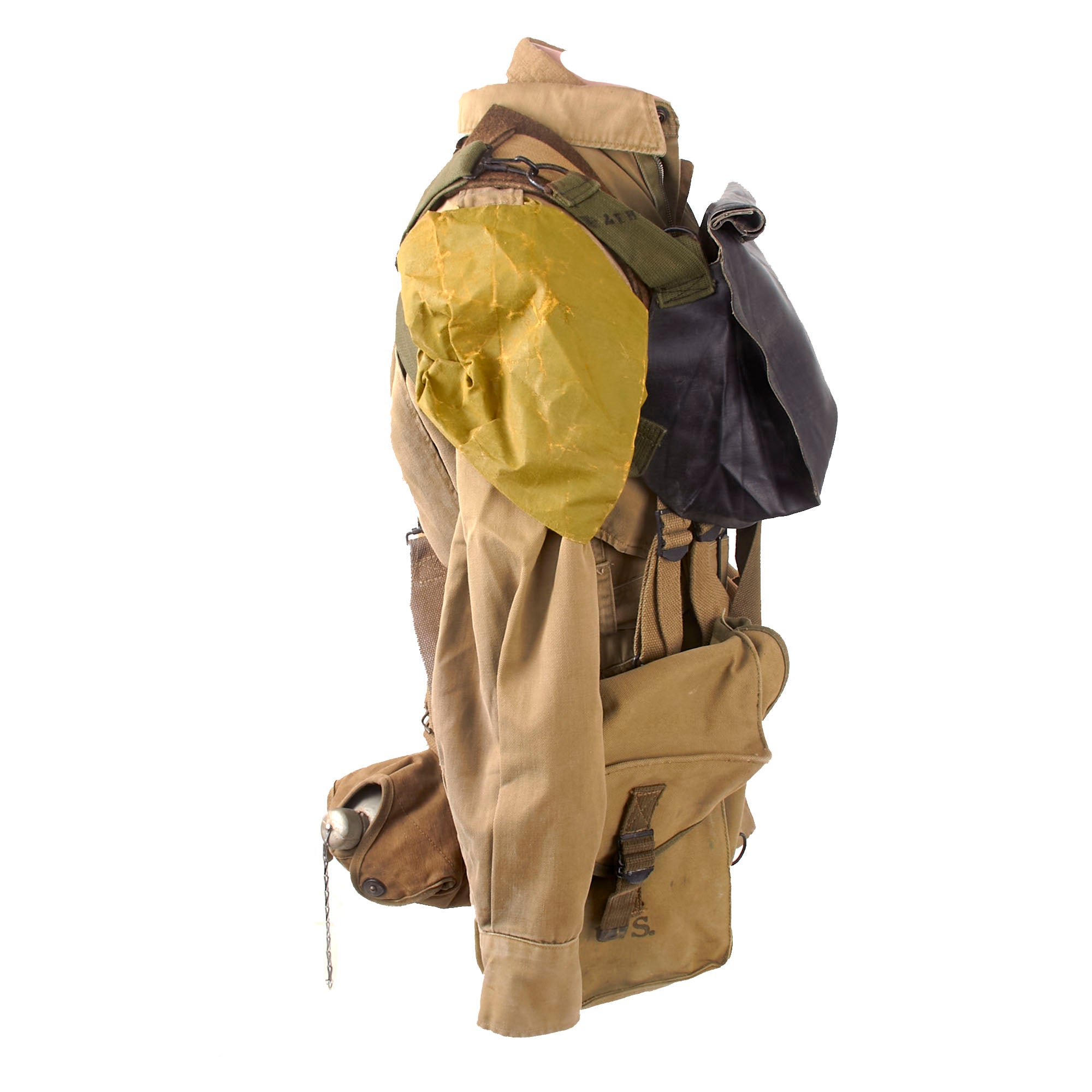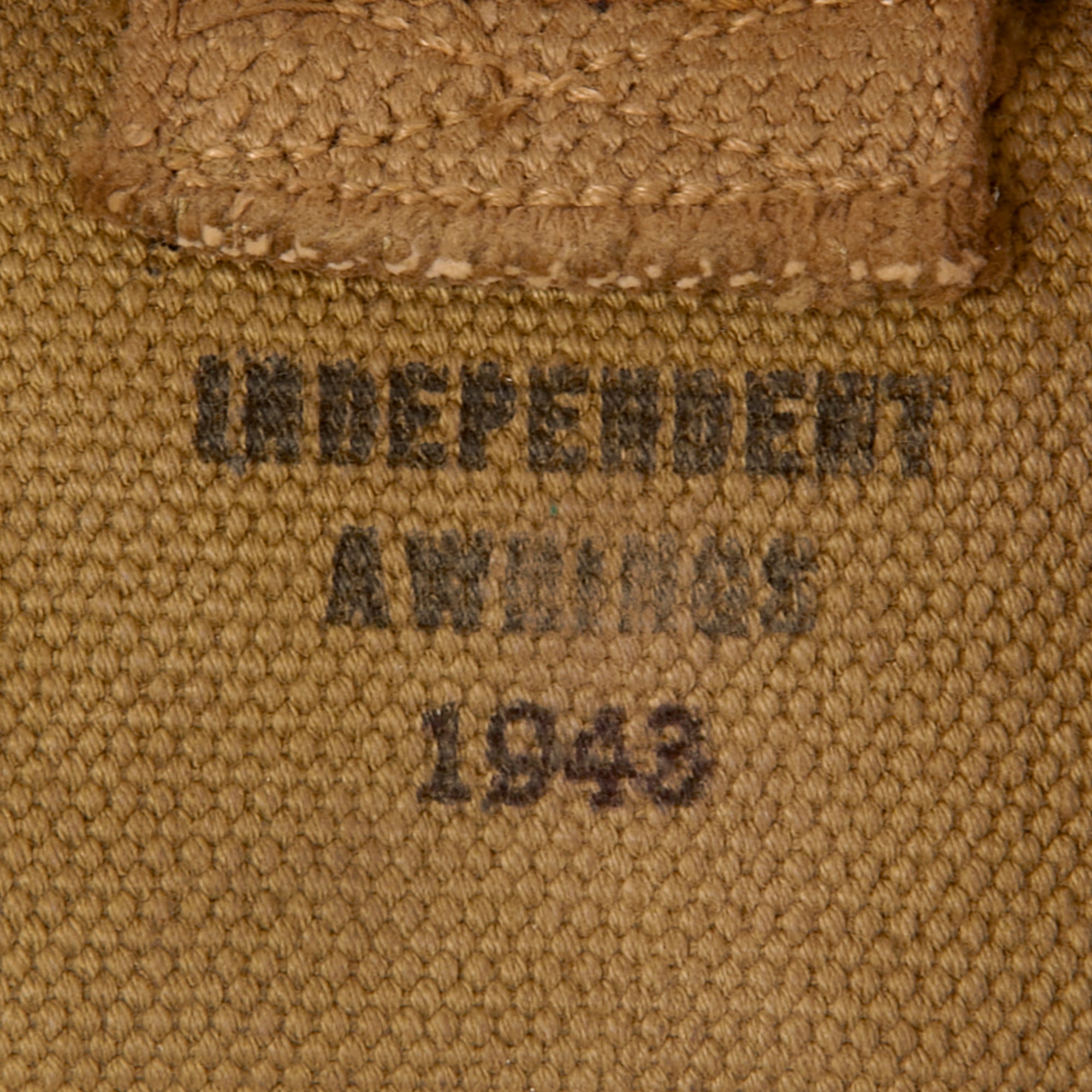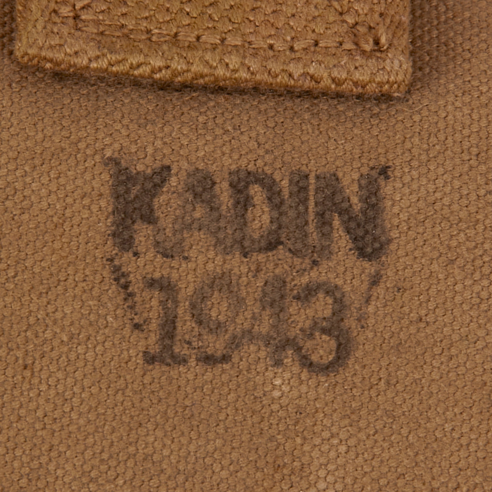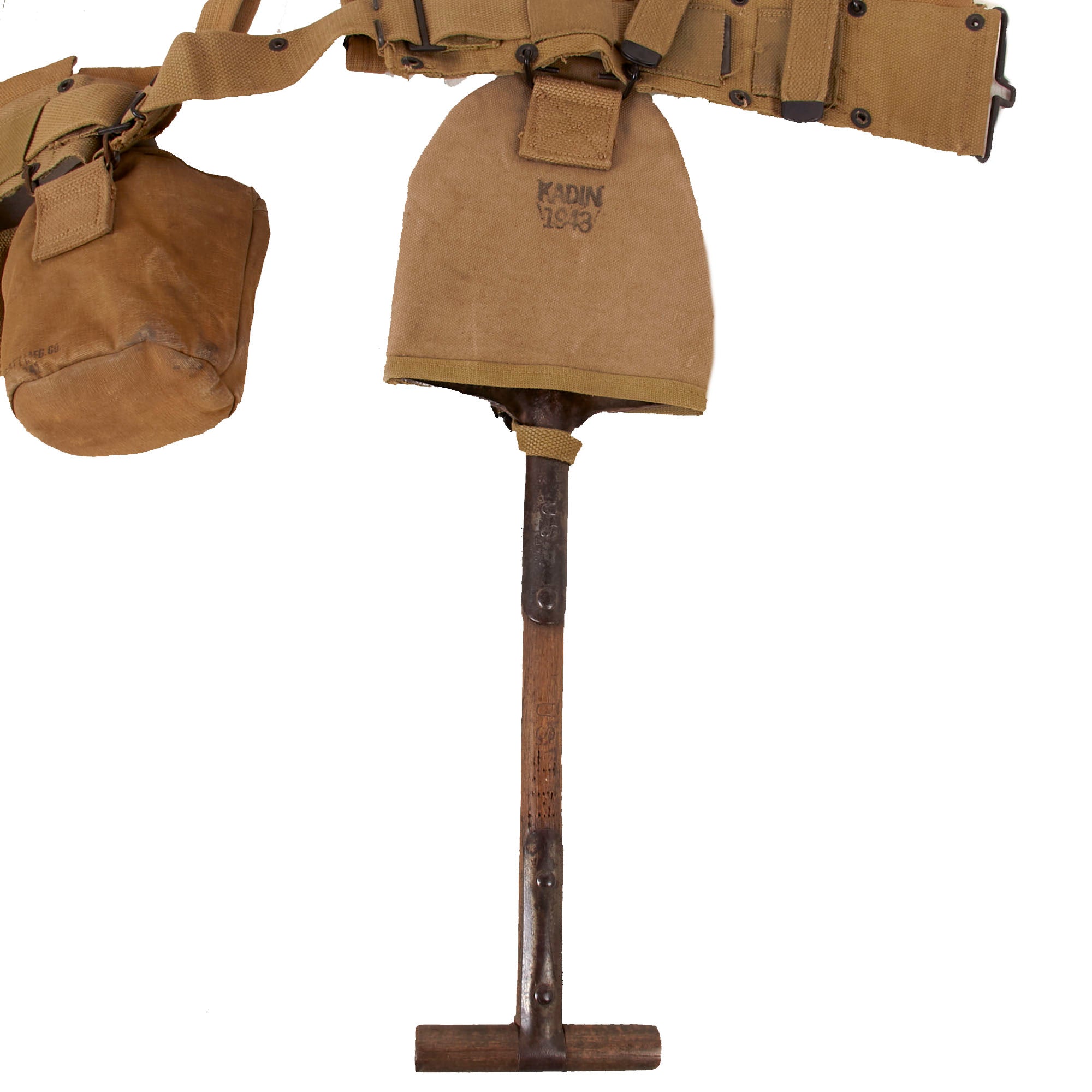 - Original U.S. WWII Belt Rig with M-1923 Cartridge belt by Hinson Mfg. Co. dated January 1942, M-1910 Entrenching tool with 1943 Dated cover by KADIN, M1910 Canteen with 1942-dated cover, and a first aid packet marked Independent Awnings dated 1943 with a Carlisle bandage inside. The rig also has suspenders with padding, but the padding is reproduction. We believe the suspenders themselves to be original.