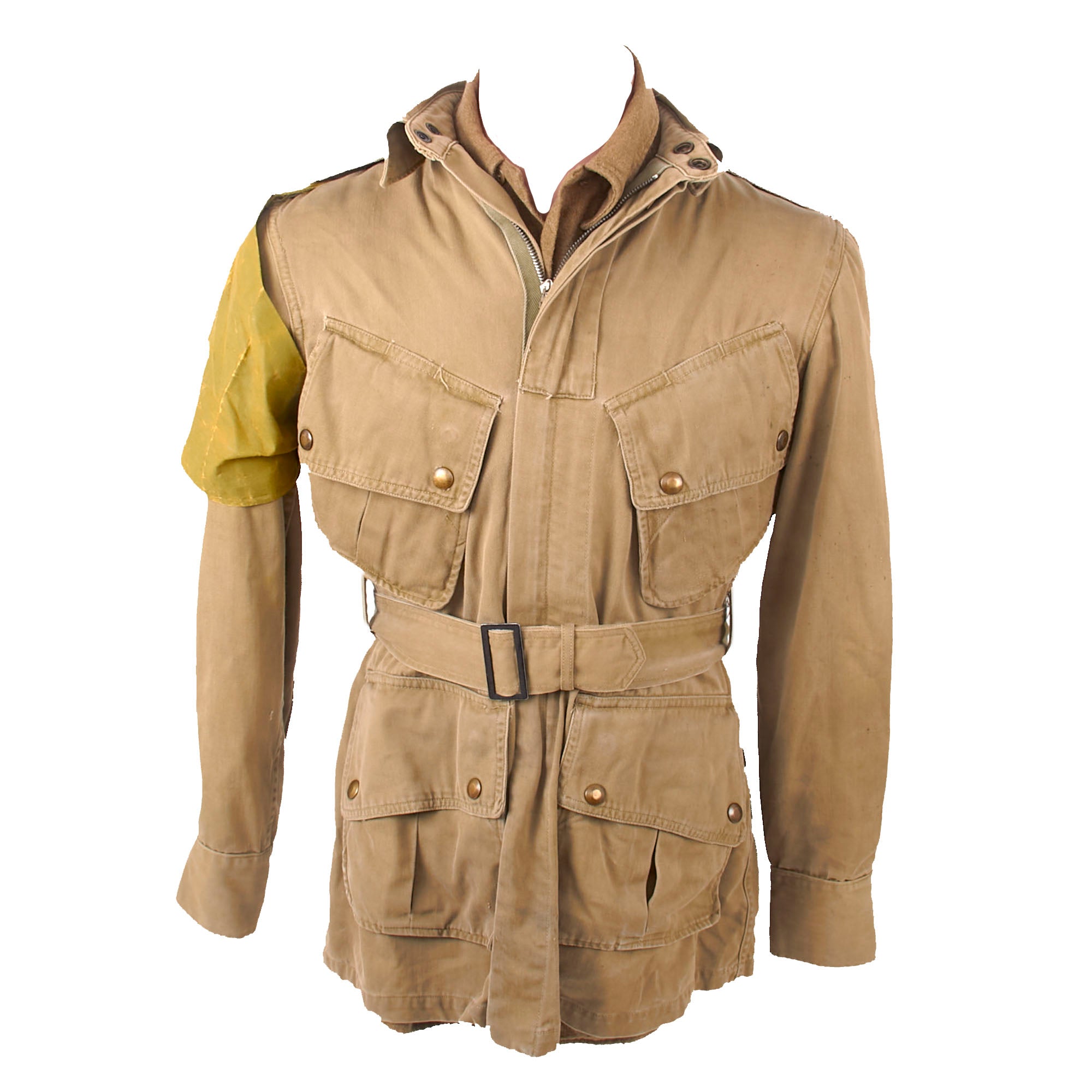 - Original WWII M1942 Paratrooper Jump Jacket without Reinforcements with period Paratrooper Gas Detection Brassard attached. There are no markings or tags in the jacket we could find, which would indicate actual field use. Zipper is a replacement but is Crown marked which is fully functional and might be a period replacement, yet the stitching is excellent and the wear is consistent with the rest of the jacket, so if it is a replacement it is not a modern one.