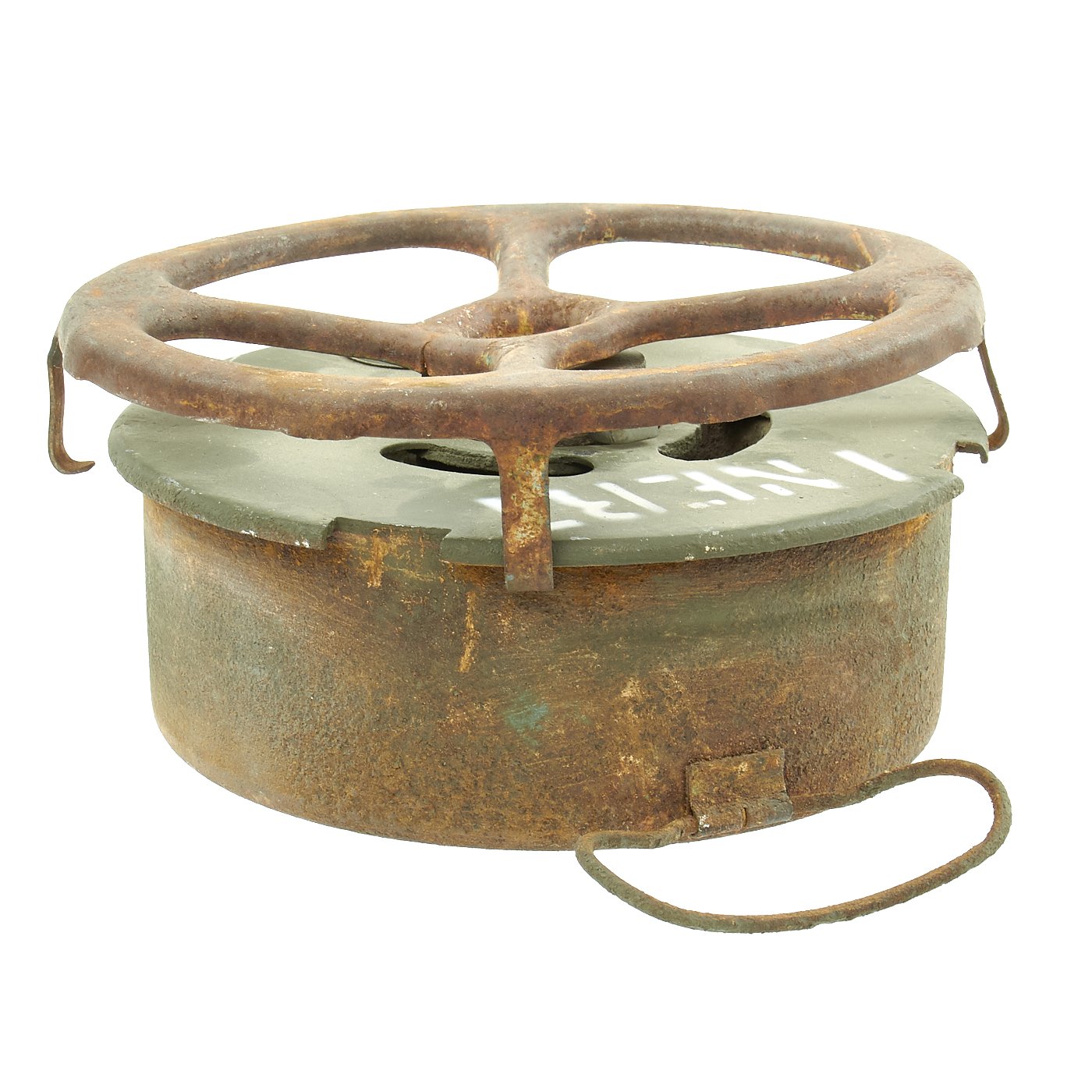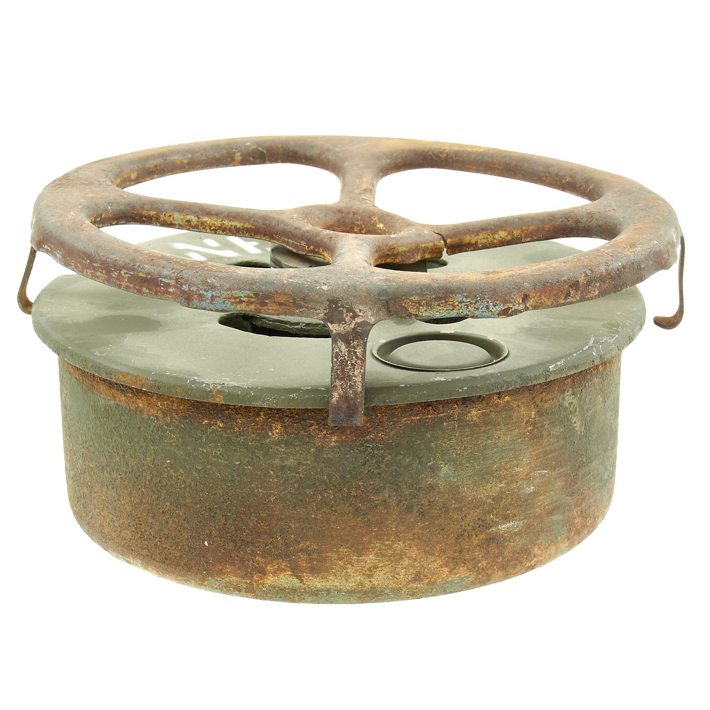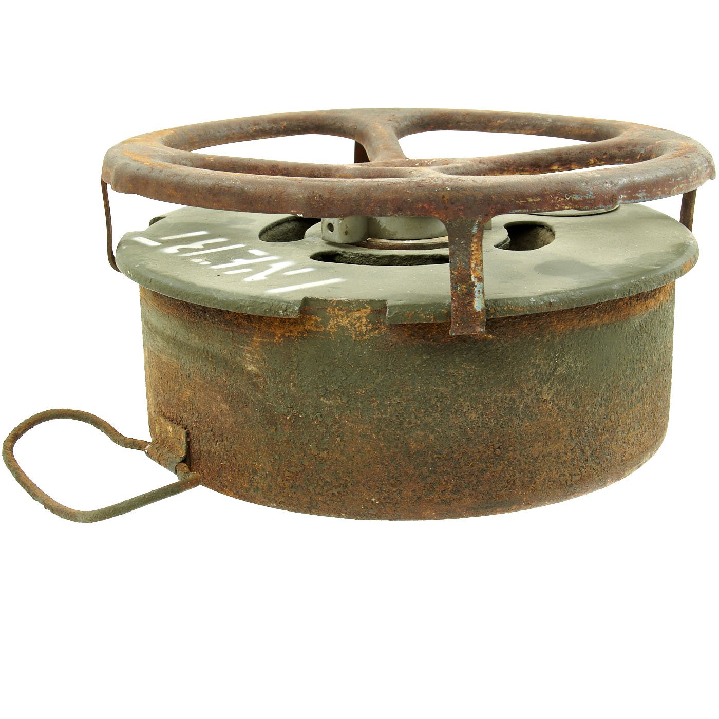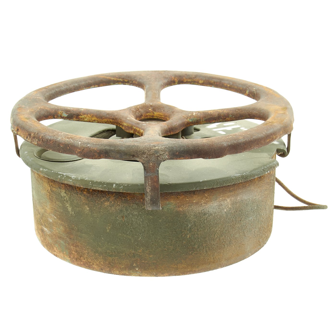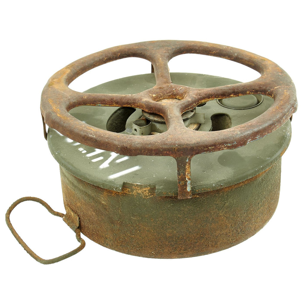 Original Item: Only One Available. During WWII the United States developed and used several versions of Anti-Tank mine, starting with the M1, followed by the M1A1 and finally the M4. They all had the same basic design of a "spider" on the top of the mine being used to actuate a fuse in the center of the mine when it was subjected to enough pressure. The M1 Had two locations where it was filled with explosives, and utilized a Spider made of multiple pieces of bent steel welded together. The later M1A1 only had one explosives filling hole, as well as a simpler design stamped steel spider that required less machine time. The more advanced M4 mine also featured two secondary fuse locations that could be used to make the mines much harder to remove or defuse.