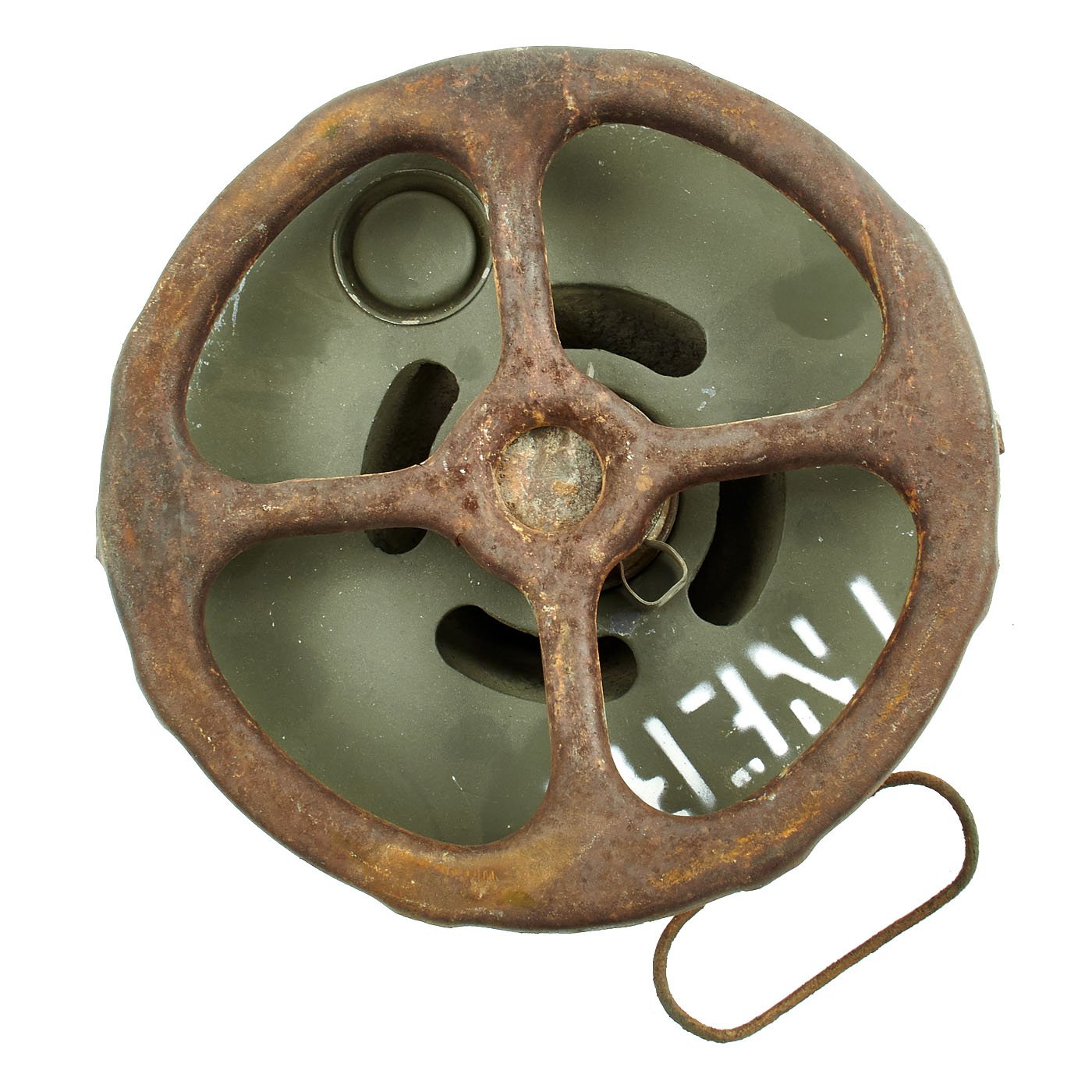 This example still retains the original carry handle, spider, and smoke canister/fuze. It even has the original safety clip still installed on the smoke canister. It did have some rust damage as show, but is still in good condition.