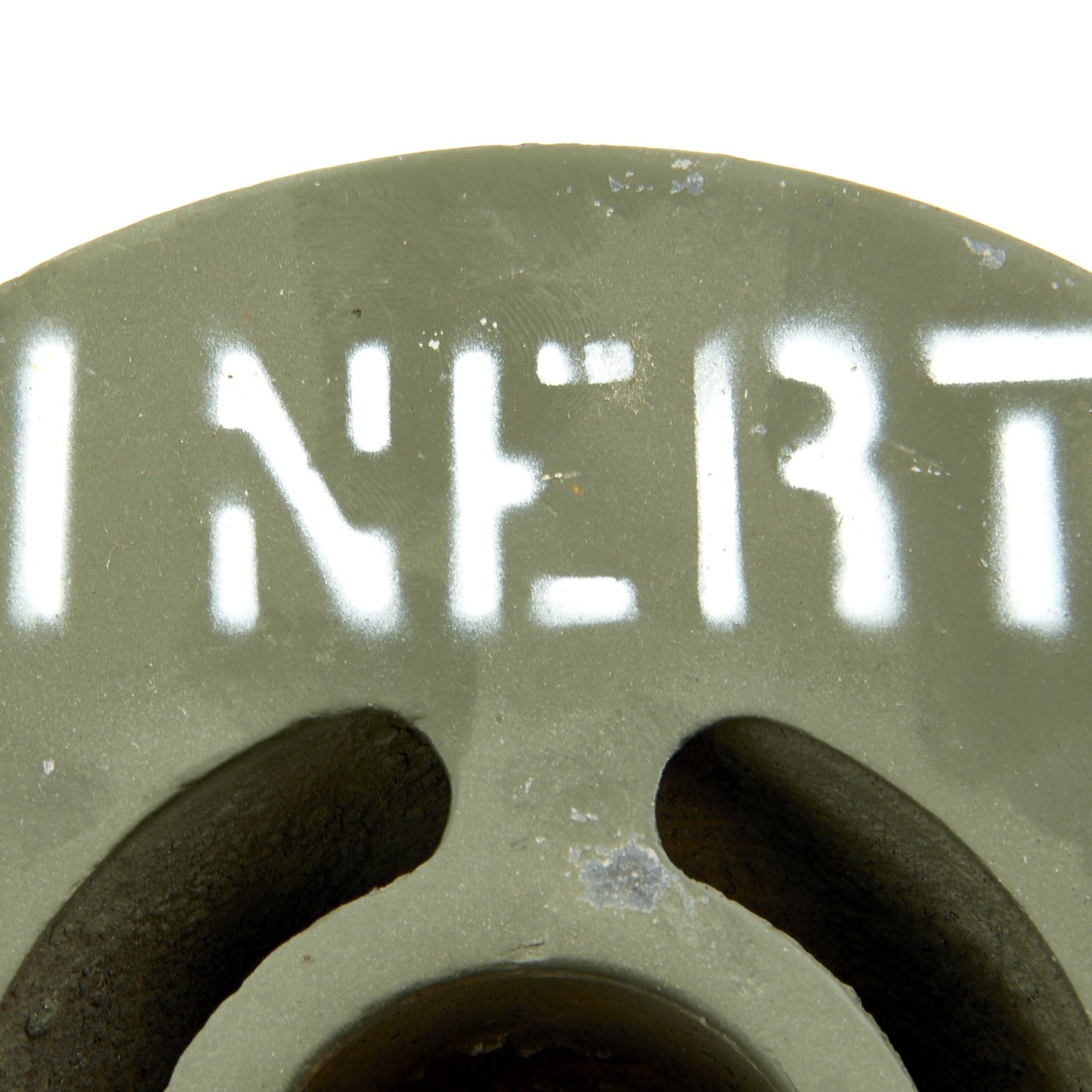 This particular mine is a recovered anti-tank training mine based on the M1A1 mine, known as the M1B1 Practice Training Mine. It was repainted OD green at some point, and stenciled with INERT on the top. The paint on the "spider" and the back is somewhat missing, and there is some rusting, so this definitely saw some time out in the field in rough weather.