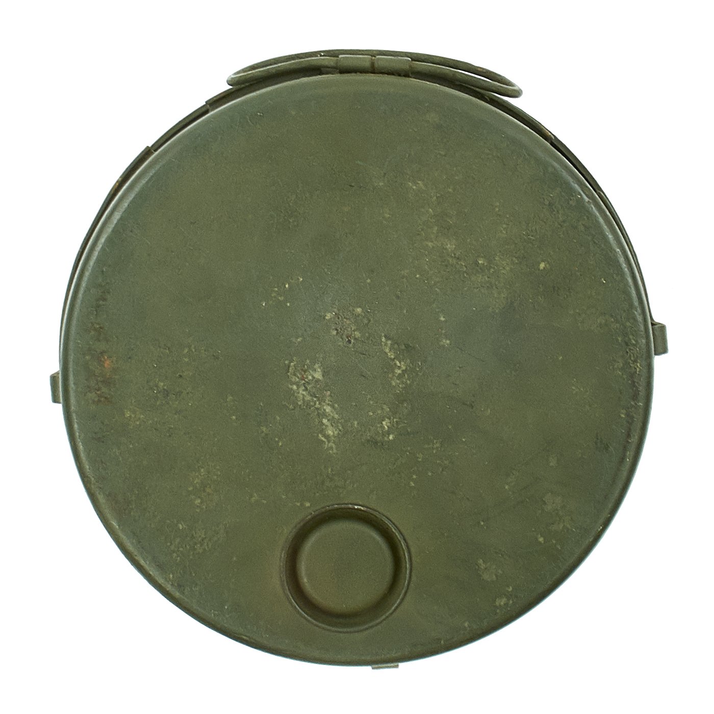This particular mine is a recovered anti-tank training mine based on the M1A1 mine, known as the M1B1 Practice Training Mine. While it has been painted OD green over the original blue color, in the light the original markings can still be seen: