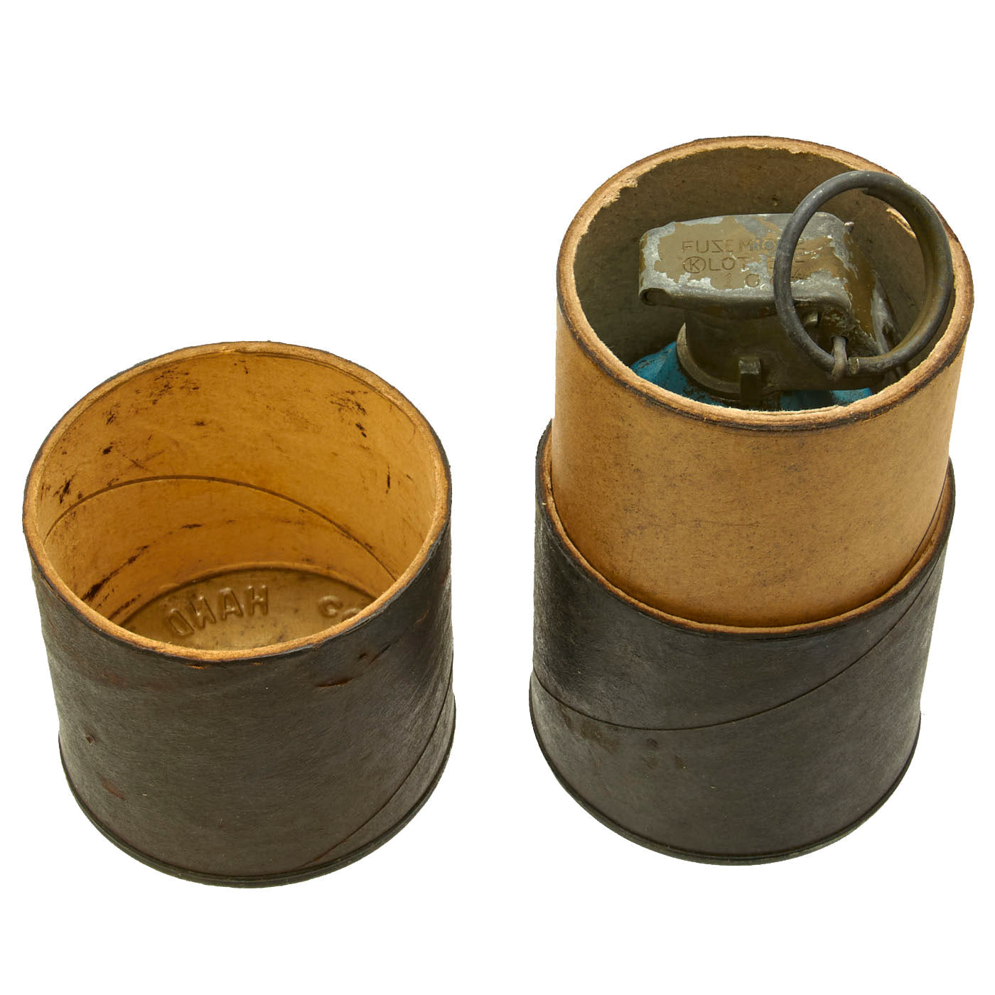 A great example of a U.S. WWII Practice Trainer Grenade, complete with the correct canister. Ready to display!