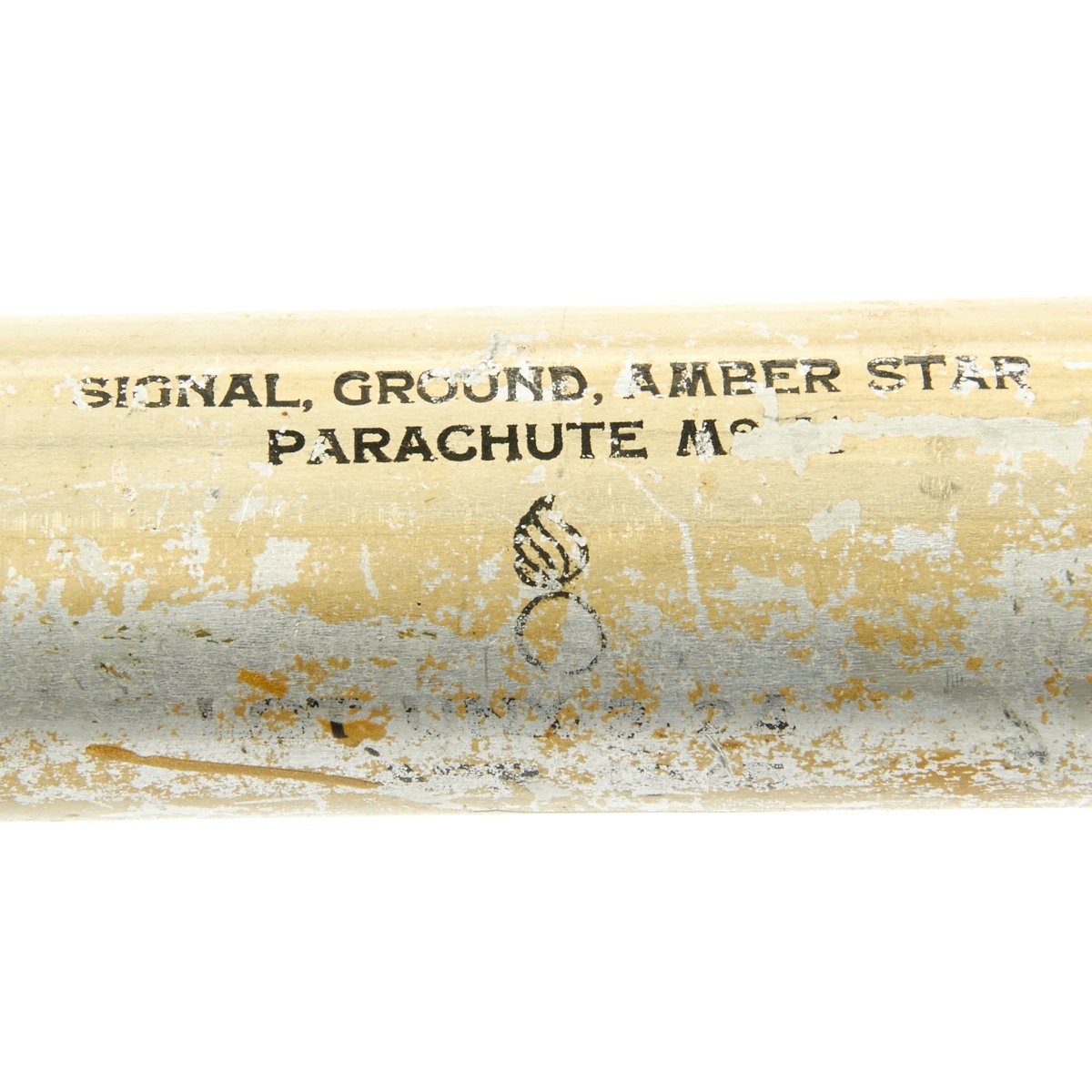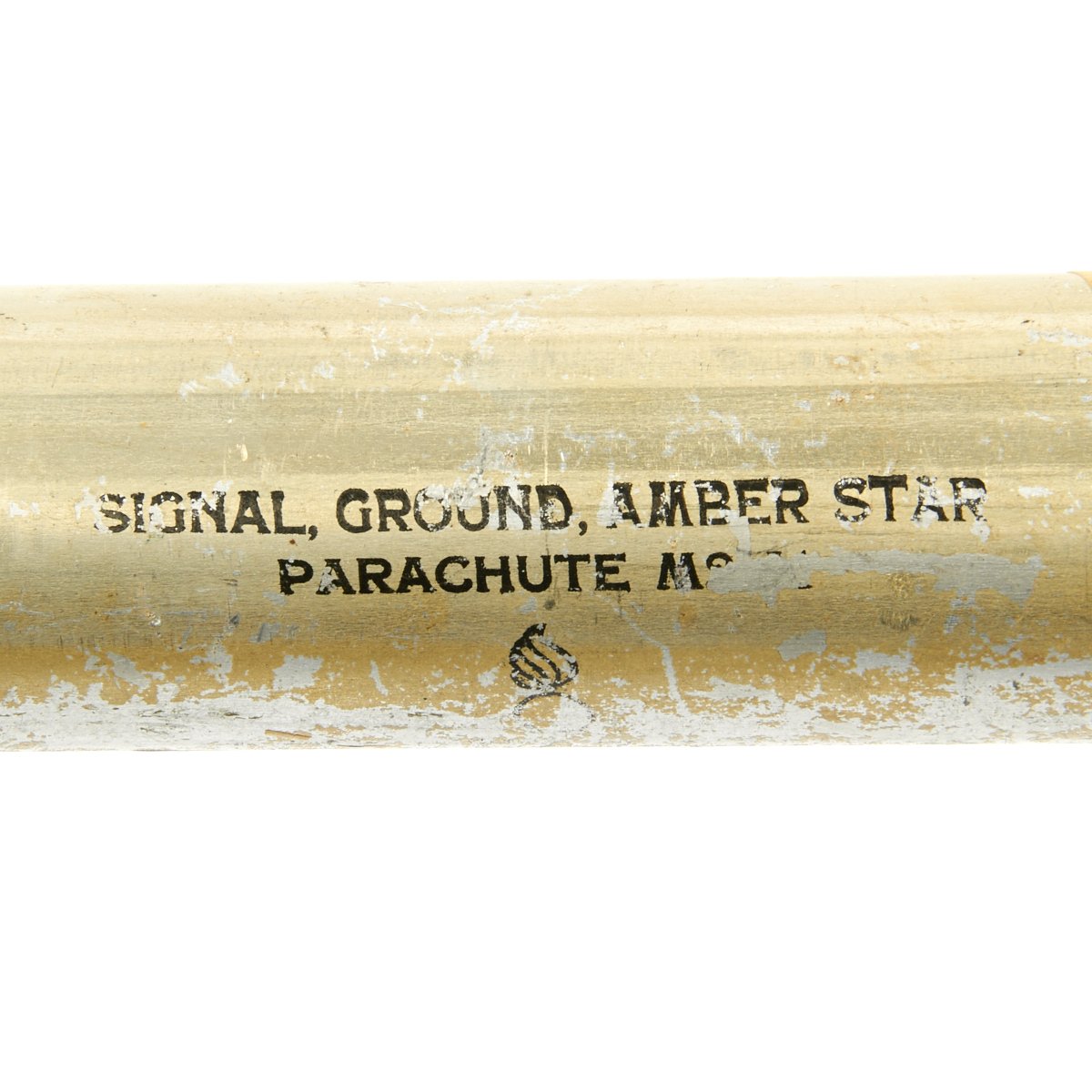 - 1945 dated M21A1 Amber Signal Flares. These are designed to be fired from a M1 rifle, to a height of 200 to 300 meters. The flare will then hang from a small parachute and float to the ground while illuminating a large area. Measures approximately 10" long and 1.7" in diameter.
