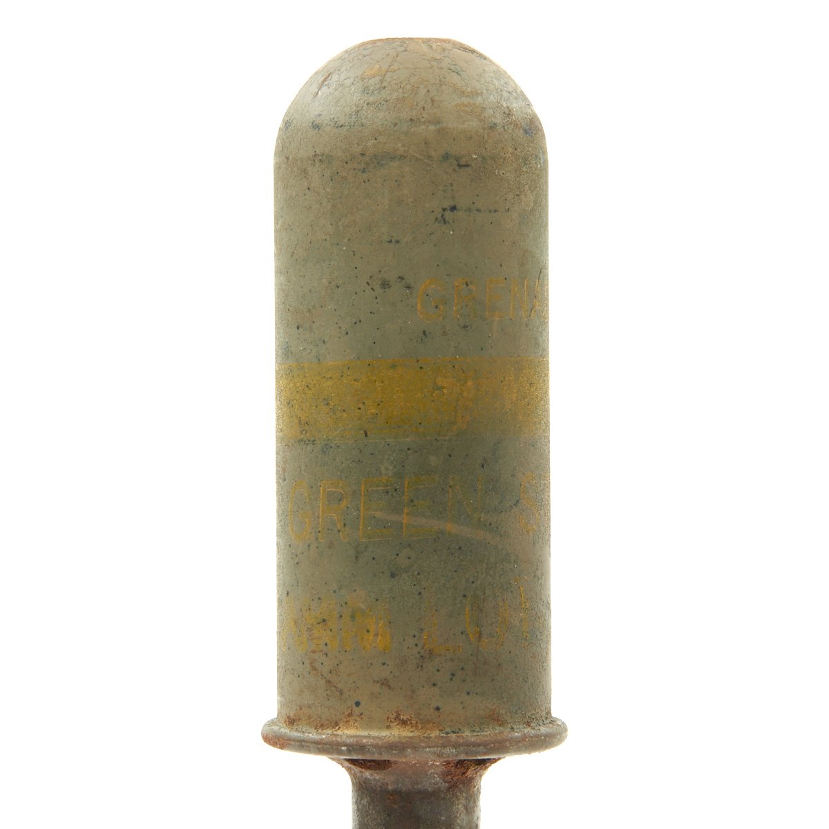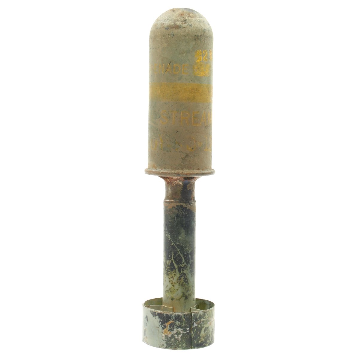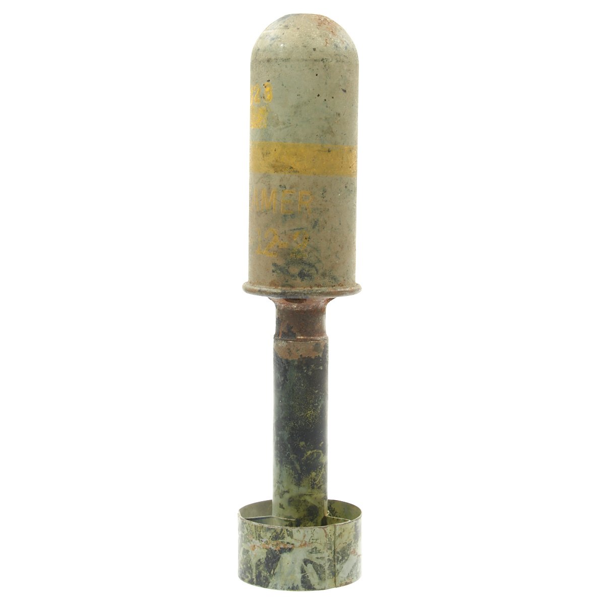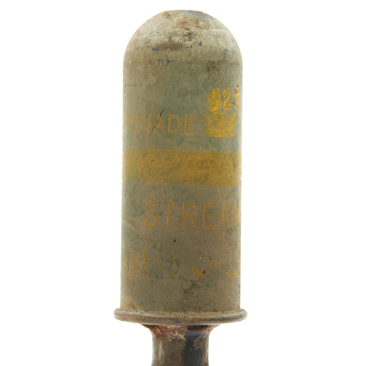- WWII M23 Rifle Green Smoke Streamer Grenade - These grenades are used only for signaling purposes. They produce green, red, violet or yellow smoke streamers. The M23 and M23A1 consist of three basic parts: a steel stabilizer tube assembly, a fuze and a body. The body is filled with a burning type smoke charge which contains a dye to color the smoke. The surfaces of the smoke charge within the body are coated with a starter mixture charge (to facilitate ignition). A small air hole opening in the nose is covered by a piece of tape (to protect the filler against moisture). The tape must be removed prior to firing. Measures approximately 9.5" long and 2" in diameter.